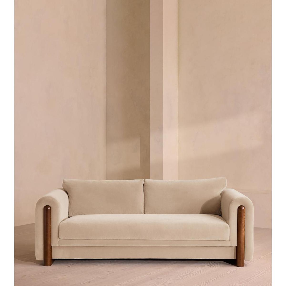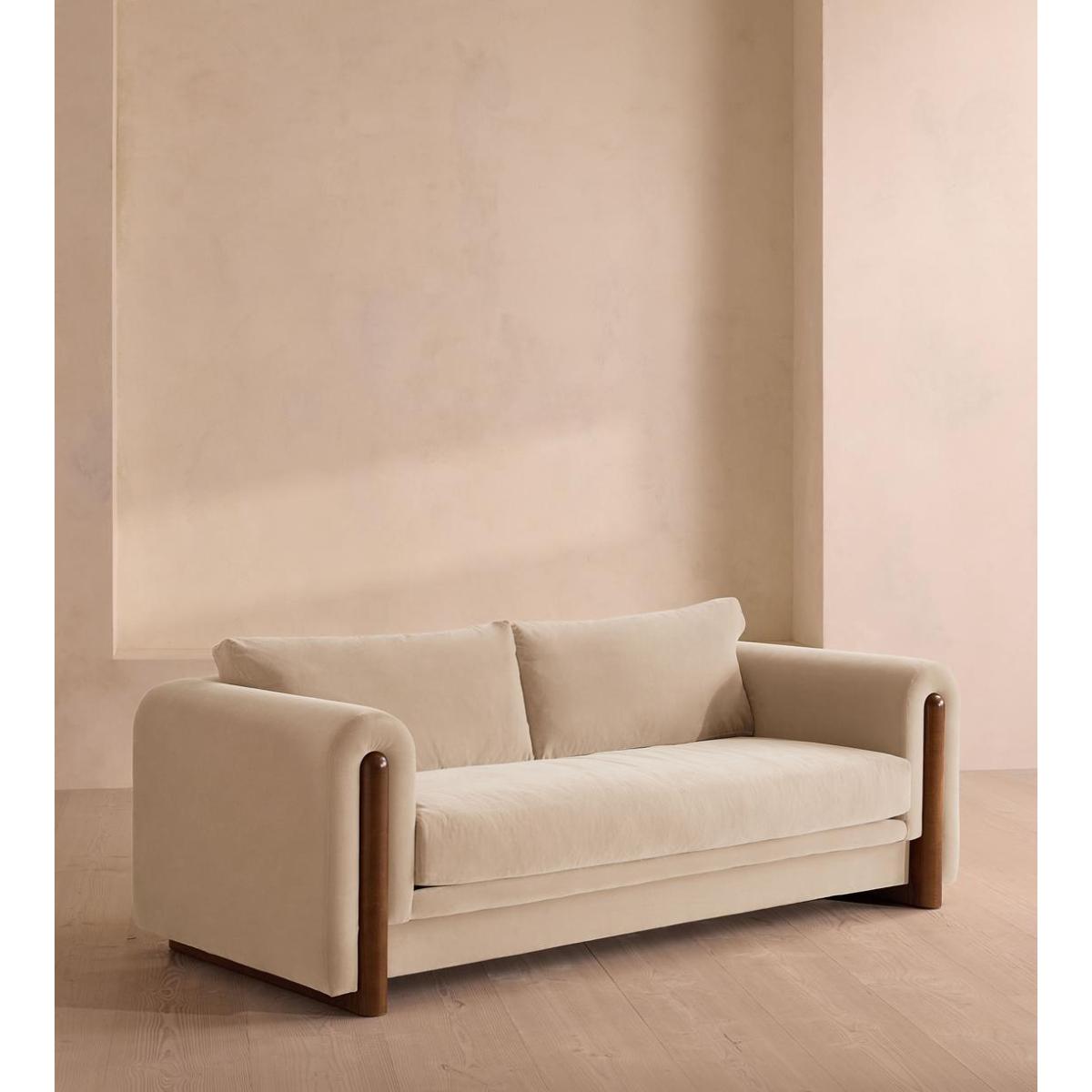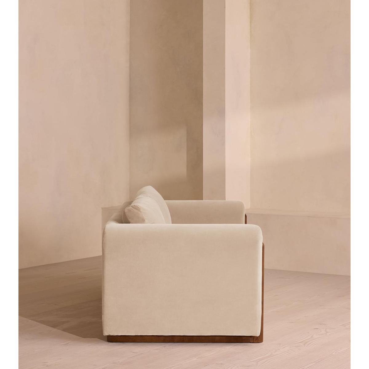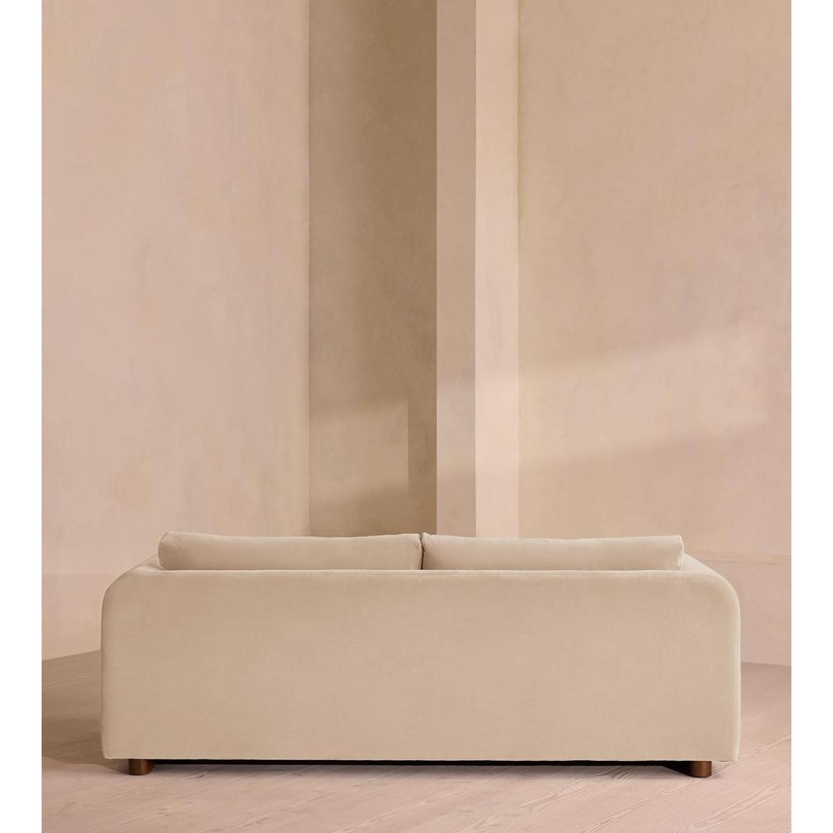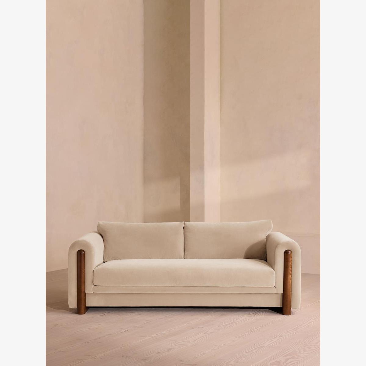 A solid oak frame crafted in the UK creates a low-rise silhouette fully upholstered in cotton velvet. Crafted in the UK, the solid oak frame of our Farrell sofa blends seamlessly into the front of its curved arms. The cotton velvet upholstery on its low-rise, three-seater silhouette is woven in the Netherlands, and available in our full made-to-order velvet colour palette.