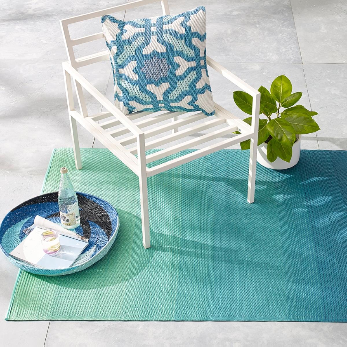 Add a pop of colour to your outdoor area with the Fab Hab Big Sur Outdoor Rug in Teal! Made from recycled plastic bottles, Fab Habitat have woven re-purposed plastic strips and straws to create this gorgeous ocean ombré! The design is reversible too, so at the flip of a rug your look is refreshed. And as it's made from plastic, your rug is mold, mildew and UV resistant and you can leave it outside all year round without worry. Perfect out on the patio, decking or lawn; why not roll yours up and take it to the beach and park and show off your new rug or style indoors and revamp your interiors! Your chosen spot is sure to look fab!With plenty of patterns and colours to choose from, have fun finding your favourite Fab Habitat rug!.