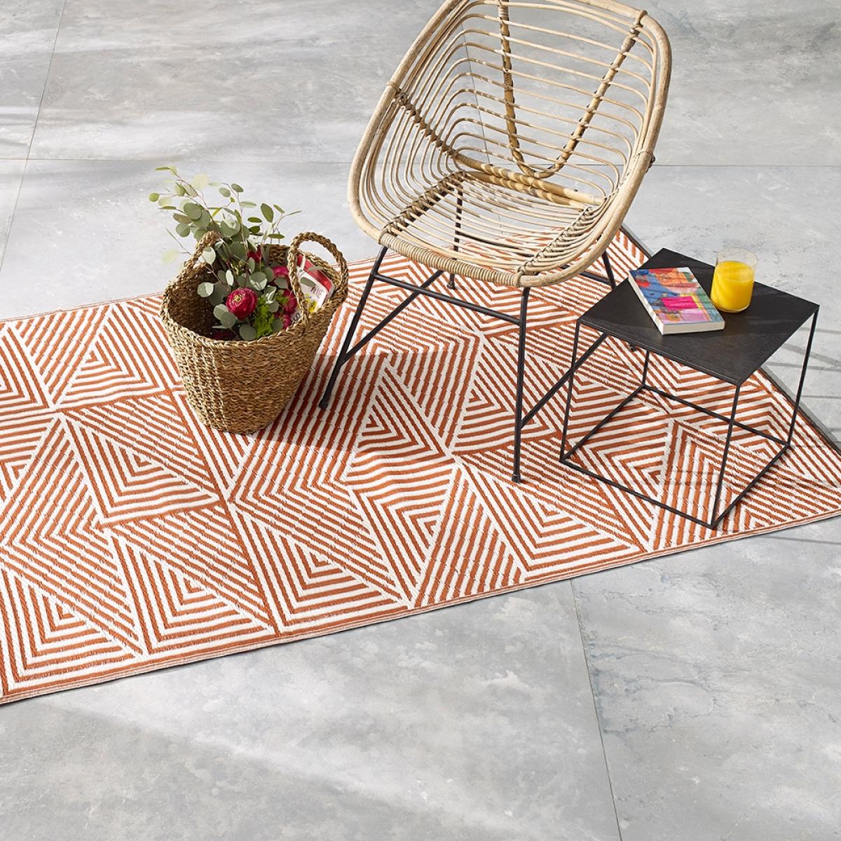 Update your outdoor space with the striking Fab Hab Tokyo Outdoor Rug in Burnt Orange. Made from recycled plastic bottles, the colourful straws and strips have been woven into intricate patterns adding colour and interest to your chosen spot. And as it's an outdoor rug, each design can withstand moisture, mildew, mold and UV light so your garden will look fabulous all year round! With a reversible design, simply flip your rug for a new look. Pop one under your garden furniture and create a focal point on your patio or decking. Not just limited to the garden, style yours inside or use it as a picnic mat at the beach or park! Versatile and made from recycled materials, what's not to love? With plenty of patterns and colours to choose from, see more from Fab Habitat!.