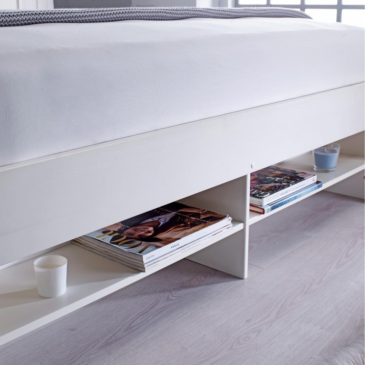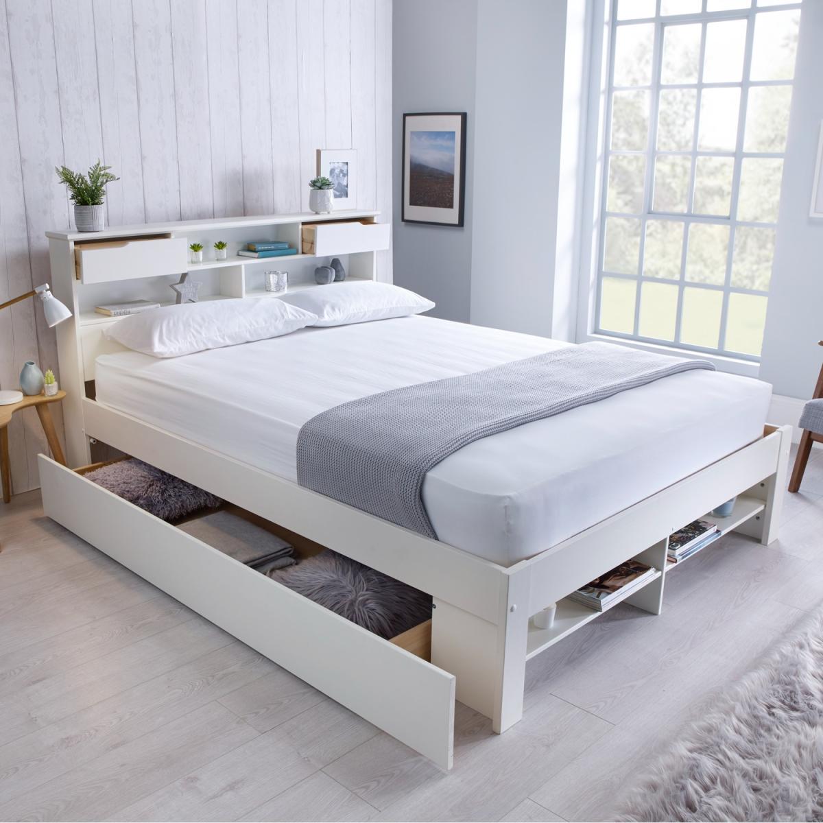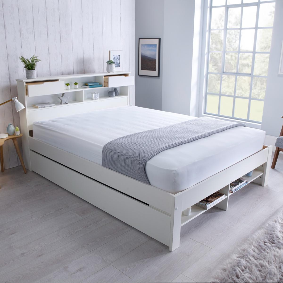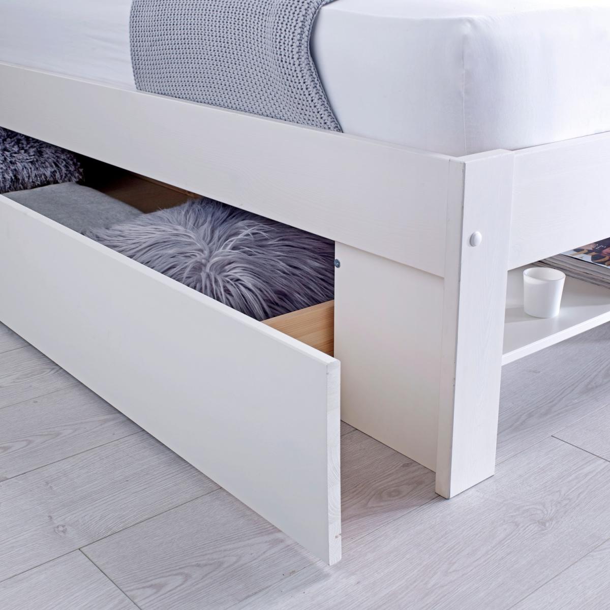 A charming and versatile wooden bed suitable for any bedroom. The Fabio comes with a foot end and headboard that double up as storage spaces ideal for books, blankets and other trinkets. The headboard includes 2 small drawers. This solid bedrame comes with under-bed space that is ideal for 1 or 2 Drawers (1 either side of the bed). Please select the 1 Drawer or 2 Drawer version for drawers. Available in White or Grey and White, with 0, 1 or 2 underbed drawers.