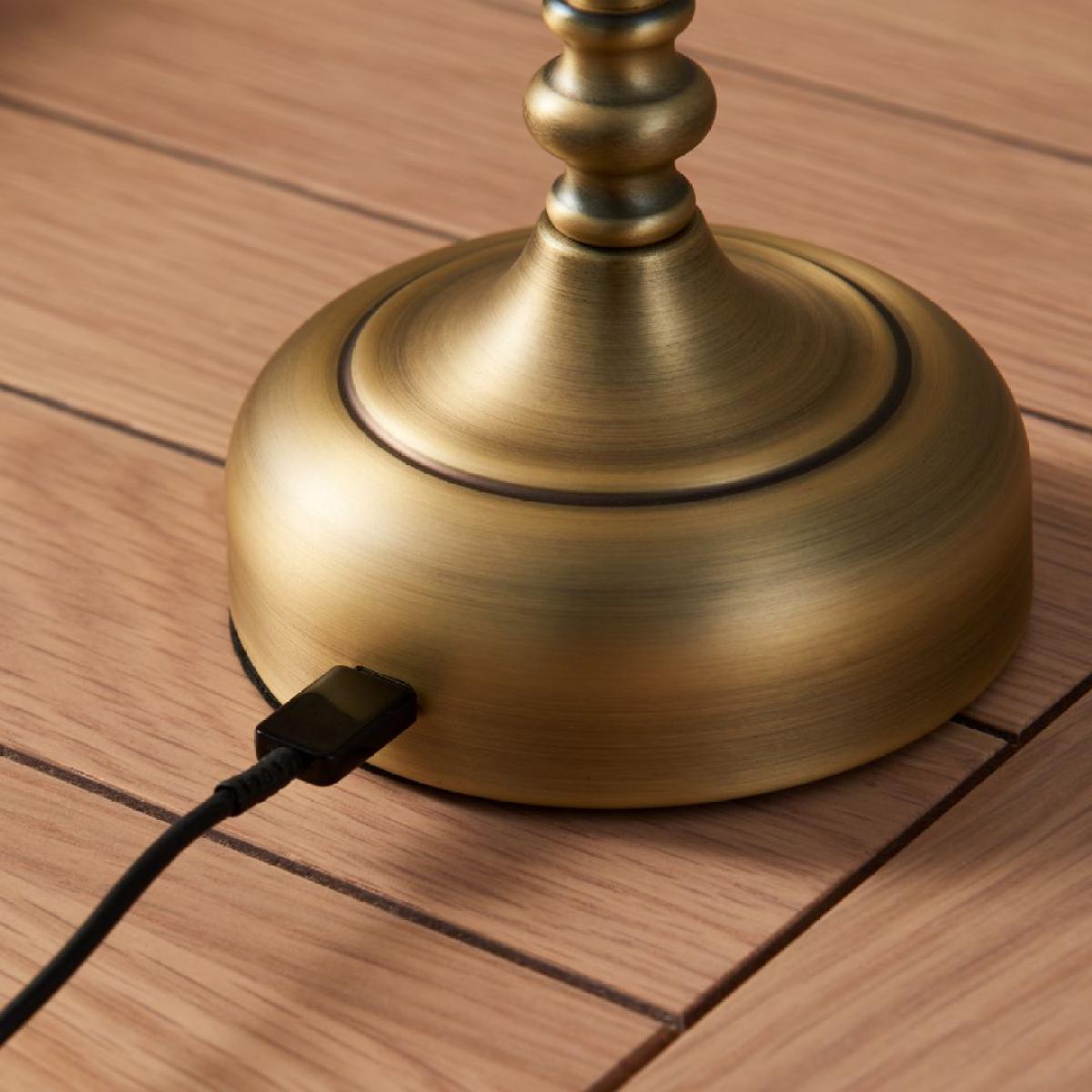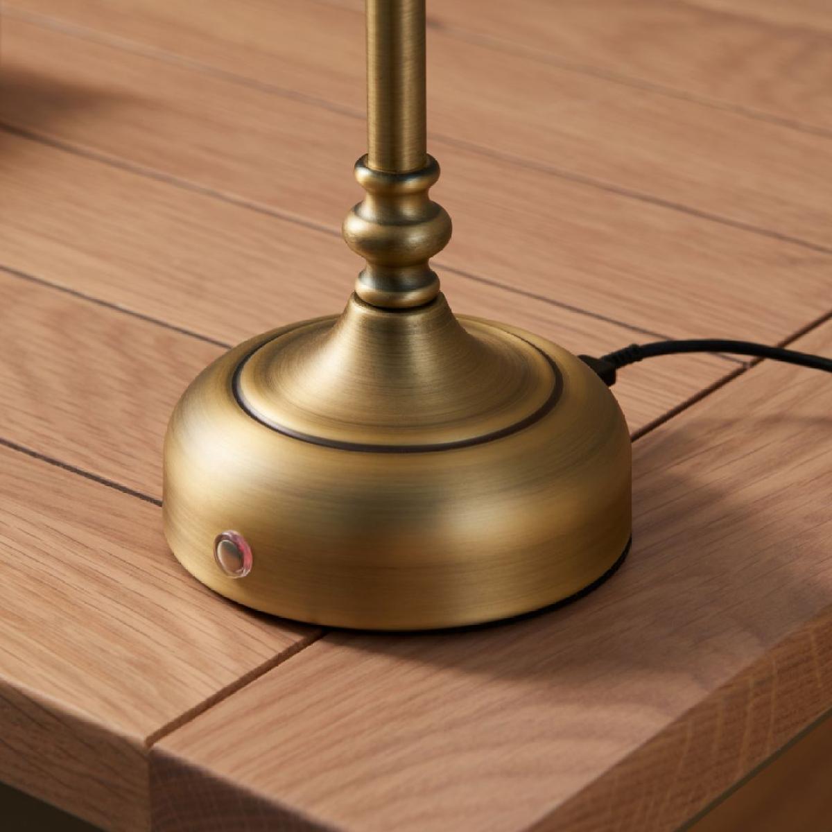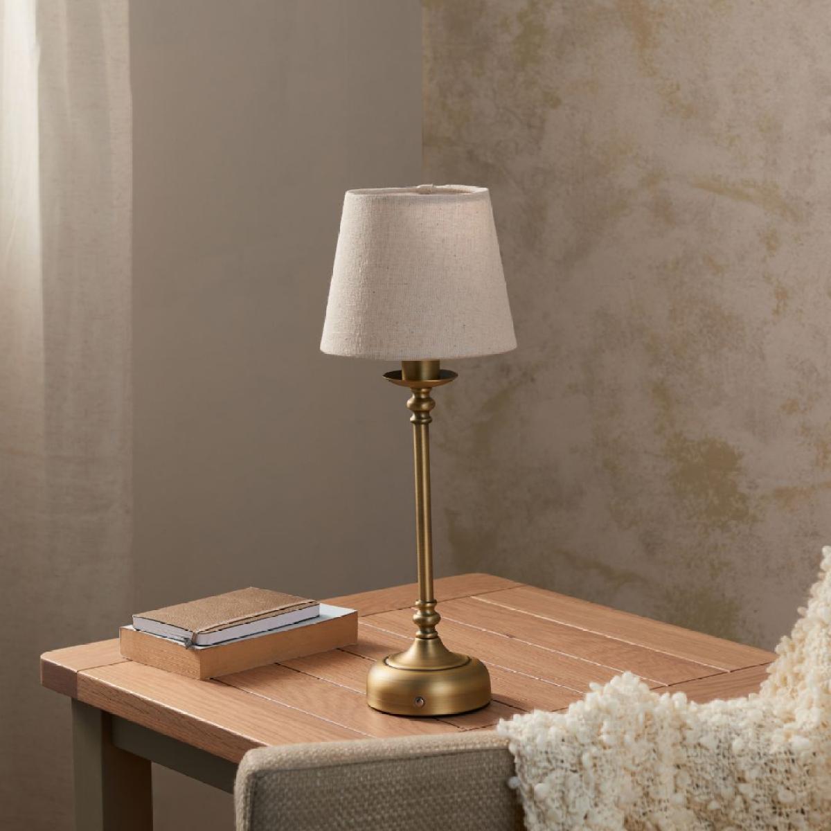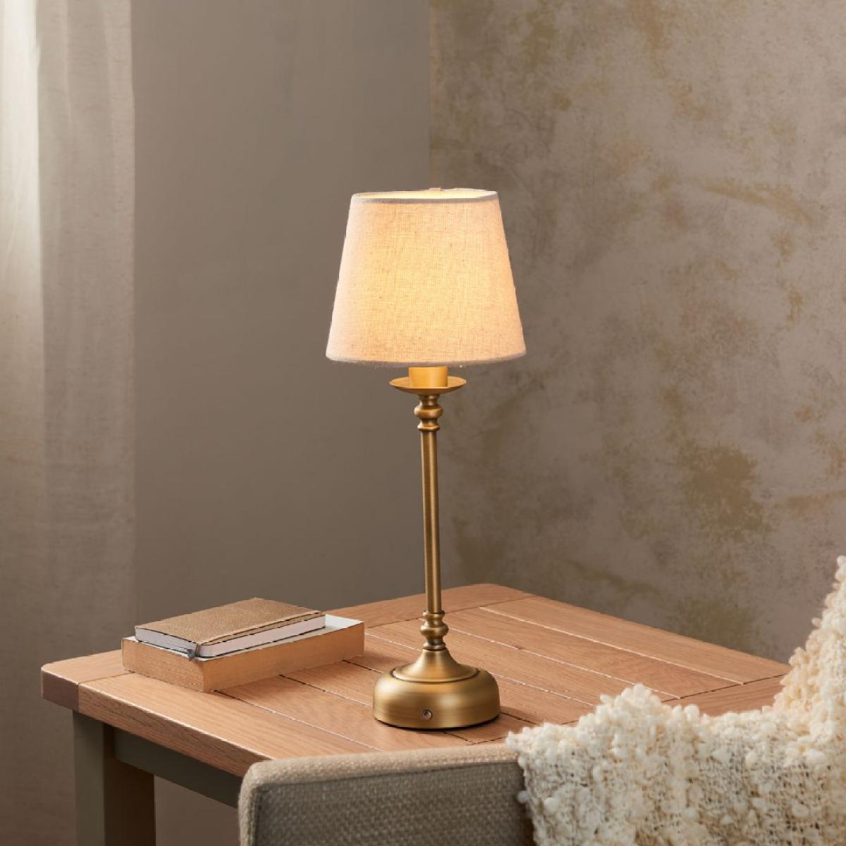 Fable rechargeable table lamp, featuring integrated LED technology, a natural-coloured tapered shade, an antique brass finish and a 3-stage touch dimmer function. The Fable rechargeable table lamp combines modern convenience with timeless style. Featuring integrated LED technology, this lamp offers energy-efficient lighting with a sleek, antique brass finish that adds a touch of elegance to any setting. The natural-coloured tapered shade provides a soft, warm glow, perfect for creating a cosy atmosphere in any room. Designed with versatility in mind, the Fable table lamp includes a 3-stage touch dimmer function, allowing you to easily adjust the brightness to suit your mood or task. Whilst not only being stylish, this table lamp is also highly portable, allowing you to bring light wherever it's needed without the hassle of cords. Its rechargeable battery means you can easily move it from room to room, making it perfect for outdoor patios, reading nooks or even as a centrepiece for dinner tables. Whether you're using it indoors or outdoors, the lamp’s cordless design offers the flexibility to illuminate any space with ease. Fable rechargeable table lamp, featuring integrated LED technology, a natural-coloured tapered shade, an antique brass finish and a 3-stage touch dimmer function. The Fable rechargeable table lamp combines modern convenience with timeless style. Featuring integrated LED technology, this lamp offers energy-efficient lighting with a sleek, antique brass finish that adds a touch of elegance to any setting. The natural-coloured tapered shade provides a soft, warm glow, perfect for creating a cosy atmosphere in any room. Designed with versatility in mind, the Fable table lamp includes a 3-stage touch dimmer function, allowing you to easily adjust the brightness to suit your mood or task. Whilst not only being stylish, this table lamp is also highly portable, allowing you to bring light wherever it's needed without the hassle of cords. Its rechargeable battery means you can easily move it from room to room, making it perfect for outdoor patios, reading nooks or even as a centrepiece for dinner tables. Whether you're using it indoors or outdoors, the lamp’s cordless design offers the flexibility to illuminate any space with ease.
