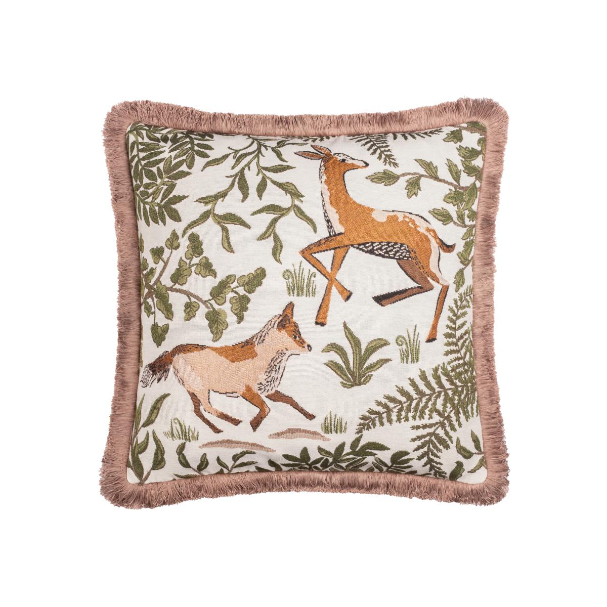 Fable Fox and Deer Embroidered Cotton Cushion - Green / Feather