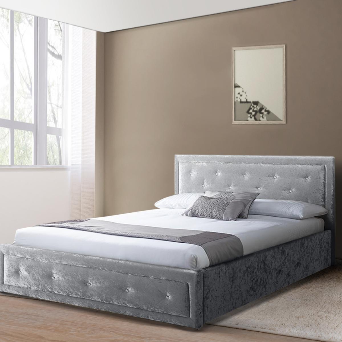 This stylish bed is beautifully upholstered in either silver crushed or grey hopsack fabric. It features a padded headboard and footboard and is finished with a diamante crystal button detail. It is made from a solid wooden frame and has a sprung slatted base to give support to the mattress and give you a fully supportive and comfortable night's sleep. The ottoman aspect of this bed frame is operated using a gas lift mechanism that lifts up the mattress to reveal ample storage space. Please note this is straight to floor storage area.