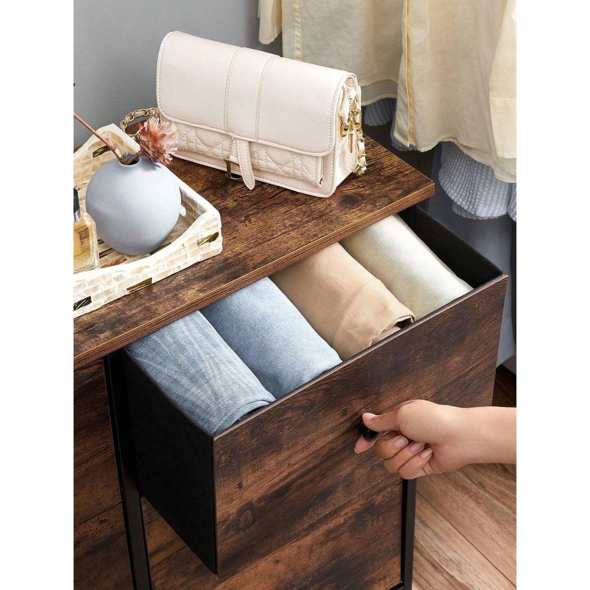 If you keep losing ground in the battle against scattered pyjamas, blankets, and bits and pieces that have nowhere to go, this dresser with 6 spacious fabric drawers is here to help bring your tidy home back. The rustic brown drawers paired with black panels create a chic look, complemented by charming wood knobs. Made from MDF drawer front, metal, and particleboard top, this stable and durable yet lightweight storage organiser unit is ready to support your ever-growing clothing collection. With easy-to-follow instructions and an anti-tip kit for added security, you can effortlessly assemble it in your hallway, nursery, or bedroom without sacrificing your personal style.