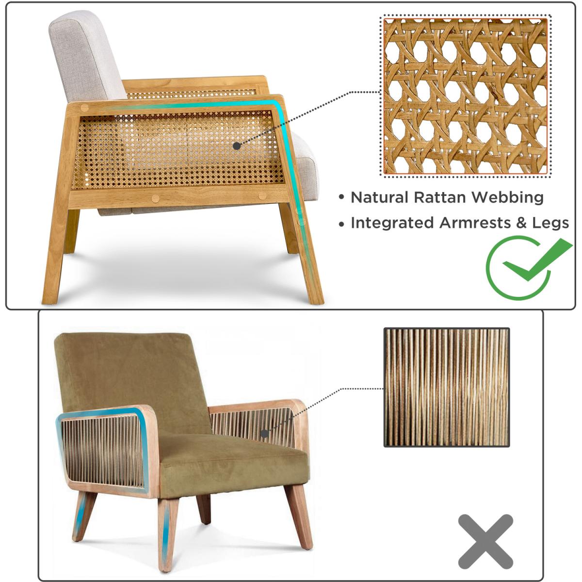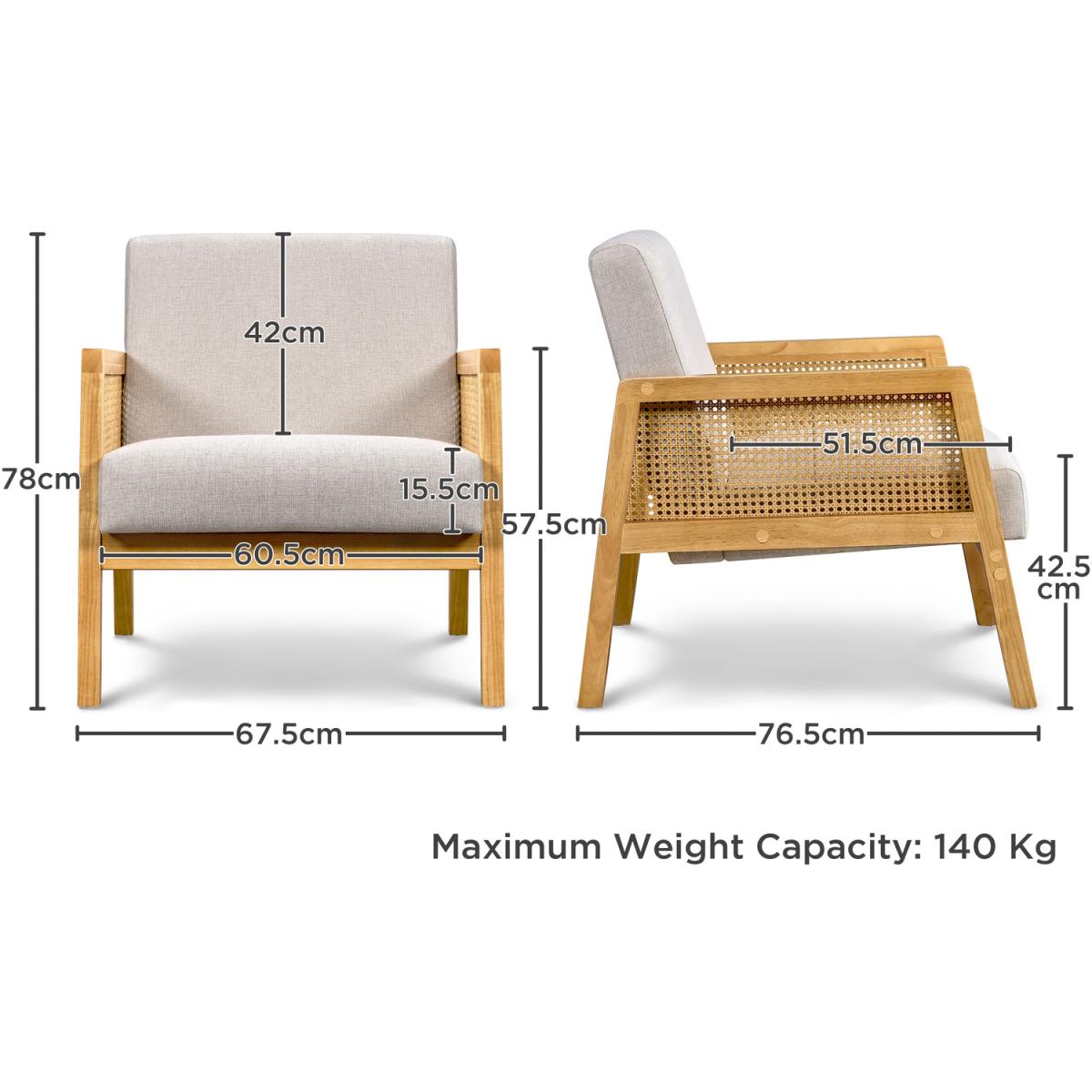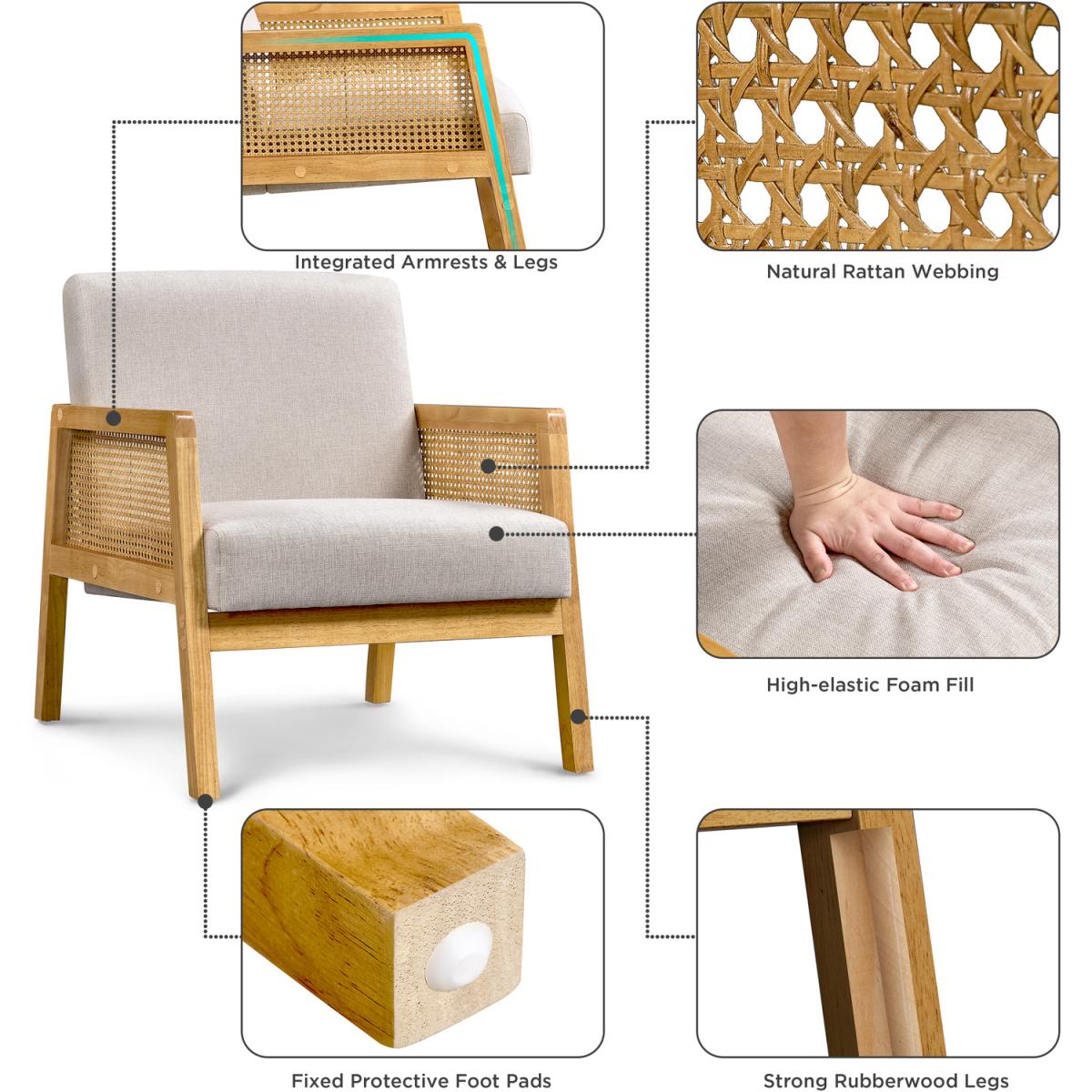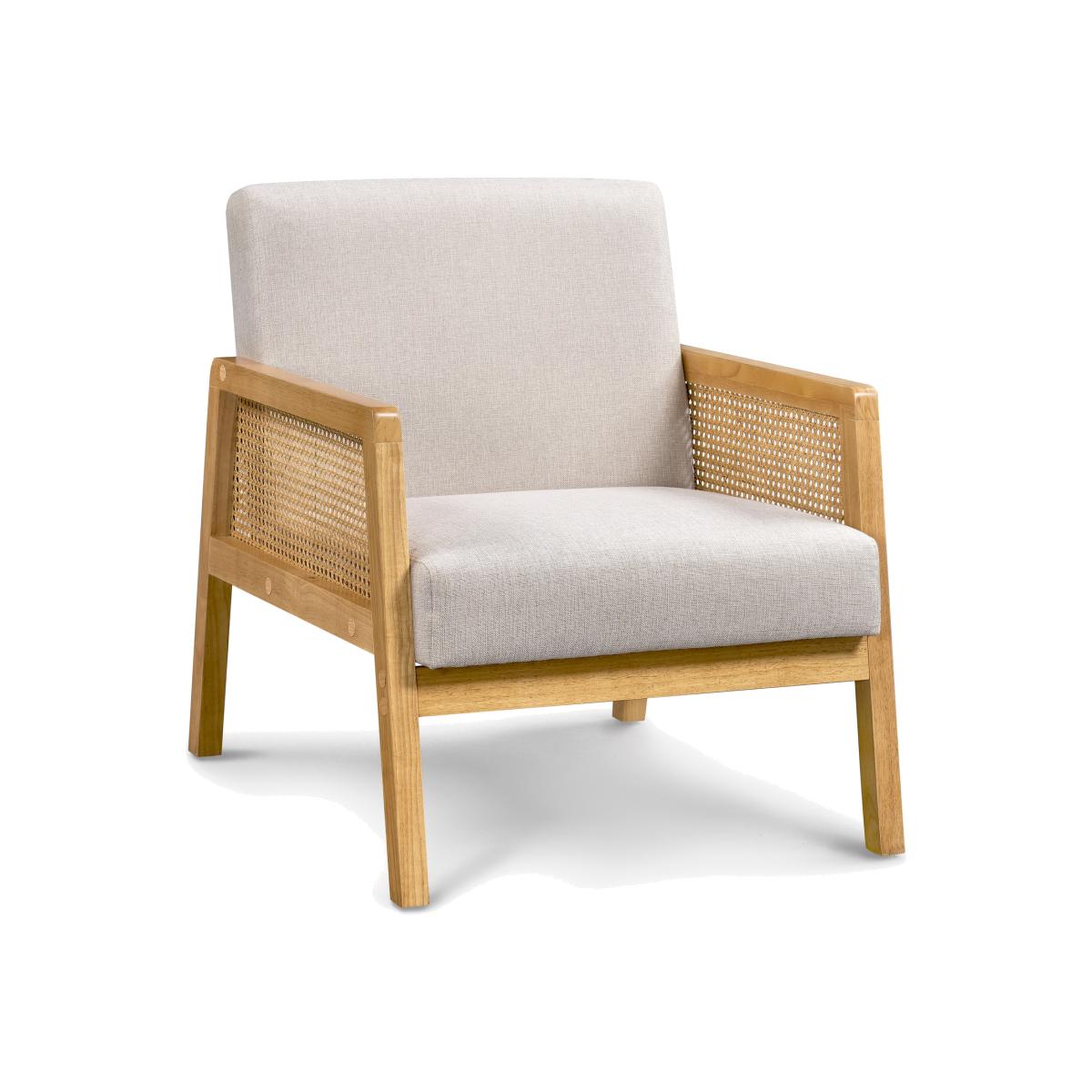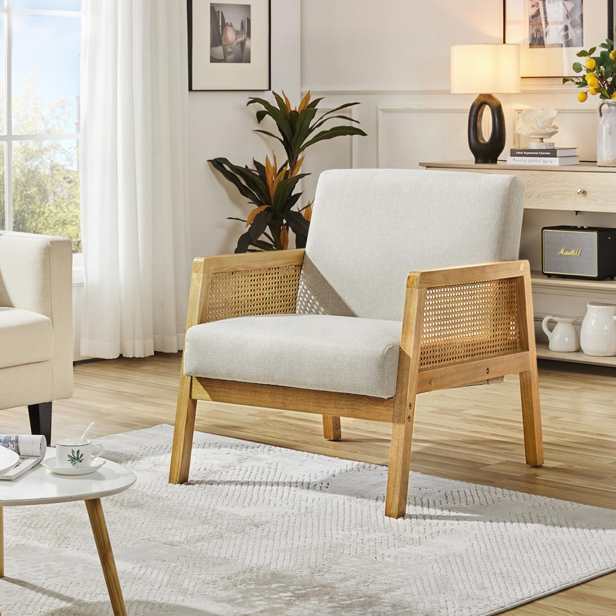 Adds a beachy look to your sitting area with this upholstered armchair. Its rectangular, cane-paneled arms, splayed legs and cozy fabric upholstery add a stylish and elegant touch to your space. It's crafted with a solid wood frame and sits on tapered rubberwood legs in a natural hue. A slanted backrest and extra-wide cushioned seat along with long armrests provide ample comfort and support in any seating position. This chair is upholstered in polyester that is breathable and close to the skin. The high-density foam-filled seat is supported by four sinuous springs, extending its service time. A simple design meets a warm, neutral color palette, making it ideal for living rooms, bedrooms, home offices, sunrooms, lounges, balconies and more.
