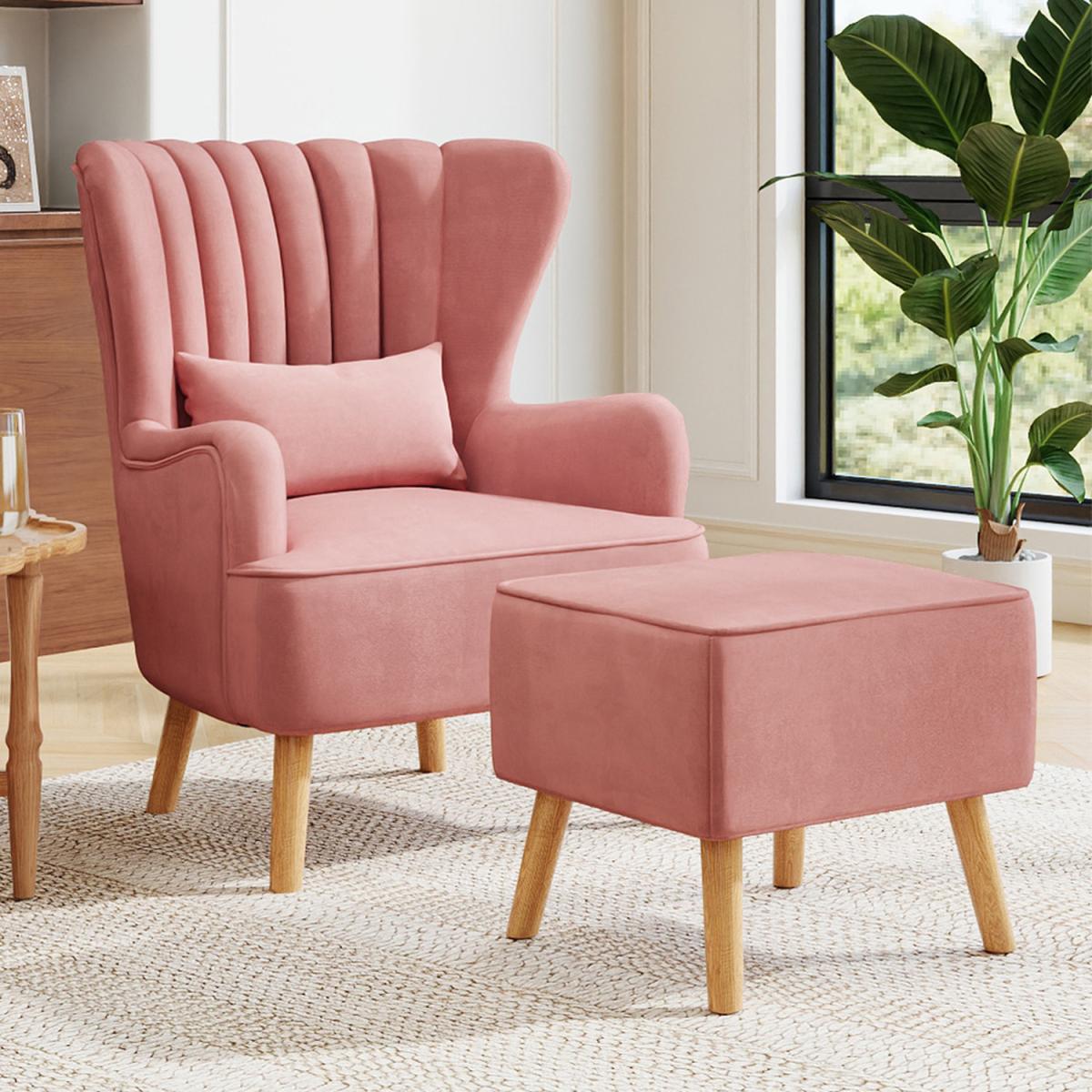 Add modern comfort to your space with this armchair set. Upholstered in soft fabric with a high back, padded cushion, and sturdy wooden legs, it brings a touch of mid-century charm. The matching footstool enhances relaxation and doubles as extra seating.
