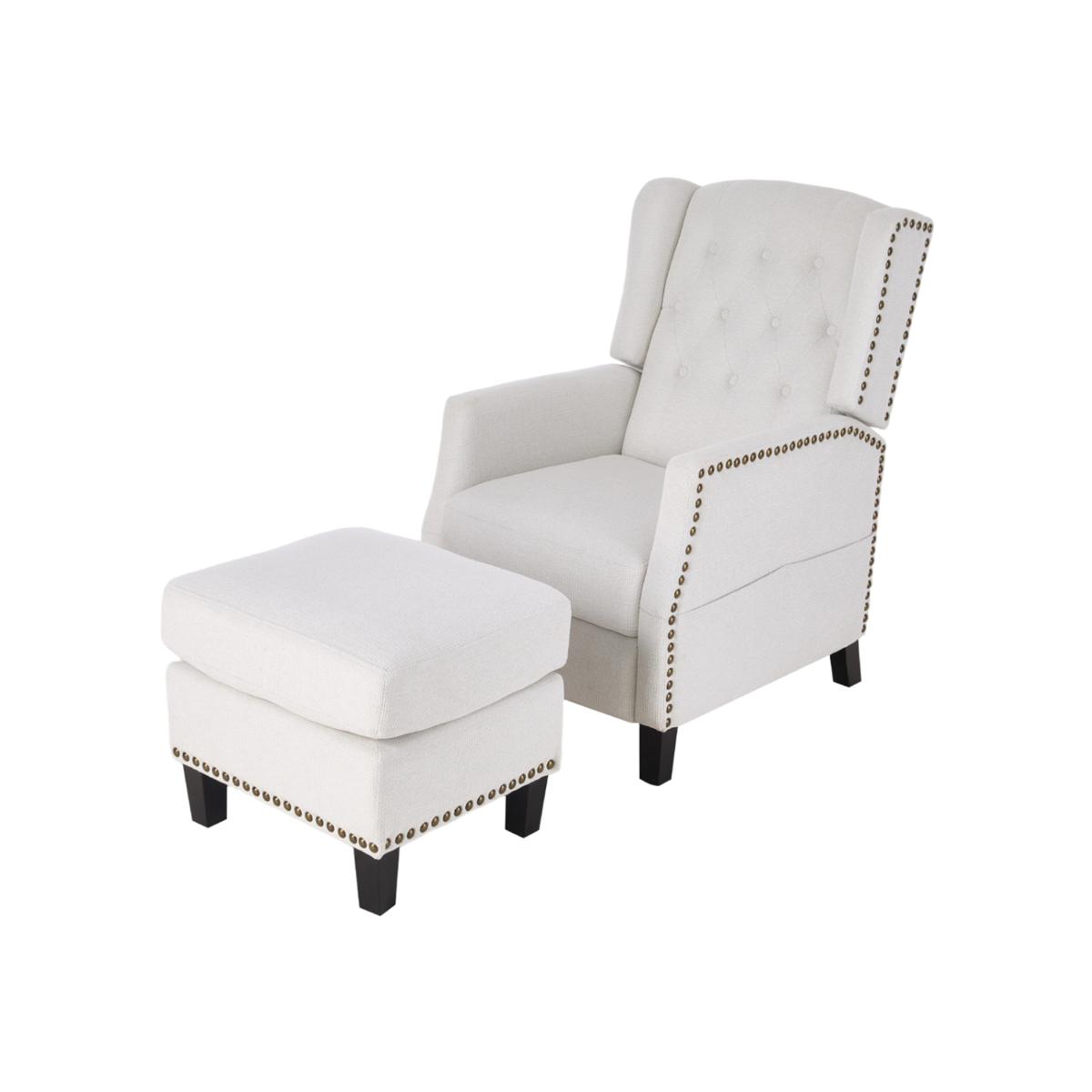 Experience timeless comfort and style with this push back recliner chair and matching footstool, thoughtfully crafted for relaxation and sophistication. Elegant nailhead trim outlines its refined silhouette, reflecting expert craftsmanship and attention to detail. The gently winged backrest and button tufting lend a classic charm, making it a standout feature in any room. Deeply cushioned seating provides lasting comfort and excellent support for extended lounging. A simple push activates the recline function, extending the footrest for effortless relaxation. The coordinating footstool completes the set, offering versatile comfort for reading, unwinding, or enjoying a peaceful moment at home.