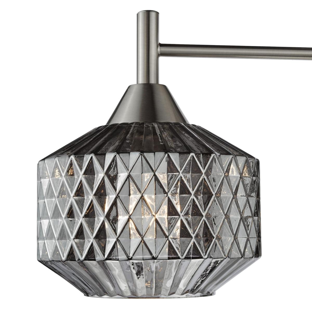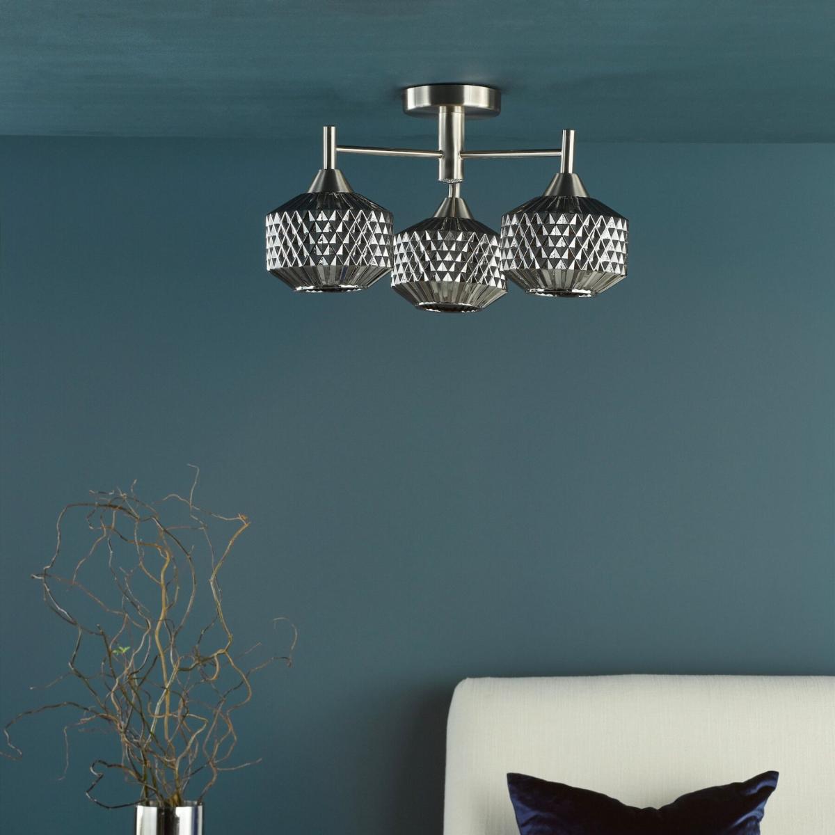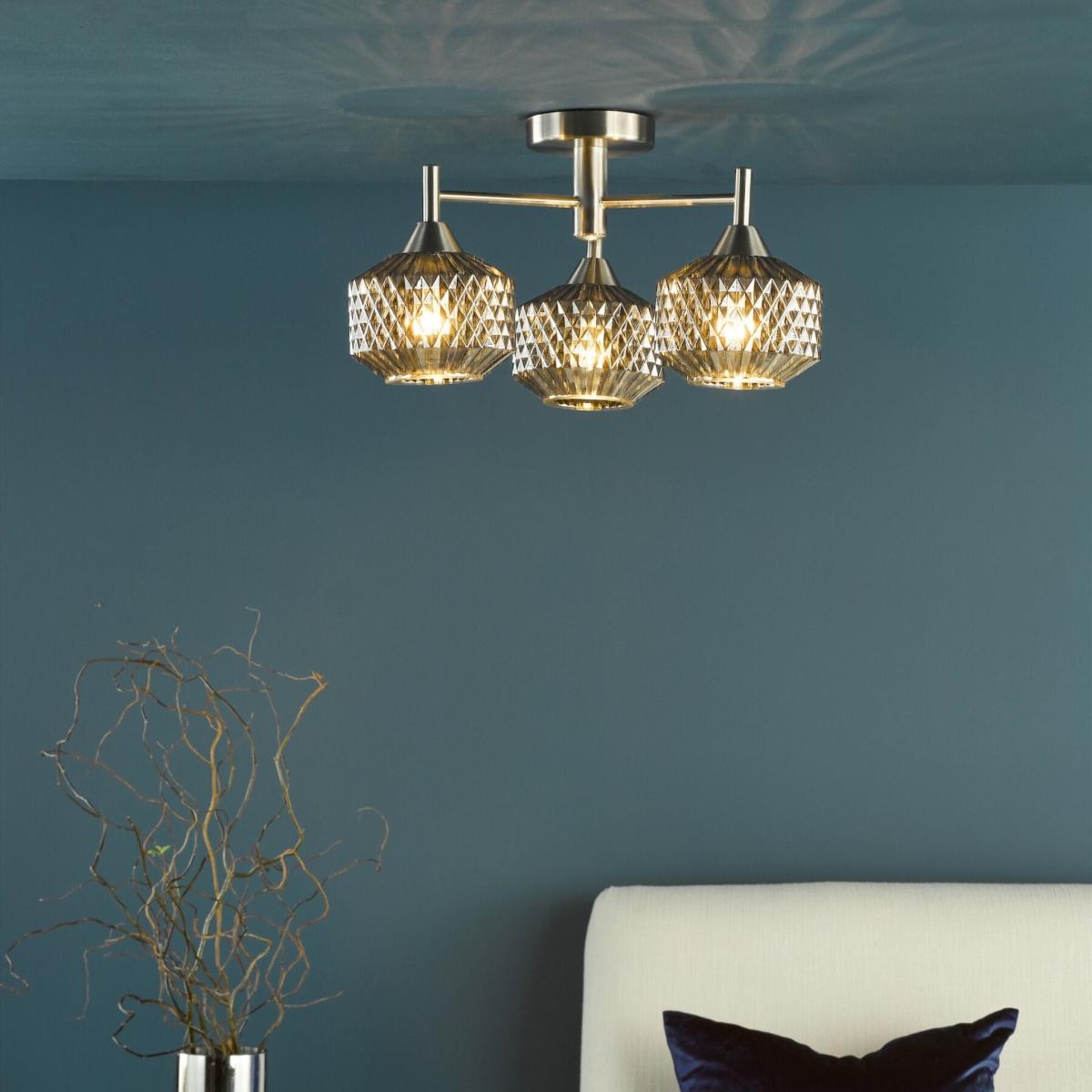 Fabrienne 3-light semi-flush ceiling light, featuring textured smoked glass shades and a satin nickel finish. The Fabrienne semi-flush ceiling light combines contemporary style with subtle sophistication, making it a standout feature for modern interiors. It showcases three geometric-textured smoked glass shades, their faceted surfaces creating an intricate interplay of light and shadow for a captivating ambiance. A satin nickel finish on the ceiling plate and fittings lends a sleek, polished look that complements the smoky tones of the glass. Designed for rooms with lower ceilings, this semi-flush light offers a space-saving yet visually striking lighting solution. Whether installed in a living room, bedroom or hallway, the Fabrienne ceiling light effortlessly enhances your space with its chic, modern aesthetic. Fabrienne 3-light semi-flush ceiling light, featuring textured smoked glass shades and a satin nickel finish. The Fabrienne semi-flush ceiling light combines contemporary style with subtle sophistication, making it a standout feature for modern interiors. It showcases three geometric-textured smoked glass shades, their faceted surfaces creating an intricate interplay of light and shadow for a captivating ambiance. A satin nickel finish on the ceiling plate and fittings lends a sleek, polished look that complements the smoky tones of the glass. Designed for rooms with lower ceilings, this semi-flush light offers a space-saving yet visually striking lighting solution. Whether installed in a living room, bedroom or hallway, the Fabrienne ceiling light effortlessly enhances your space with its chic, modern aesthetic.