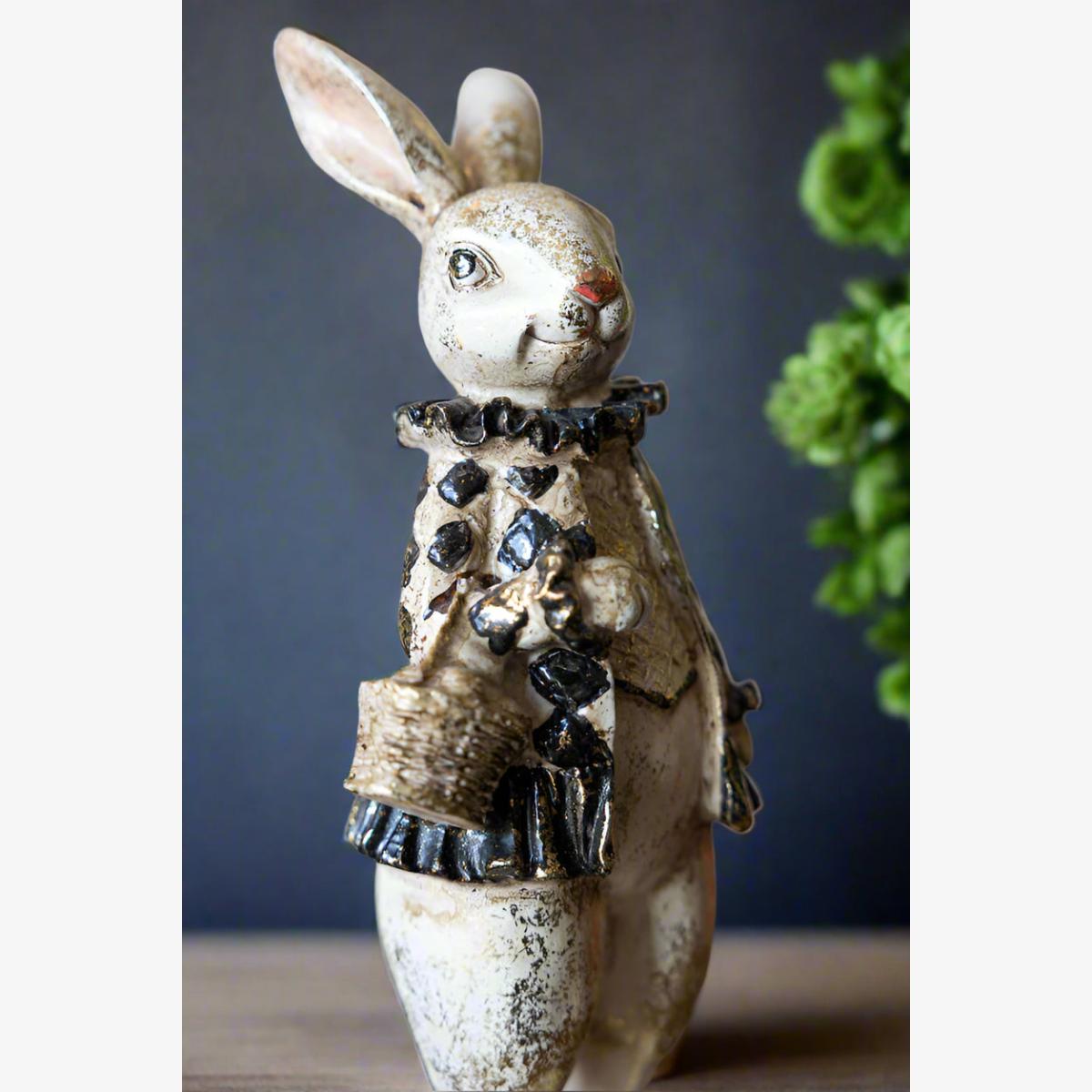 Step aside, ordinary decor - this rabbit is bringing the drama! Dressed to impress in a black and gold harlequin-patterned jacket complete with that iconic high collar, this tall, elegant, slightly eerie Wonderland-inspired rabbit is here to steal the show. With his human-like stance, gold and off-white finish, and a tiny basket of eggs perched on his arm, this ornament is the perfect blend of whimsical, weird, and wonderfully extra. Is he a charming Easter decoration? Absolutely. Will he fit in with your other home accessories all year round? Yes. Pop him on a mantel, a shelf or anywhere that needs a touch of magic. Wonderfully weird, cool, and just a little bit mad - and we wouldn't have him any other way. - Fabulous Standing Tall Rabbit In Gold - Measures: W10cm x H24cm - Material: Polyresin