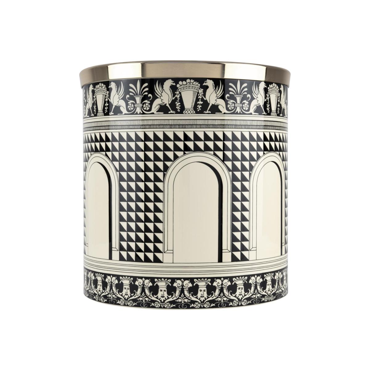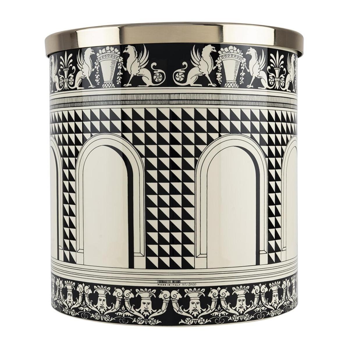 Inspired by Neoclassical Italian architecture, this visually striking and elegant paper bin from Fornasetti in black and white is crafted from hand-silkscreened and lacquered metal. Trimmed with a brass upper edge and equipped with feet, this versatile bin boasts an eclectic shape and can also be used as a container or even a vase holder. Perfect as a housewarming gift or for a home office.