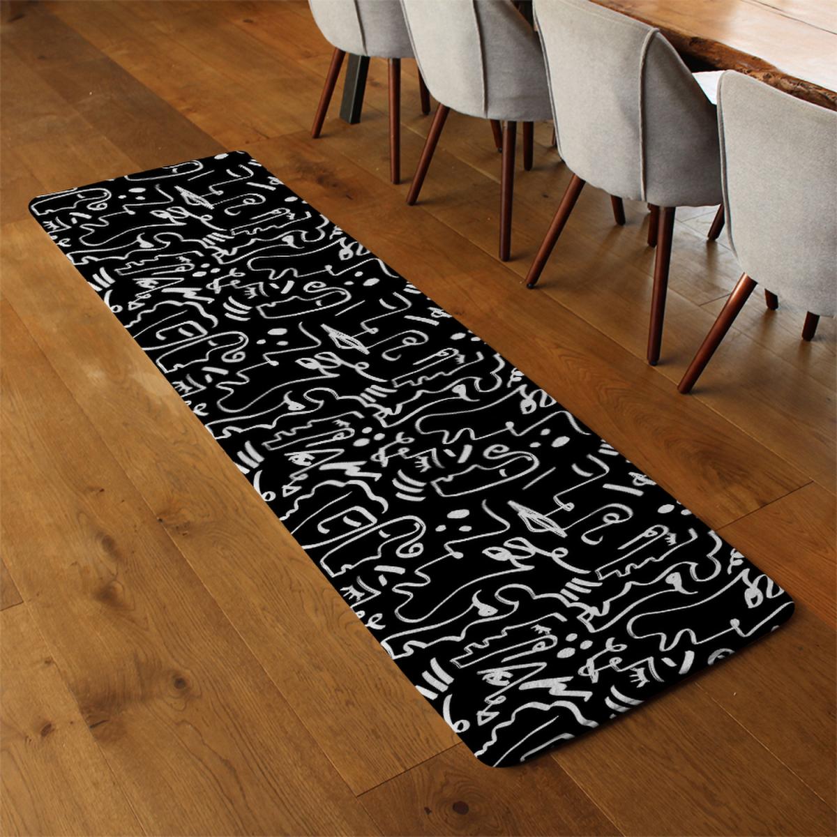 Faces, Masks and Geometric Shapes Repeating Designer Runner Rug - Black