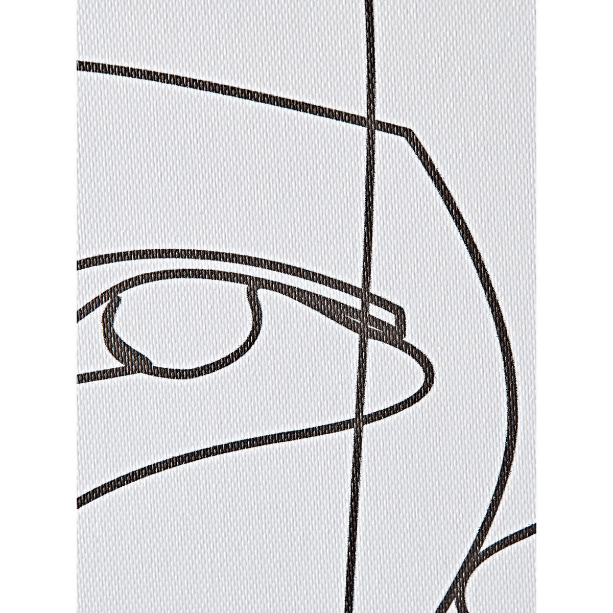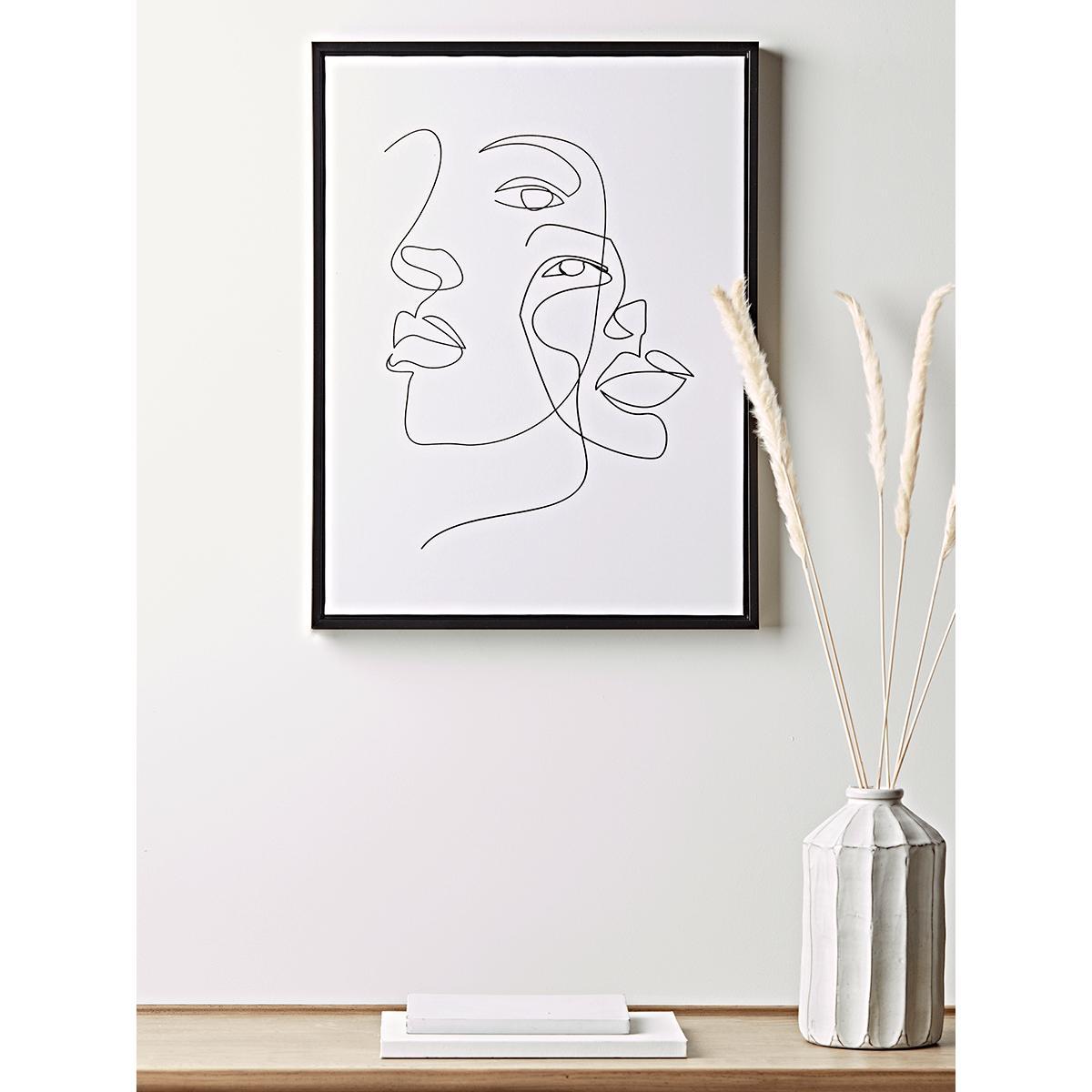 The fluid lines of our framed minimalist illustration will effortlessly introduce a creative element to your scheme. Here, depicted by line are the faces of two subjects, a contemporary, monochrome image printed on canvas that will command little from your existing look.