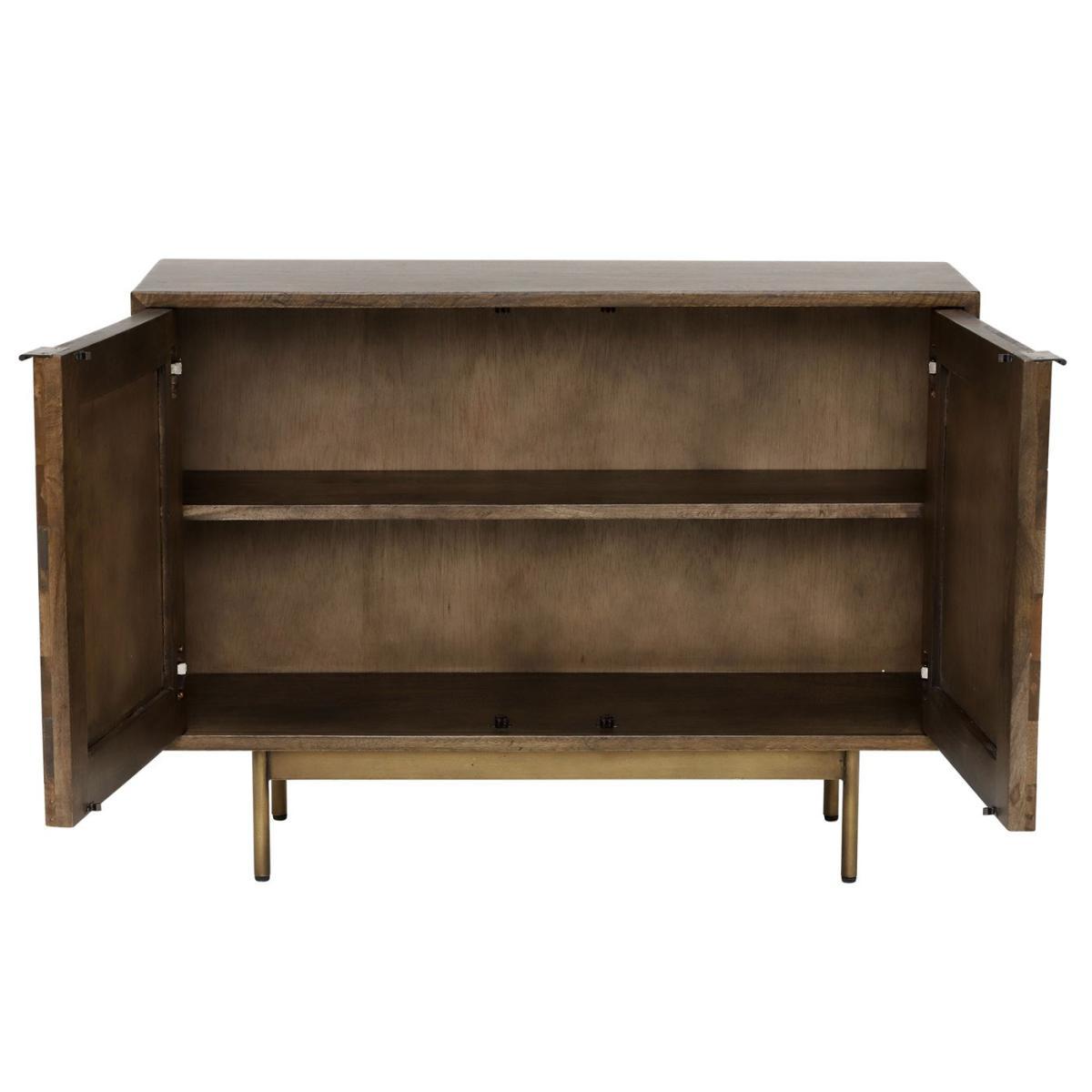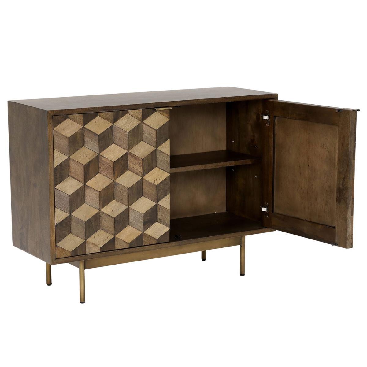 Defined by the captivating geometric design on its doors, the Facet 2 door sideboard is a unique piece that is sure to be admired. Inside, two compartments offer plentiful space for whatever you choose to store away, with a fixed shelf to aid organisation. Built from sturdy and characterful mango wood, the sideboard features minimalist metal handles and feet, in an antique brass finish for that signature touch of vintage charm. Lending a quirky, mid-century look to t
