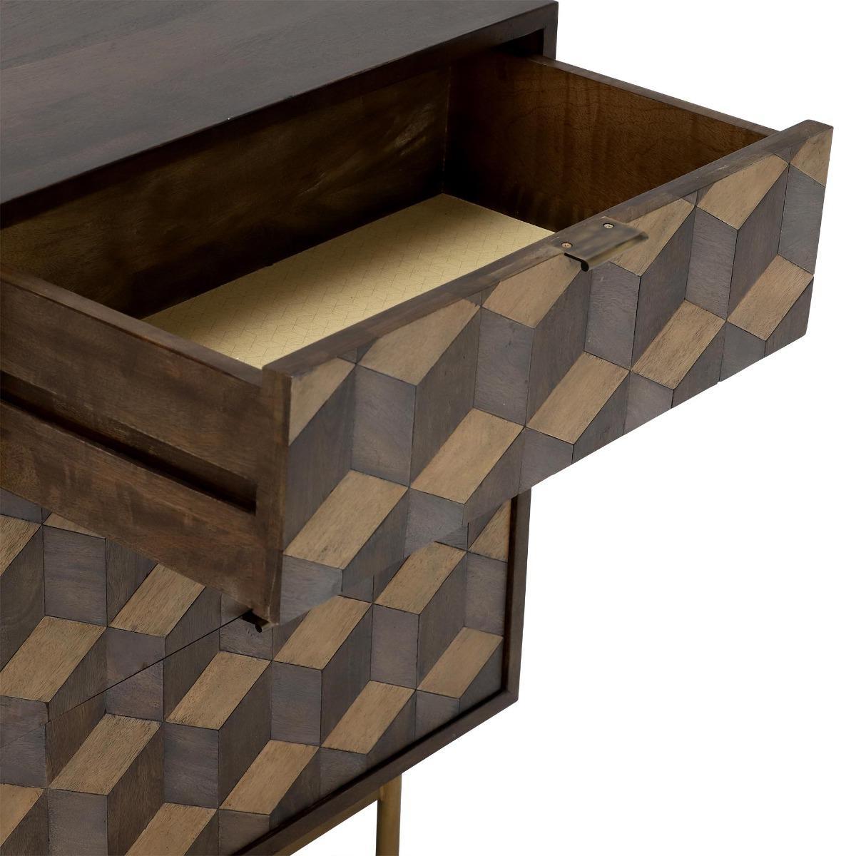 I love this piece for its striking geometric pattern and the luxe touch of brass legs, which add a touch of sophistication. It works particularly well in modern or eclectic interiors, where it can serve as a statement piece, but it also pairs nicely with warm, natural materials like wood or stone for a more organic feel. Practical styling tips include keeping the top surface clutter-free with a sleek lamp or a decorative tray, allowing the intricate drawer design to stand out. Inside, shopping baskets or organised dividers can help maintain neatness, especially if you're using it in a bedroom or hallway. Its dark mango wood finish is versatile enough to complement earthy tones or even bold, colourful schemes, making it a flexible choice for various interior styles.