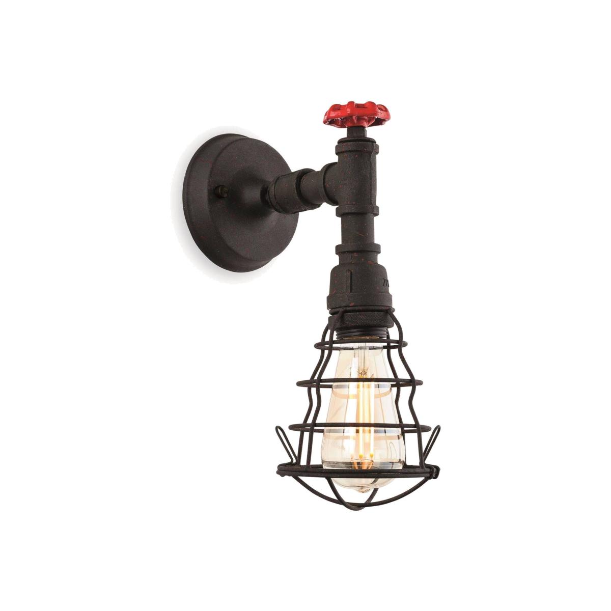 Enjoy true industrial style in your home with this unique fixture. The Factory 1-Light Rustic Black Indoor Wall Light is fashioned just like an outdoor tap. Complete with a red handle and caged shade this fixture will lend a distinctive look to your interior.