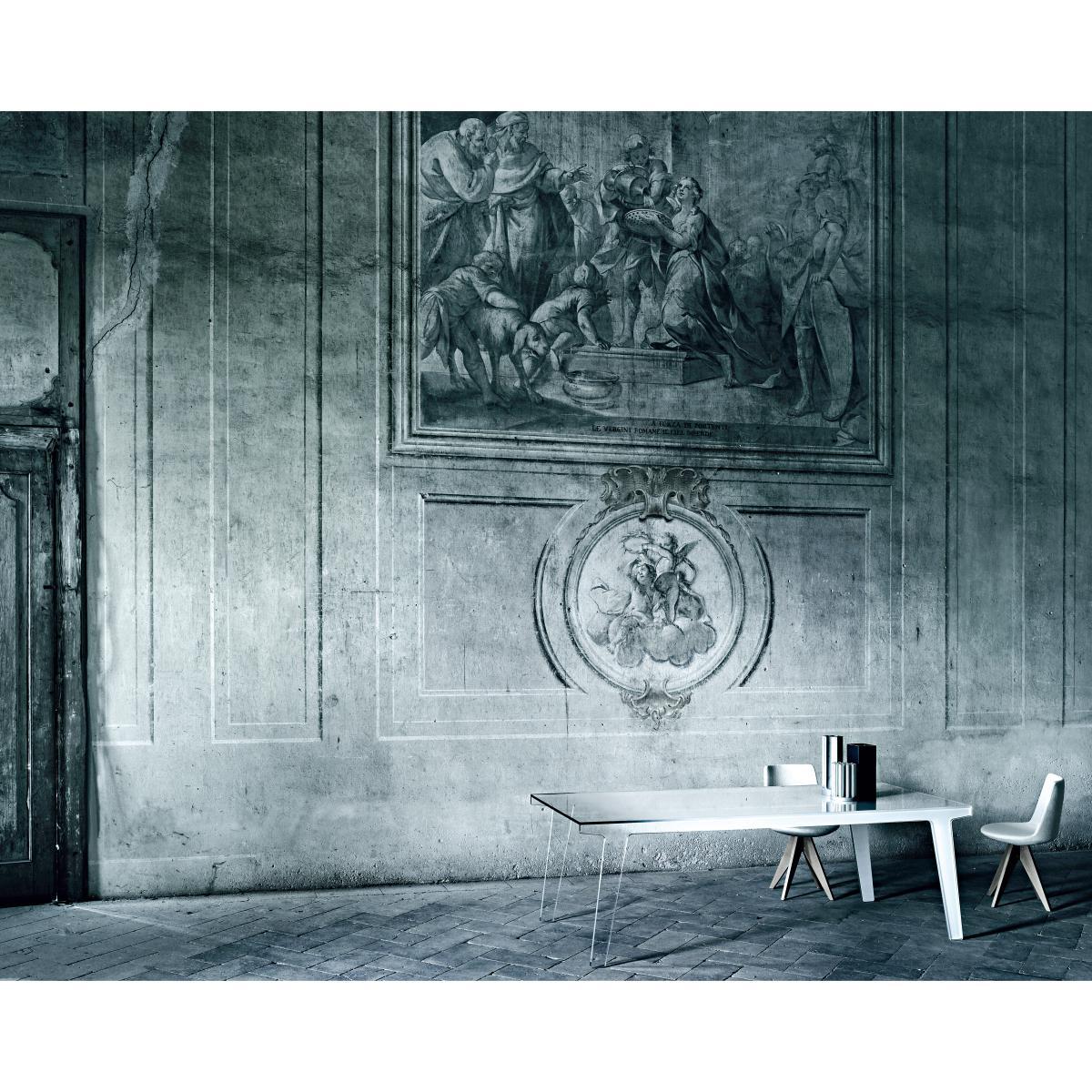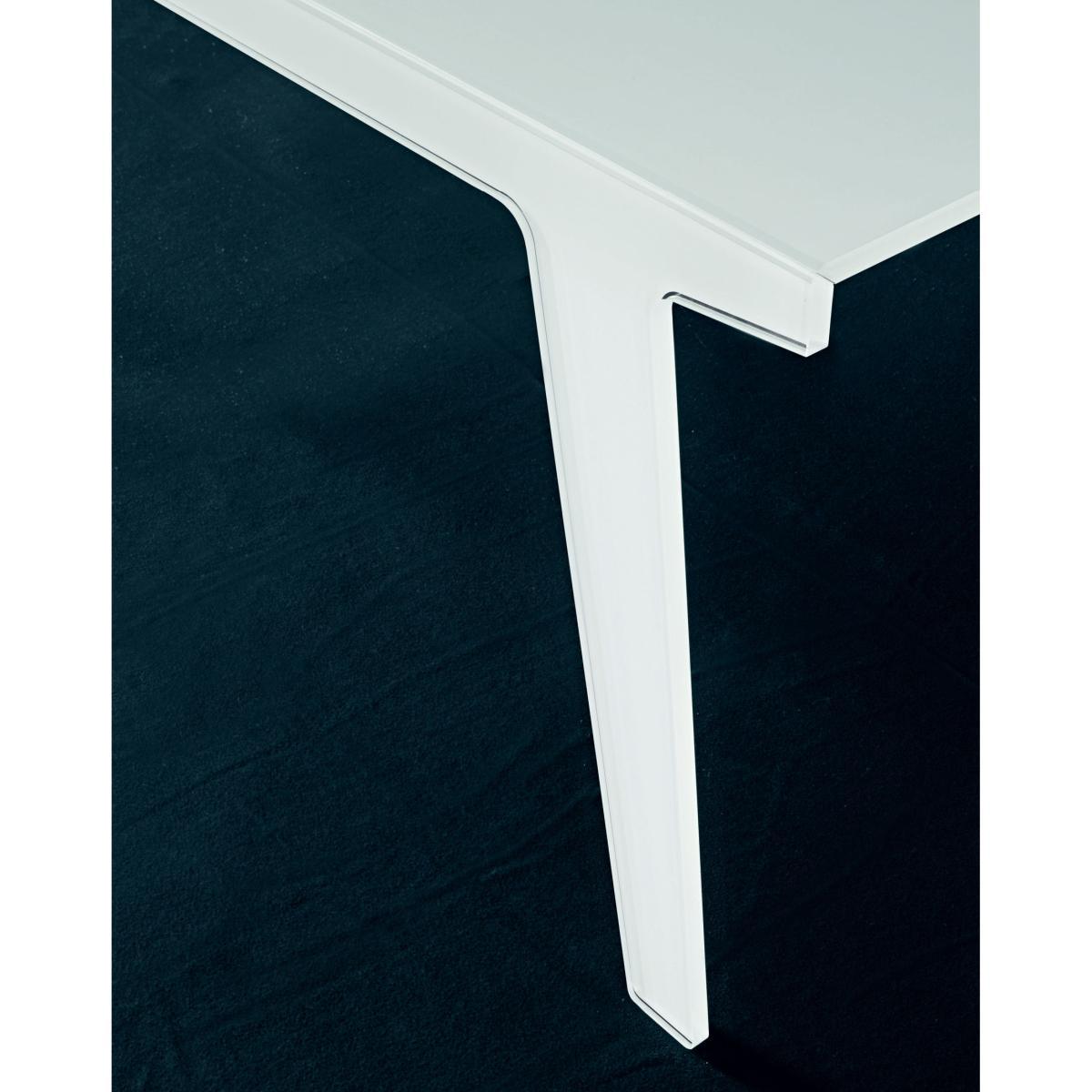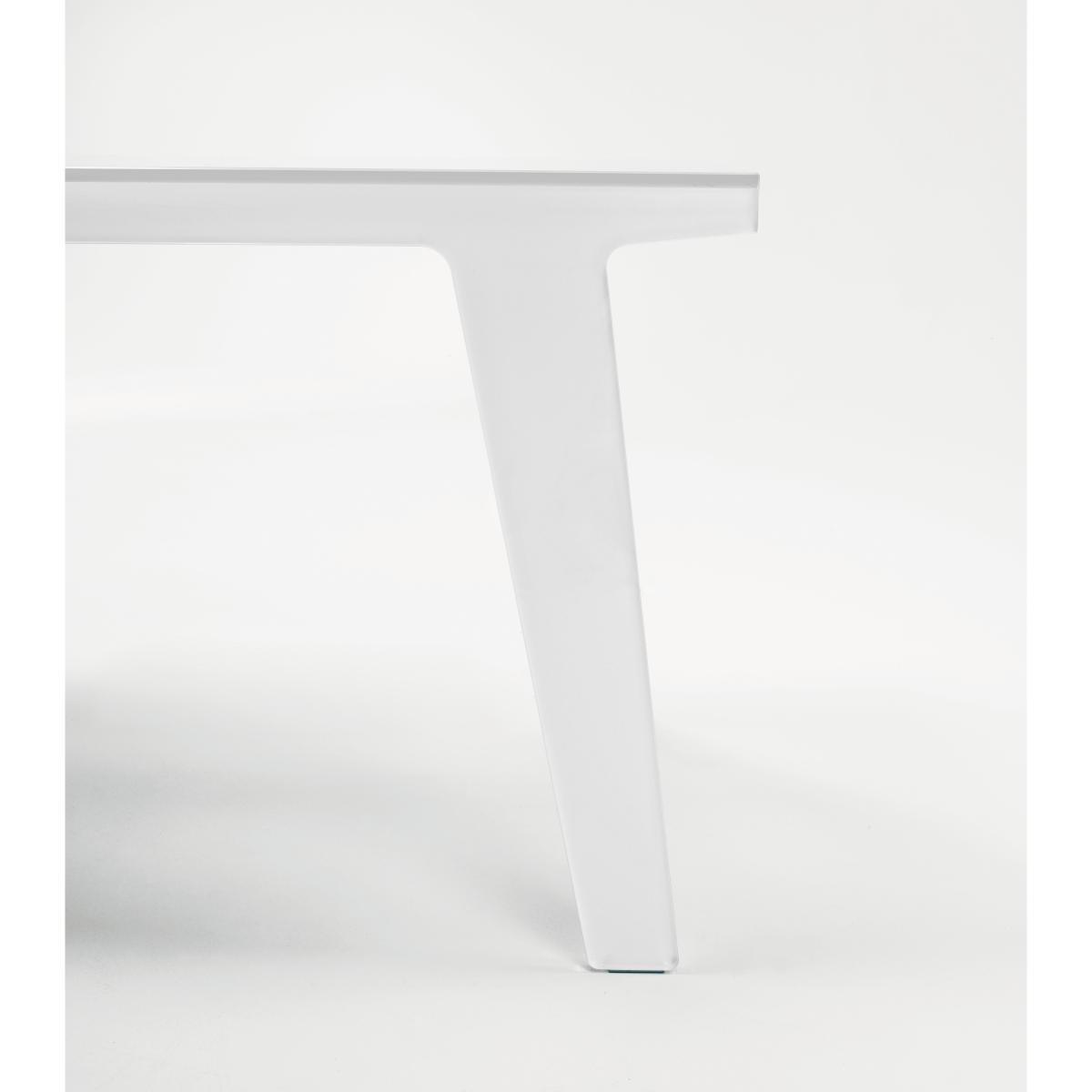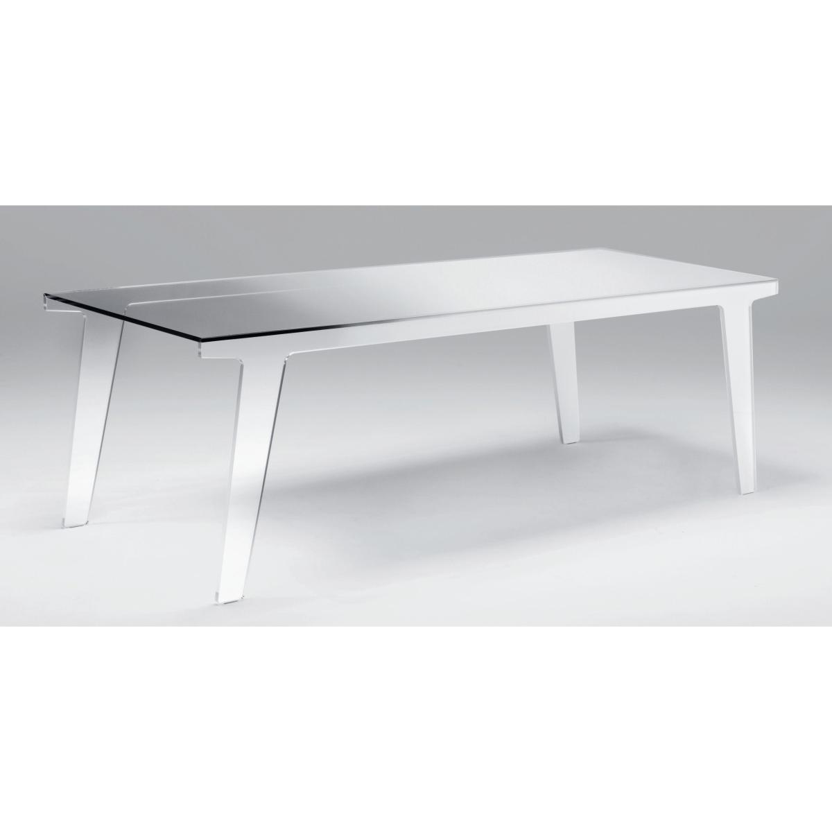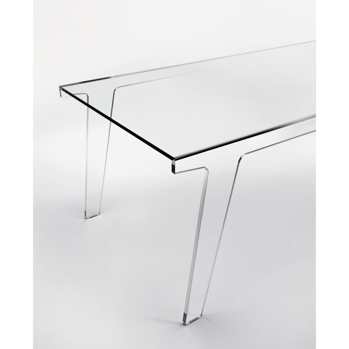 Monolithic table in transparent extralight glass with tempered top mm. 12 thick, and shaped feet mm. 19 thick. The feet and the top are glued together thanks to a special inclined grinding of the glass. One side of the table presents a white finish which gradually fades until it vanishes and becomes smoked at the other side. This sophisticated manufacturing process imparts a magical effect of evanescence to the piece. Available completely in transparent extralight glass too.