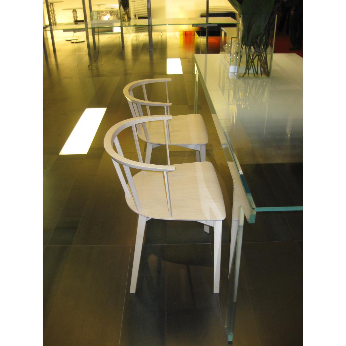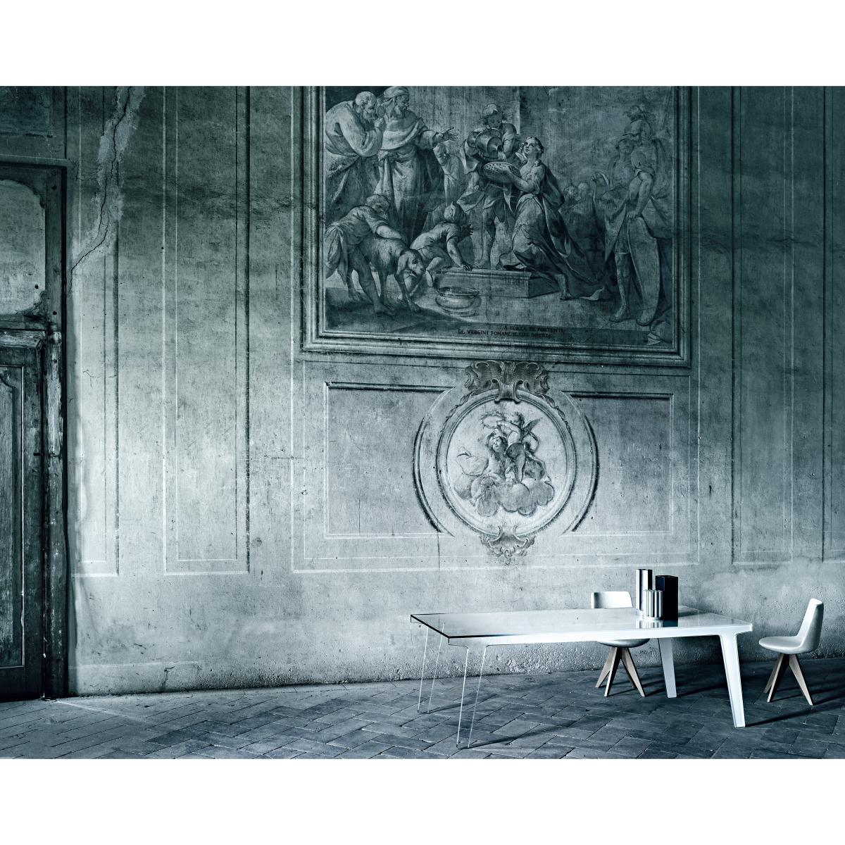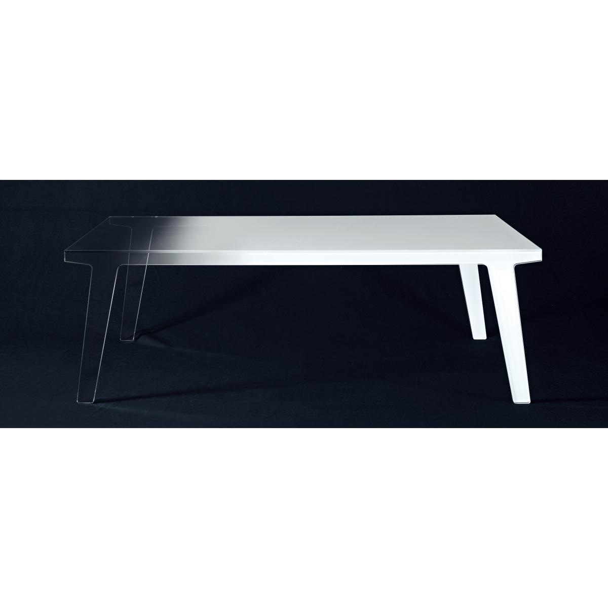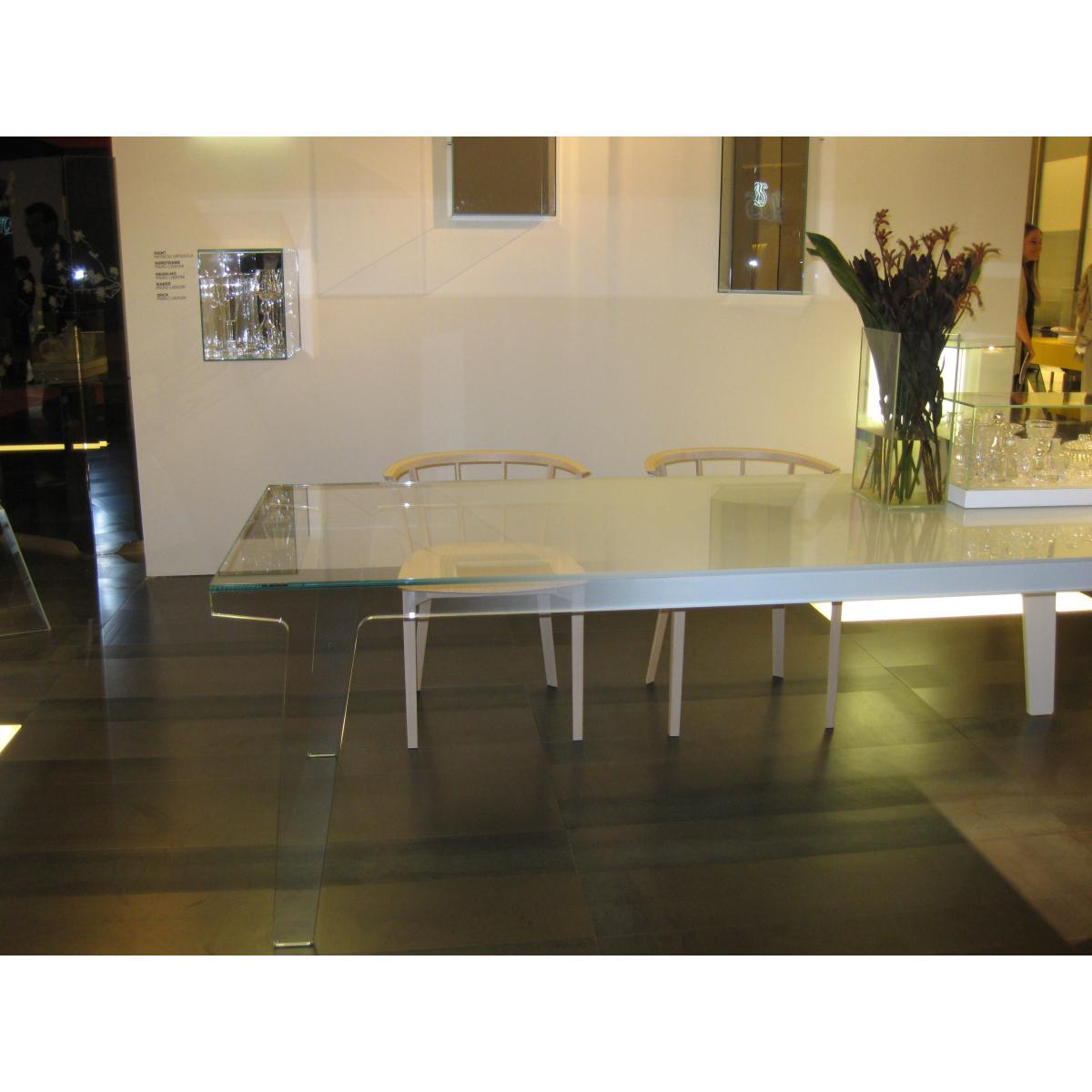 Monolithic table in tglass with tempered top mm. 12 thick, and shaped feet mm. 19 thick. The feet and the top are glued together thanks to a special inclined grinding of the glass. One side of the table presents a white finish which gradually fades until it vanishes and becomes smoked at the other side. This sophisticated manufacturing process imparts a magical effect of evanescence to the piece. Available completely in transparent extralight glass too.