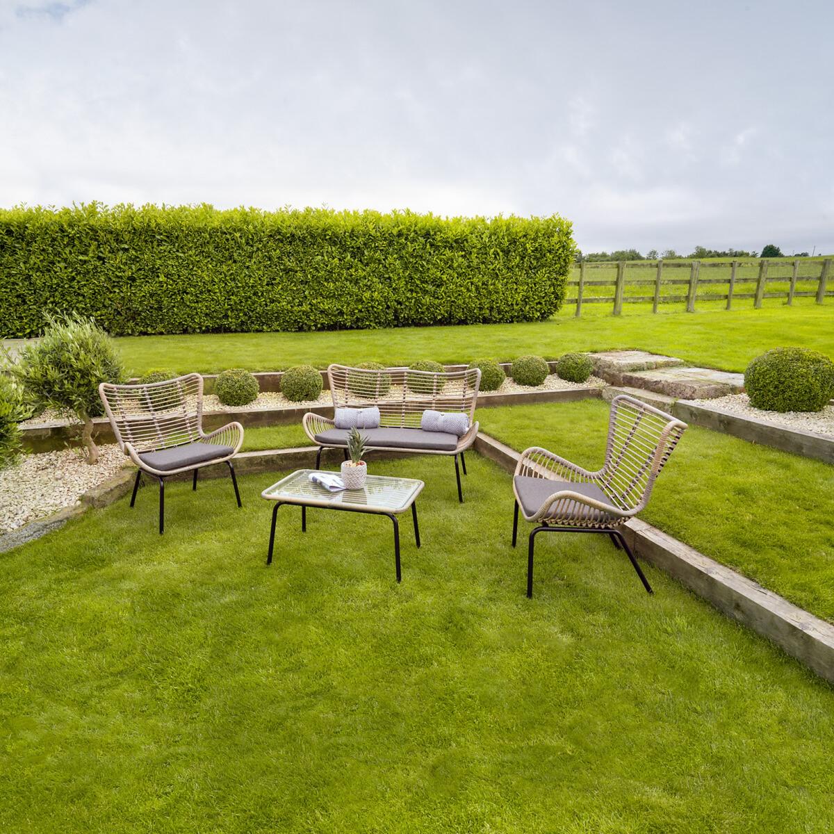 The Fairfield Seating Set has a compact design that is perfect for a smaller patio area or to sit neatly next to existing furniture. Including a two-seater sofa, two armchairs and a central coffee table. With a grey, mixed tone effect wicker, which gives it a natural feel, dark-toned cushions and a crisp dark metal frame, this set has a beautiful neutral finish. It is made from a flat PU wicker, matched with a powder-coated steel frame. The central table is topped with tempered clear glass, giving it a modern finish while making it easy to wipe clean. The high-quality materials ensure the set is durable and weatherproof making it virtually maintenance-free and long-lasting. All cushions are fire retardant; further ensuring that all details of this set are of the highest quality. Product Dimensions: Sofa: 122cmx71cmx86cm. Chair: 70cmx71cmx86cm. Coffee Table: 75cmx45cmx41.5cm. Packaged Dimensions: 124cmx 75cmx 61cm Weight: 34.1kg. Please note this item is a large piece of furniture that will require some self assembly. Please ensure you have space to receive delivery. This item can be delivered to all UK Mainland postcodes with the exception of the following postcodes starting with; AB, BT, DD, IV, KW1-14, PA21-38, PH, TR17-27 & ALL ROI.This product will be dispatched by one of our trusted suppliers. You’ll be contacted by their selected courier about your delivery.