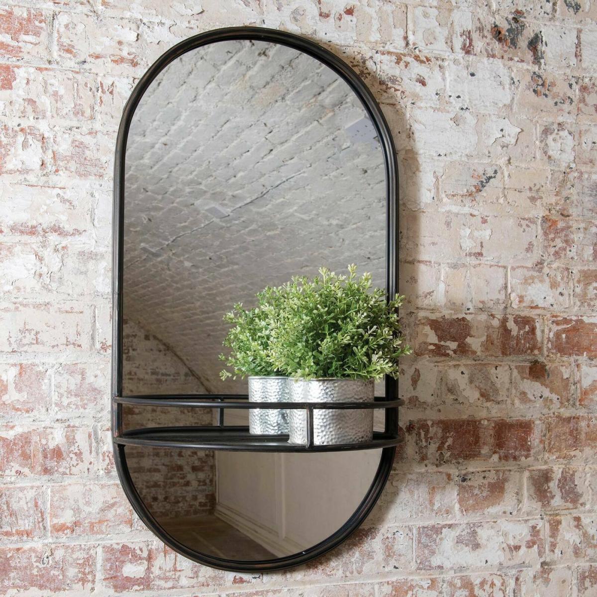 A minimalist oval mirror with a distressed finish and a small shelf perfect for holding jewellery or your beauty essentials.