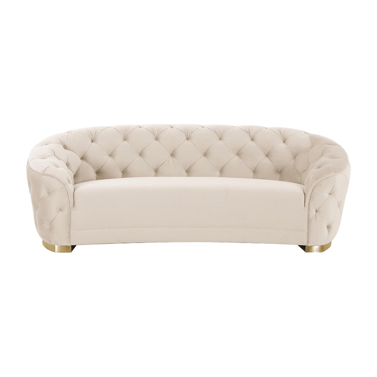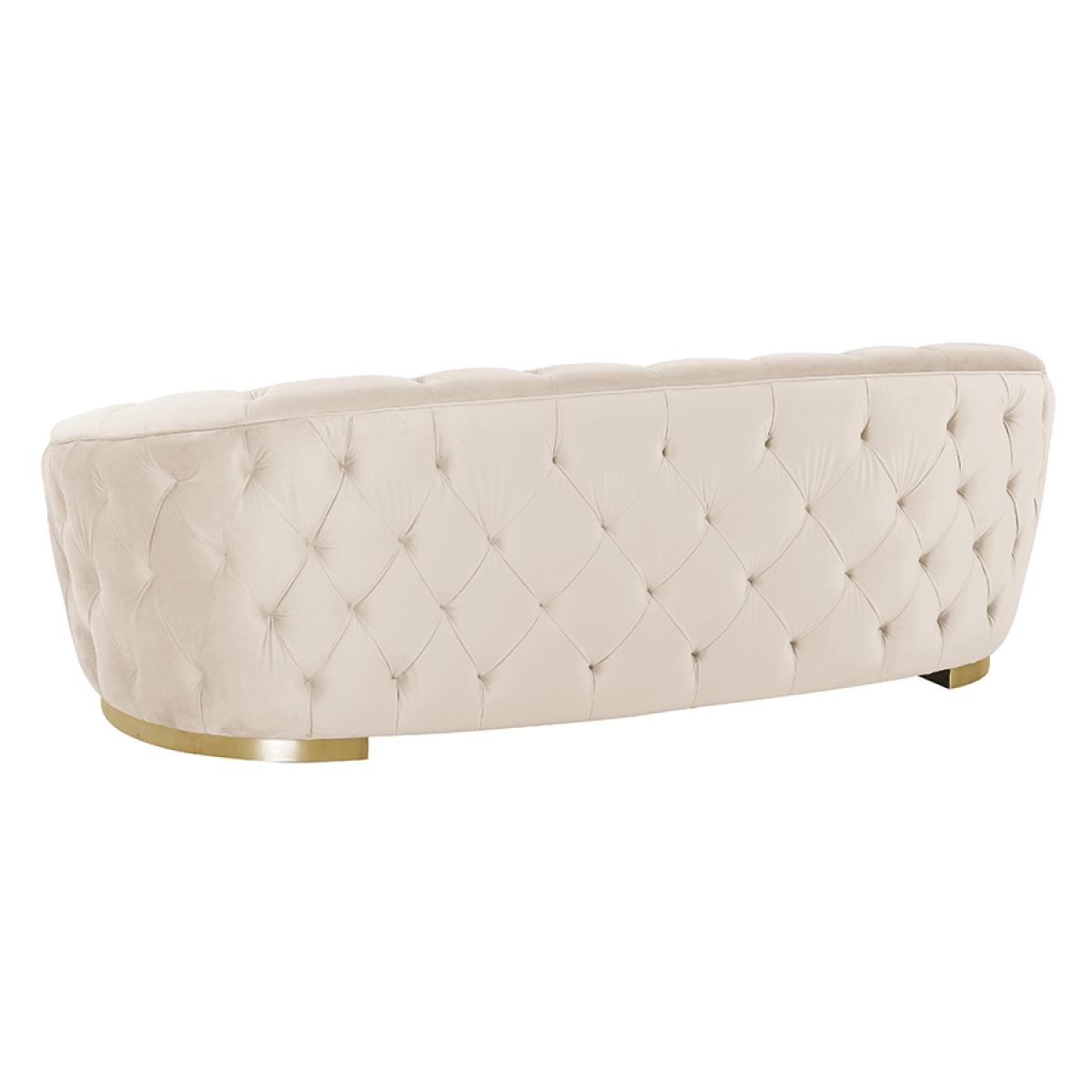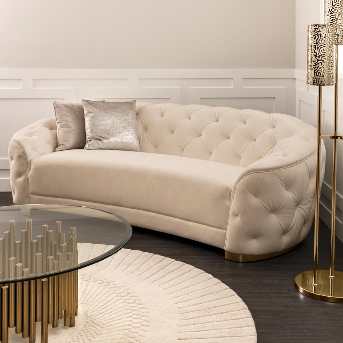 Contemporary buttoned sofa with fixed seat and backrest. Generous, deep foam and fibre filling. Sprung seat and backrest for maximum comfort. Brushed steel plinth with brass finish. Velvet upholstery fabric. Free returns on sofas if you change your mind within 7 days. Simply notify us, put the sofa back in the box, and we will collect it and send you a full refund. (This offer excludes Scottish highlands and islands & any Ireland addresses).