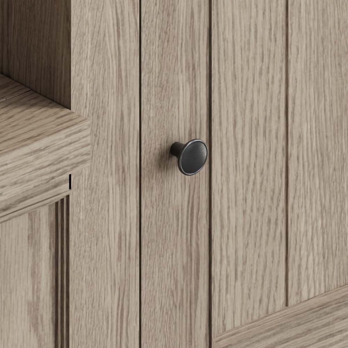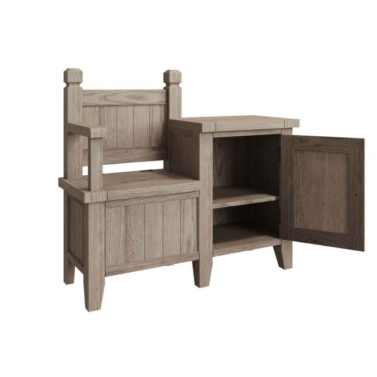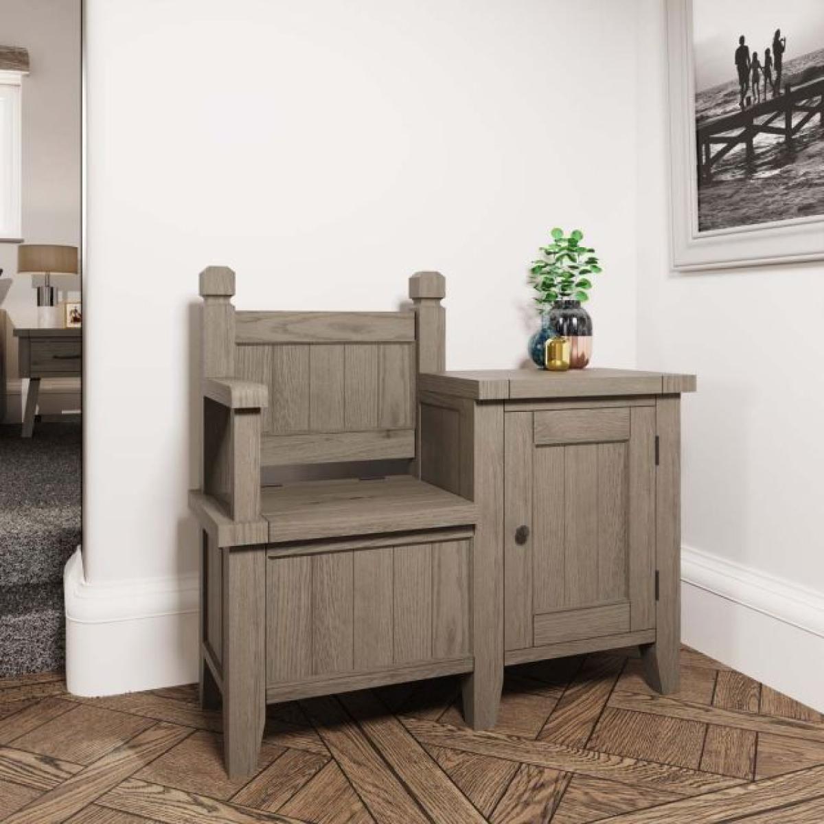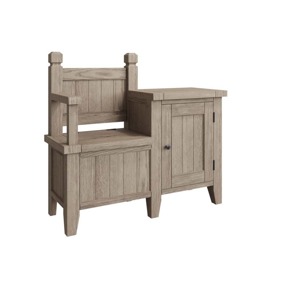 The Fairford Monks Bench is unique piece with a design steeped in history. The bench combines a seat with arms, and a storage unit to the side, and even inside the seat - accessed by lifting the hinged seat. Absolutely perfect for the hallway as a shoe storage area with a seat to rest in while putting on or taking off your wellies! Designed in a rustic style with it's signature Fairford grey wash, and constructed from solid oak and oak veneers, the unit is swathed in u-groove detailing.