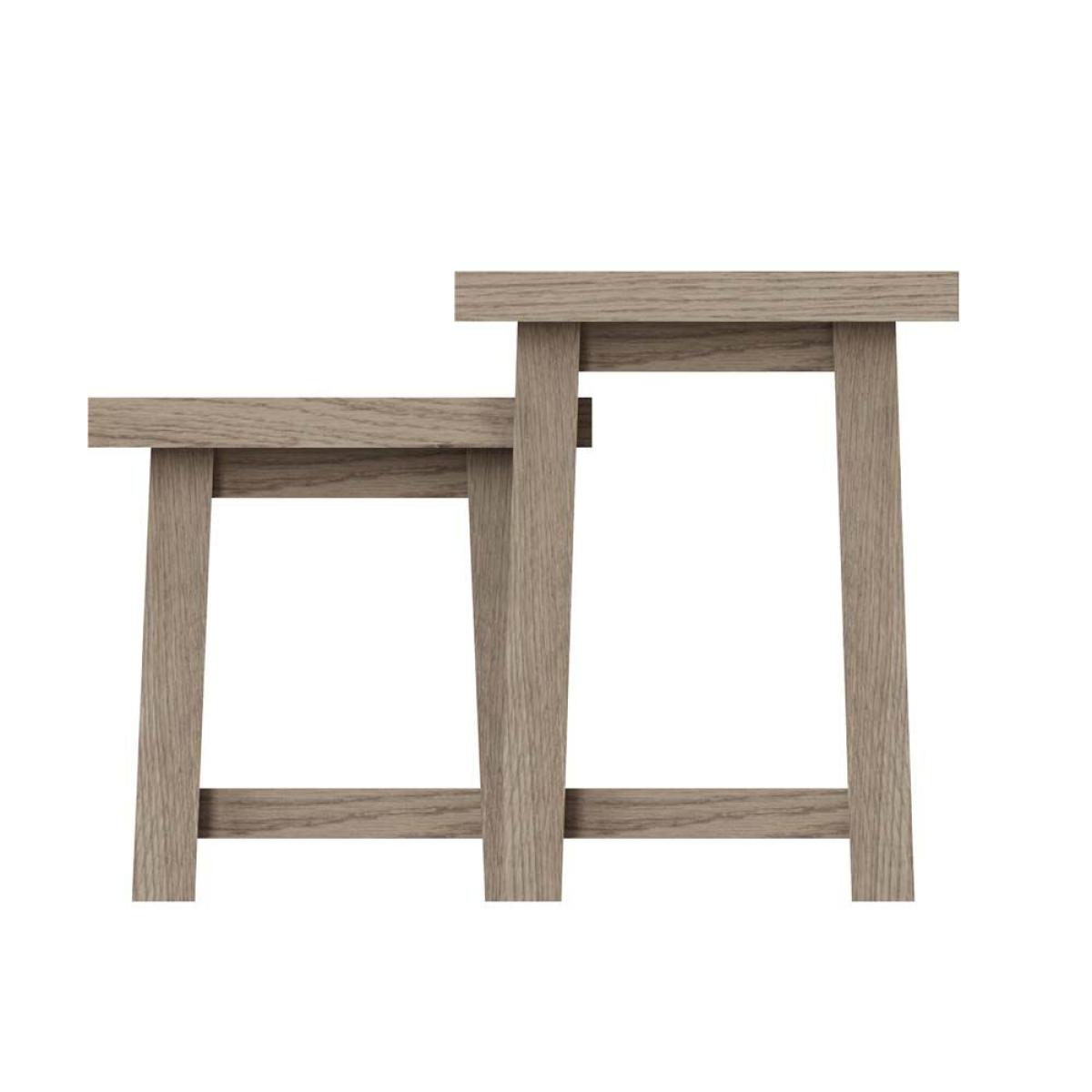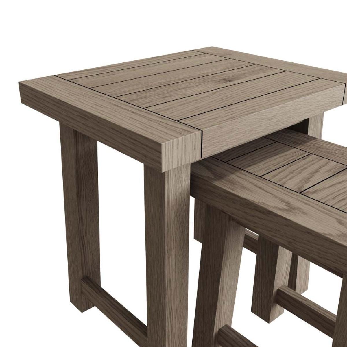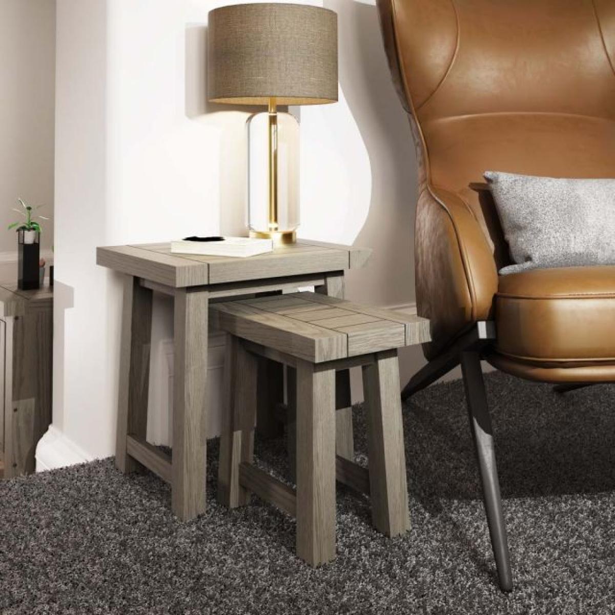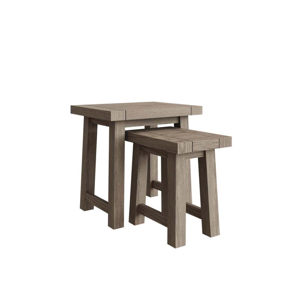The Fairford Nest of 2 Tables is a great space saving solution for the sitting room. Featuring two tables that nest inside each other when not in use, it's a lovely way to provide more surface area in the sitting room when you need it. Designed in a rustic style with it's signature Fairford grey wash, constructed from solid oak and oak veneers. The tops of the nested tables feature u-groove detailing.