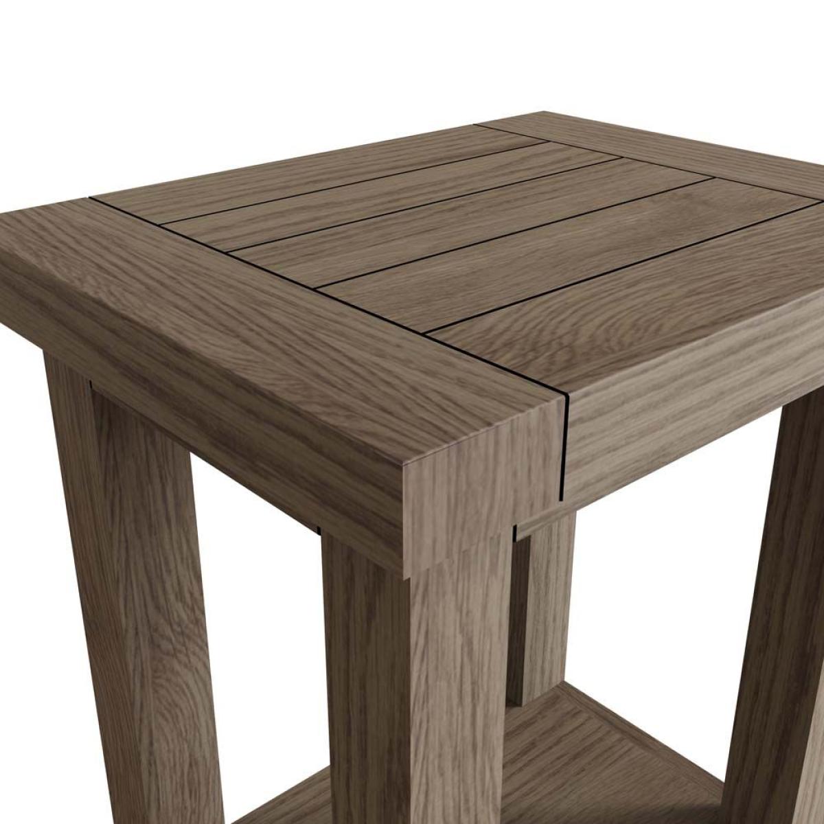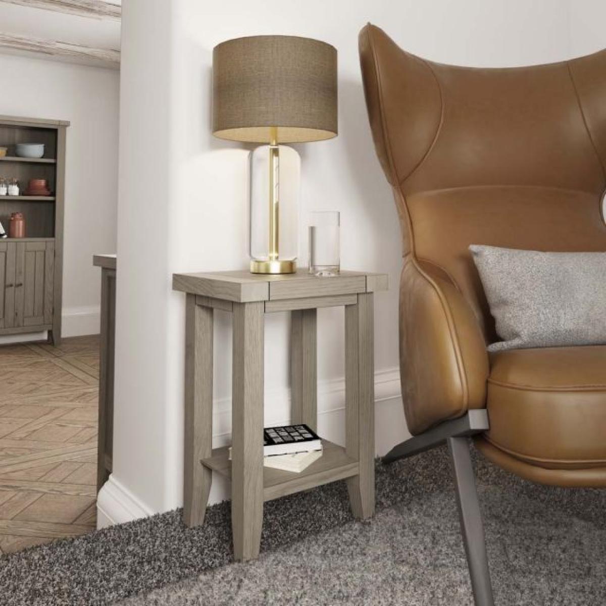 The Fairford Side Table is a great addition to the end of your sofa, or near your favourite armchair. Perfect to perch a cup of tea on or a decent book. The sidetable features a low shelf and a narrow footprint which is great when short on space. The side table is designed in the rustic style with it's signature Fairford grey wash, and is constructed from solid oak and oak veneers. The top of the side table features u-groove detailing.
