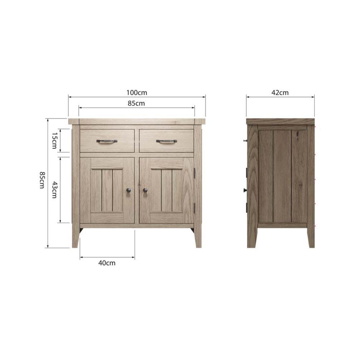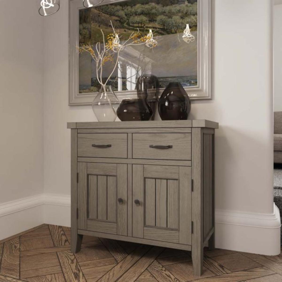 The Fairford Standard Sideboard is great for smaller dining spaces but slightly more generous in size than the small sideboard in the same range. A solid storage solution with two large drawers and two cuboard doors that open to reveal a shelved space within. The sideboard is the perfect marriage of traditional stying with a rustic edge, featuring a gorgeous grey wash that really brings out the wood grains of the solid oak and oak veneers that have been used to construct the unit. This sideboard also acts as a base for the various display tops also available separately. The top and sides are contoured with u-grooves to give the impression of a plankpanelled construction, and the sideboard is finished with pewter handles. Dimensions: W100cm x H85cm x D42cm. Built from oak and oak veneers. Two drawers. Two doors. Shelf inside. Pewter handles. Simple Self Assembly