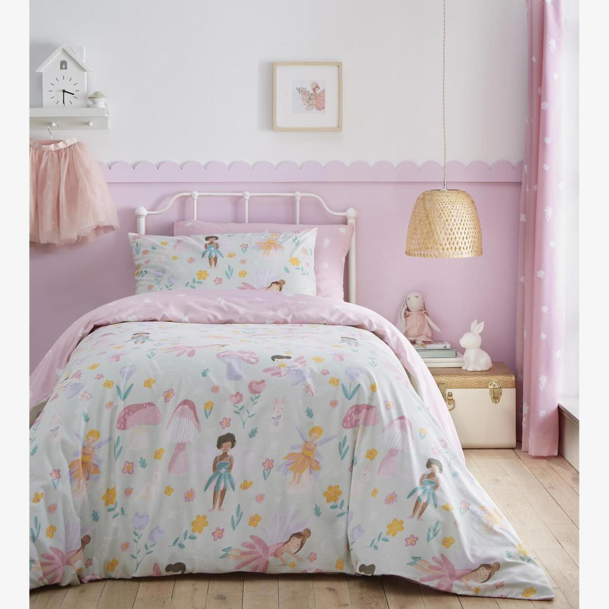 Transform bedtime into a thrilling adventure for your child. With pastel hues and fairy motifs, this bedding will excite and capture imagination. Comfort will last all night within this soft duvet cover. Life will be made effortless with this easy care quilt covered in stunning fairies. This design is fully reversible with the other side showcasing a pastel pink design topped with white flowers. Materials 52 Polyester, 48 Cotton. Care instructions Machine Washable.
