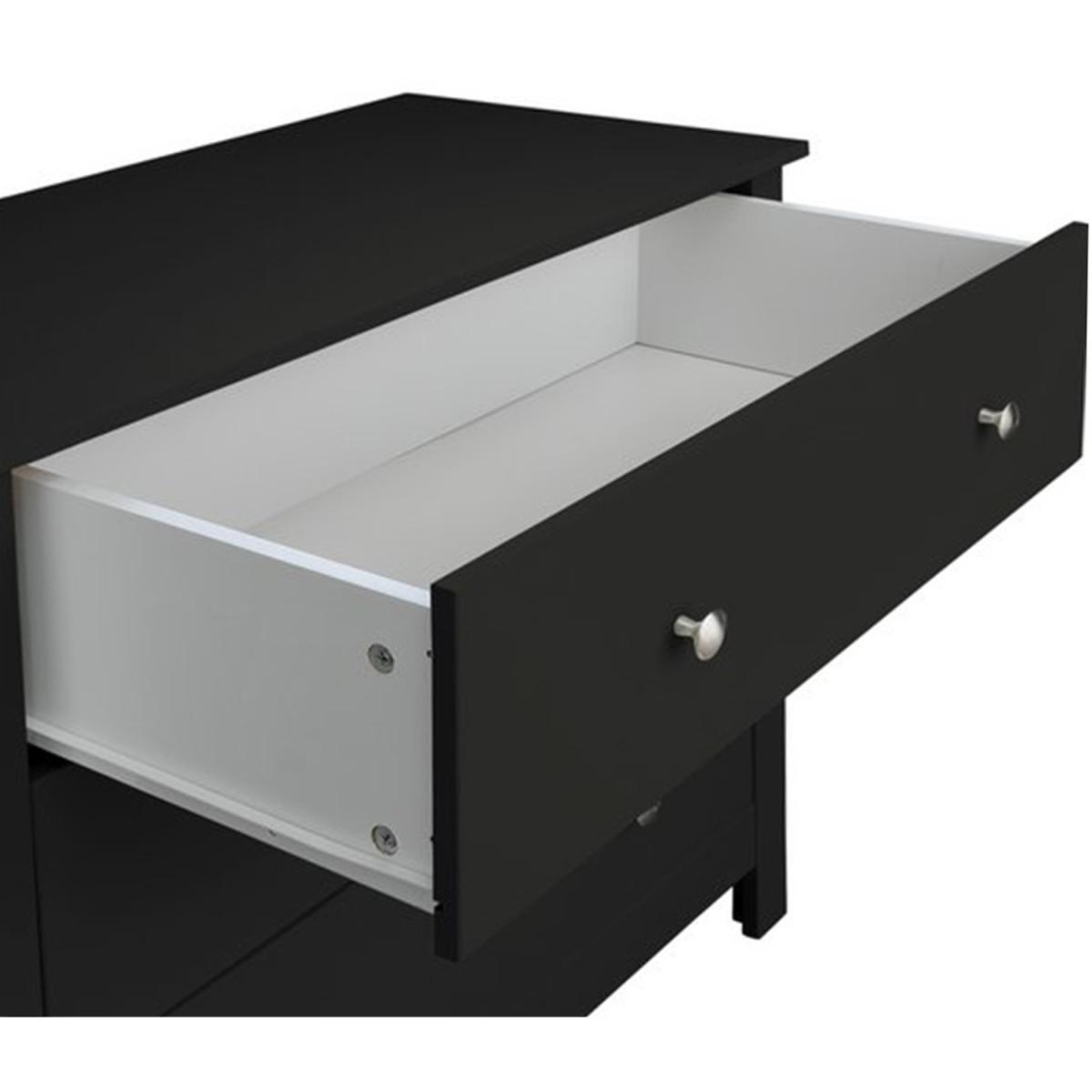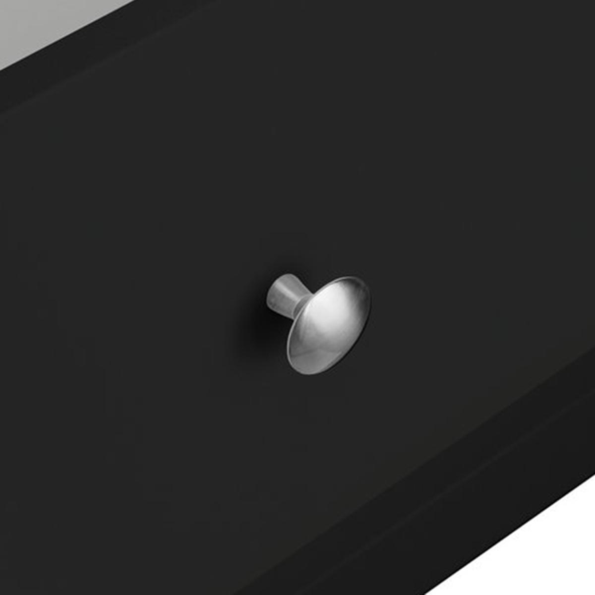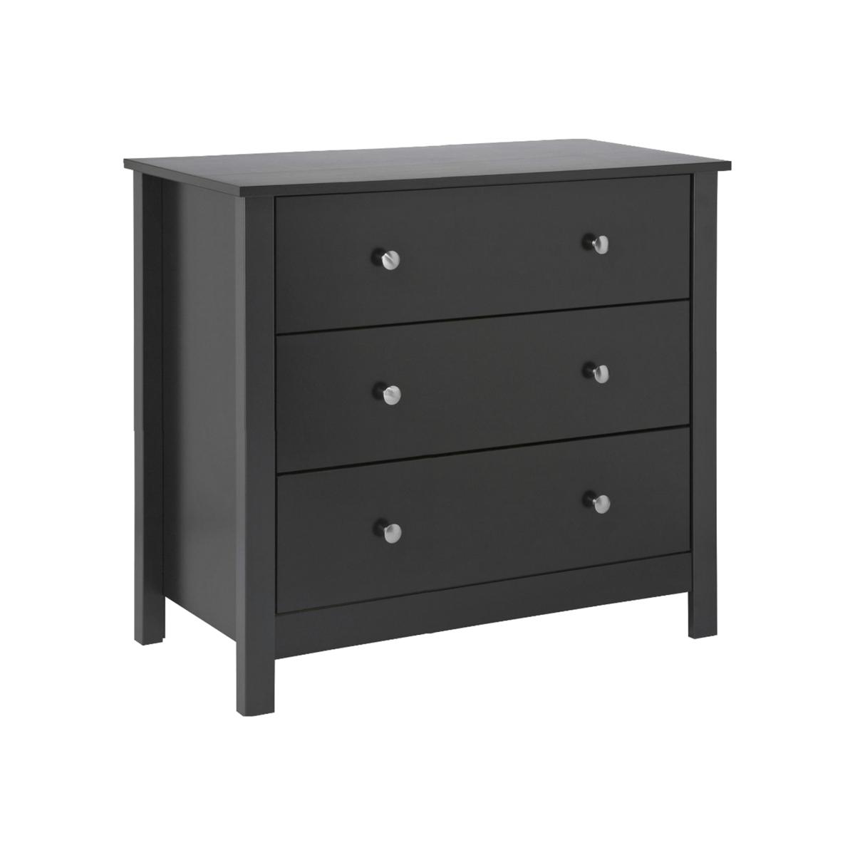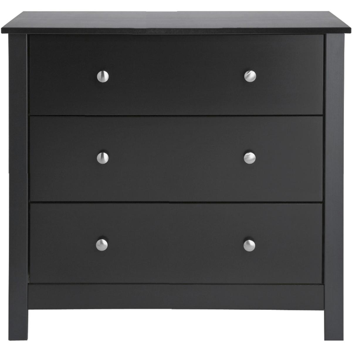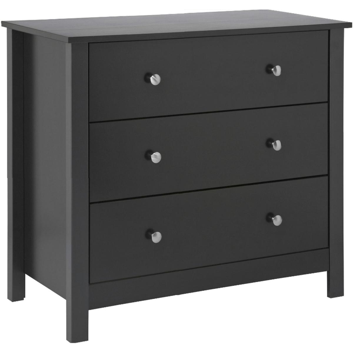 Chest with 3 drawers in Black in attractive black MDF is an elegant space-saving storage solution for the bedroom with generous deep drawers. The wide top gives plenty of space to put the family pictures and prized ornaments on, the 3 easy gliding drawers offer plenty of storage space and are complemented by the stylish metal handles. Modern shaker design in solid black MDF and finished with a smooth lacquer making this an attractive choice for any bedroom. For a single bedroom why not add our matching bedsides and 2 drawer wardrobe.
