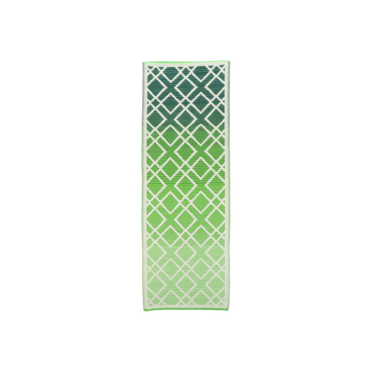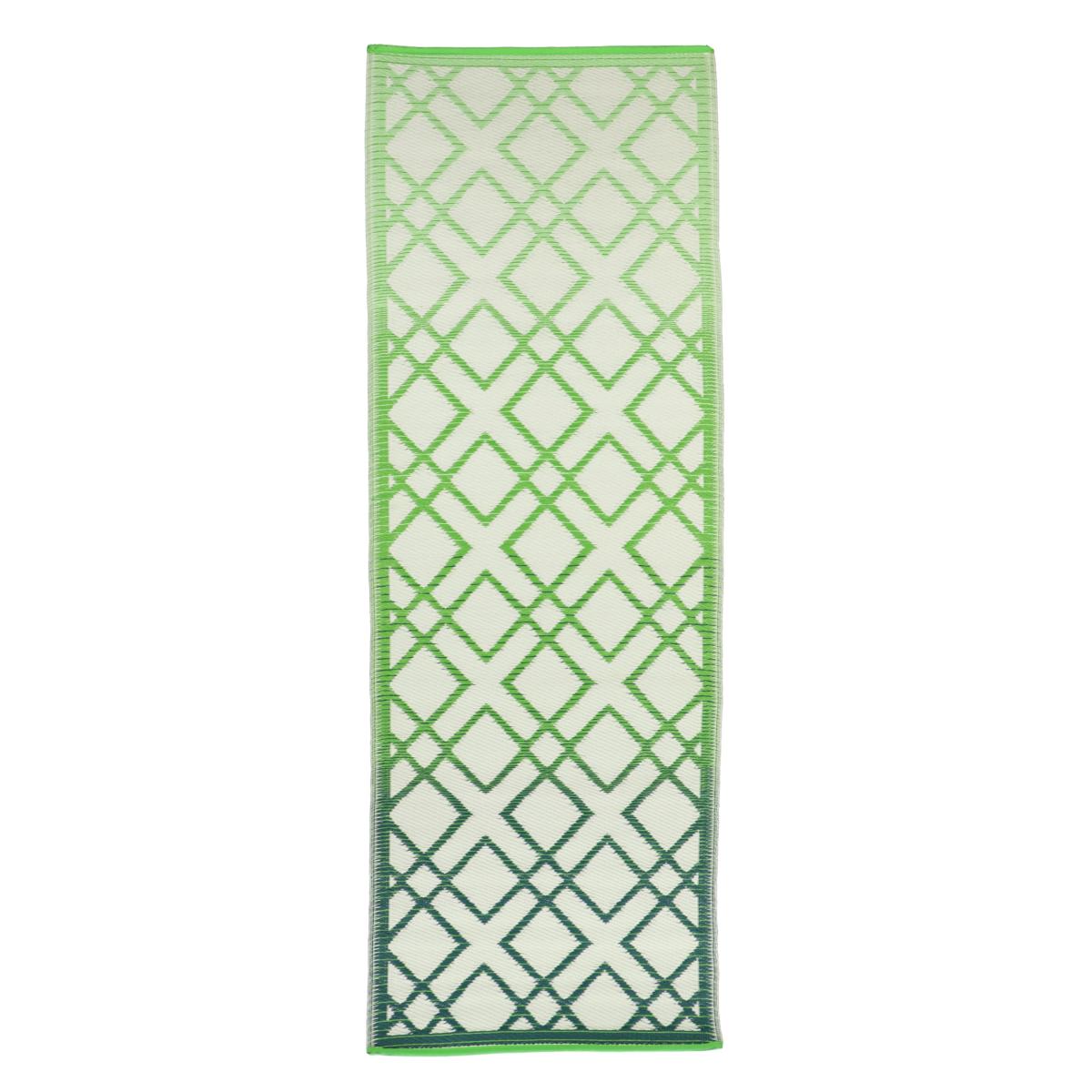 * Suitable for indoor and outdoor use* Easy to clean* Water-permeable* Reversible design The Fallen Fruits Floating Pattern Balcony Runner is an easy-to-clean, water-permeable rug with a reversible design. Featuring a geometric pattern in an ombre green colour, it adds a touch of style to your balcony or patio while offering practicality for outdoor use.