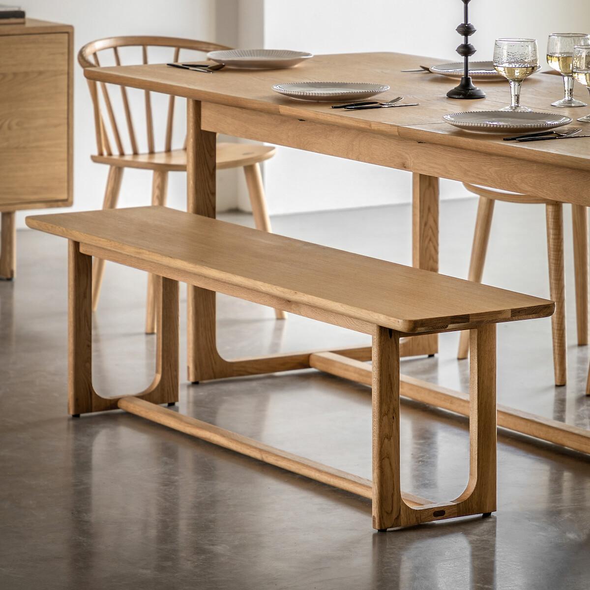 Crafted from the finest oak and structural oak veneers, this stunning dining bench offers a super elegant design, with its simple top and beautifully shaped underframe. The wood has a beautifully natural finish which highlights the graining. A classic which is sure to fit in any dining room. Product Details • Seats 3 • Made from oak - a durable long lasting wood with an attractive grain • Oak is highly resistant to wear and tear and with good water resistant properties, meaning it can easily stand up to the demands of every day life and will look good for years to come. • Partial assembly required - legs/feet only. Product Composition - Oak 90% / Oak Veneered MDF 10% Product Dimensions - 38 cm x165 cm x45 cm , Weight - 15 KGSeat Height - 45 cm. Seat Width between arms - 165 cm. Seat Depth - 38 cm Leg / Feet Height - 42 cm Clearance to Floor - 42 cm Package Dimensions - 172 cm x 45 cm x 16 cm, Weight 18 kg. This product will be dispatched by one of our trusted suppliers. You’ll be contacted by their selected courier about your delivery. Please note: this product cannot be delivered to all Offshore Islands, Northern Ireland or Republic of Ireland. GALLE01