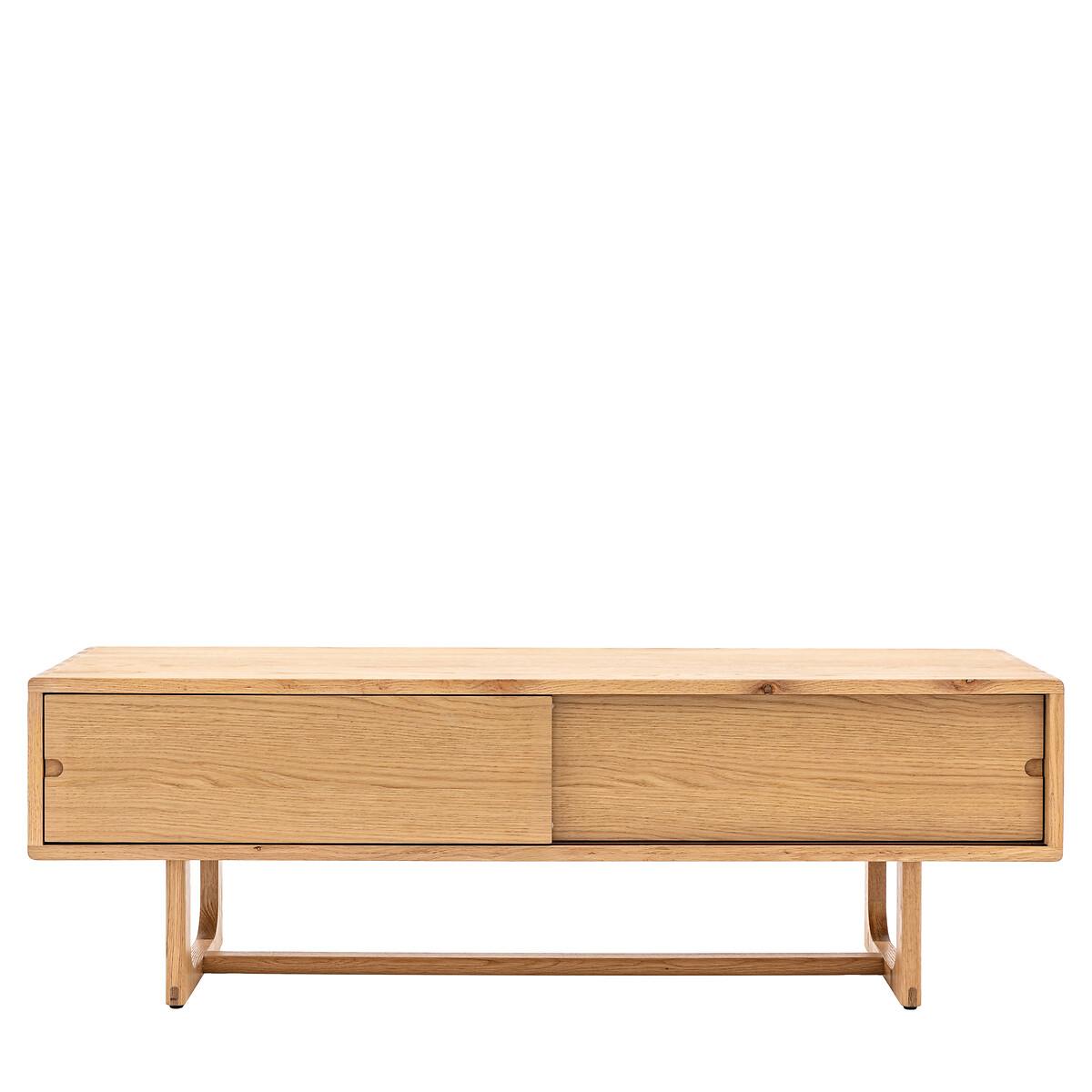 With its cut-out handles on the sliding doors and beautifully shaped underframe, this gorgeous media unit is practical as it is beautiful. It is crafted from solid oak and oak veneers and completed with a warm honeyed finish which highlights the natural grain of the wood. Finger joints on the corners of the piece, a technique found on high quality cabinetry, give strength and a sense of purpose and tradition to create long-lasting, legacy furniture that can be collected and handed down through generations. Product details • Made from oak - a durable long lasting wood with an attractive grain • Oak is highly resistant to wear and tear and with good water resistant properties, meaning it can easily stand up to the demands of every day life and will look good for years to come. • Recommended for use with TVs up to size 55" • Recessed handles • 2 door storage with single inner compartment • Slide door action • Cable openings • Finger jointed corners • Maximum load weight - 50 KG • Partial assembly required (legs/feet only) Product Composition - Oak 60% / Oak Veneered MDF 40% Product Dimensions - 40 cm x 45 cm x 140 cm , Weight - 33.5 KGInternal compartment dimension - W66.9 x D36.4 x H20.6 cm. Leg/feet height - 20 cm Clearance to floor - 20 cm Package Dimensions - 146 cm x 46 cm x 40 cm, Weight 38 kg. This product will be dispatched by one of our trusted suppliers. You’ll be contacted by their selected courier about your delivery. Please note: this product cannot be delivered to all Offshore Islands, Northern Ireland or Republic of Ireland. GALLE01