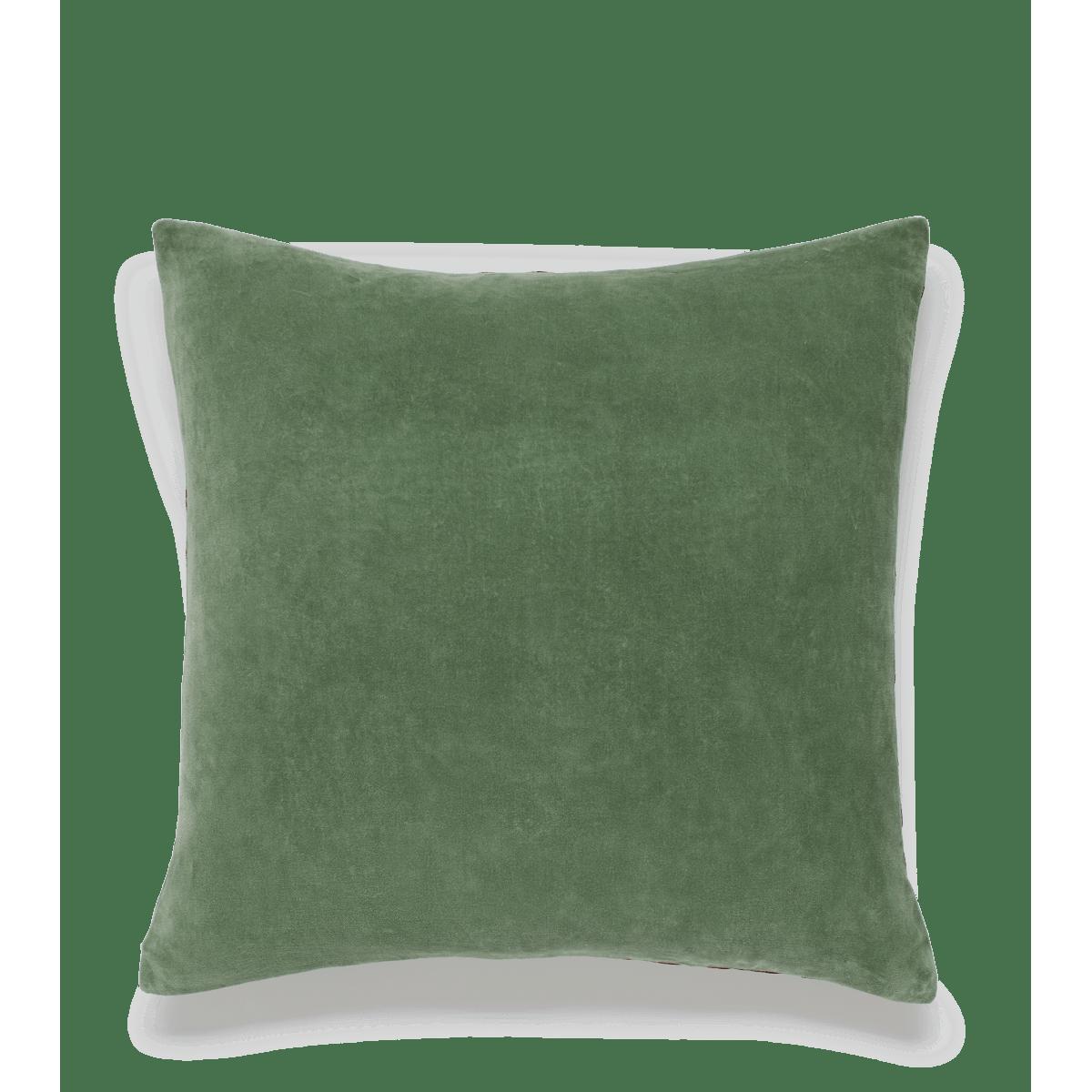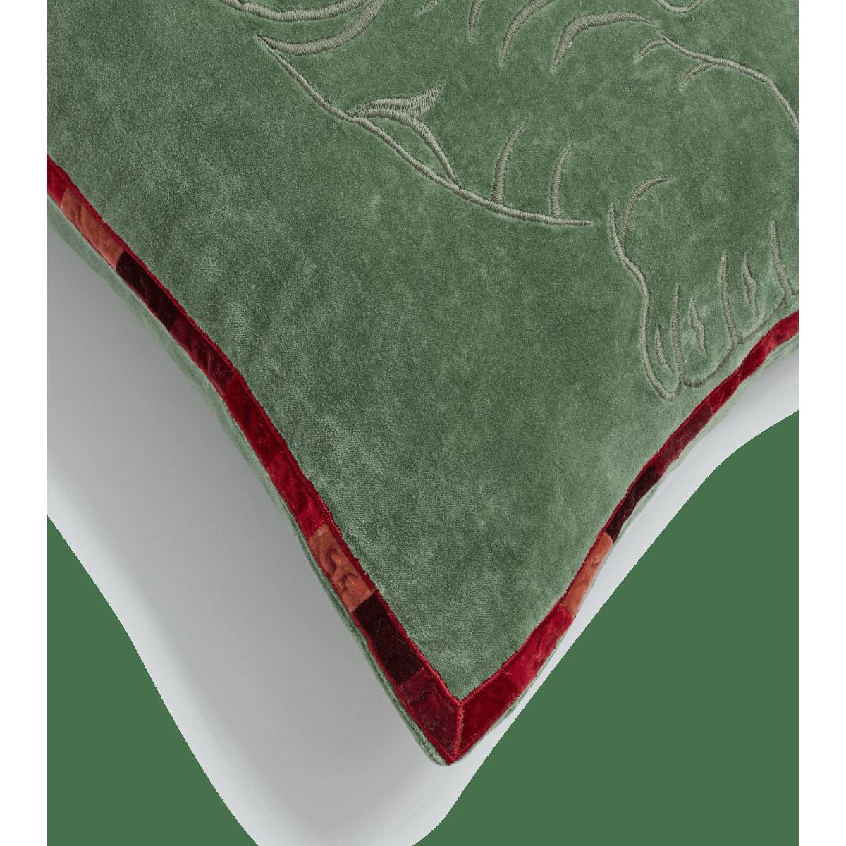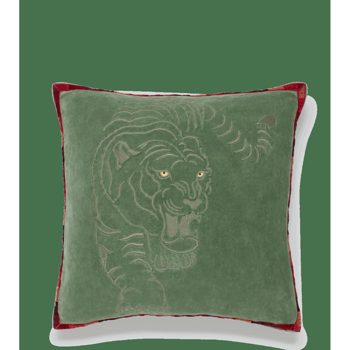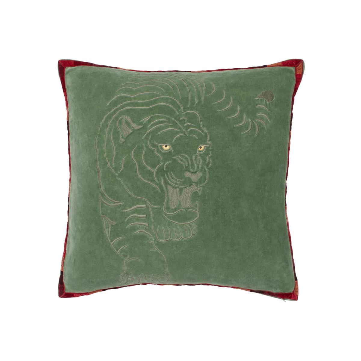 Glowing, golden tiger eyes gaze out from the subtle embroidery of our Famba Tiger Cushion Cover. Its design is first traced onto the soft, sage-green velvet, before being embroidered, then framed by a trim in stripes of complementary reds and oranges.