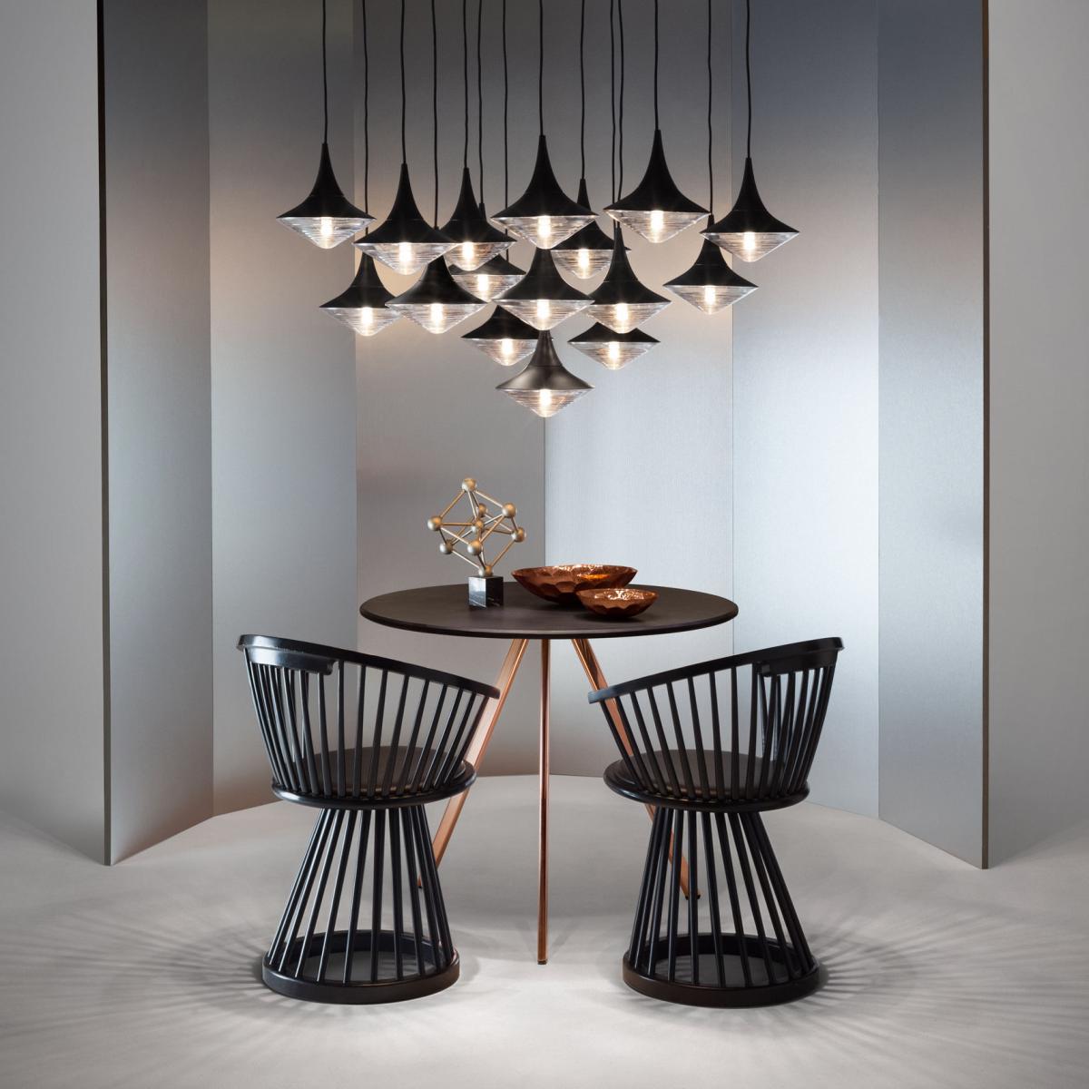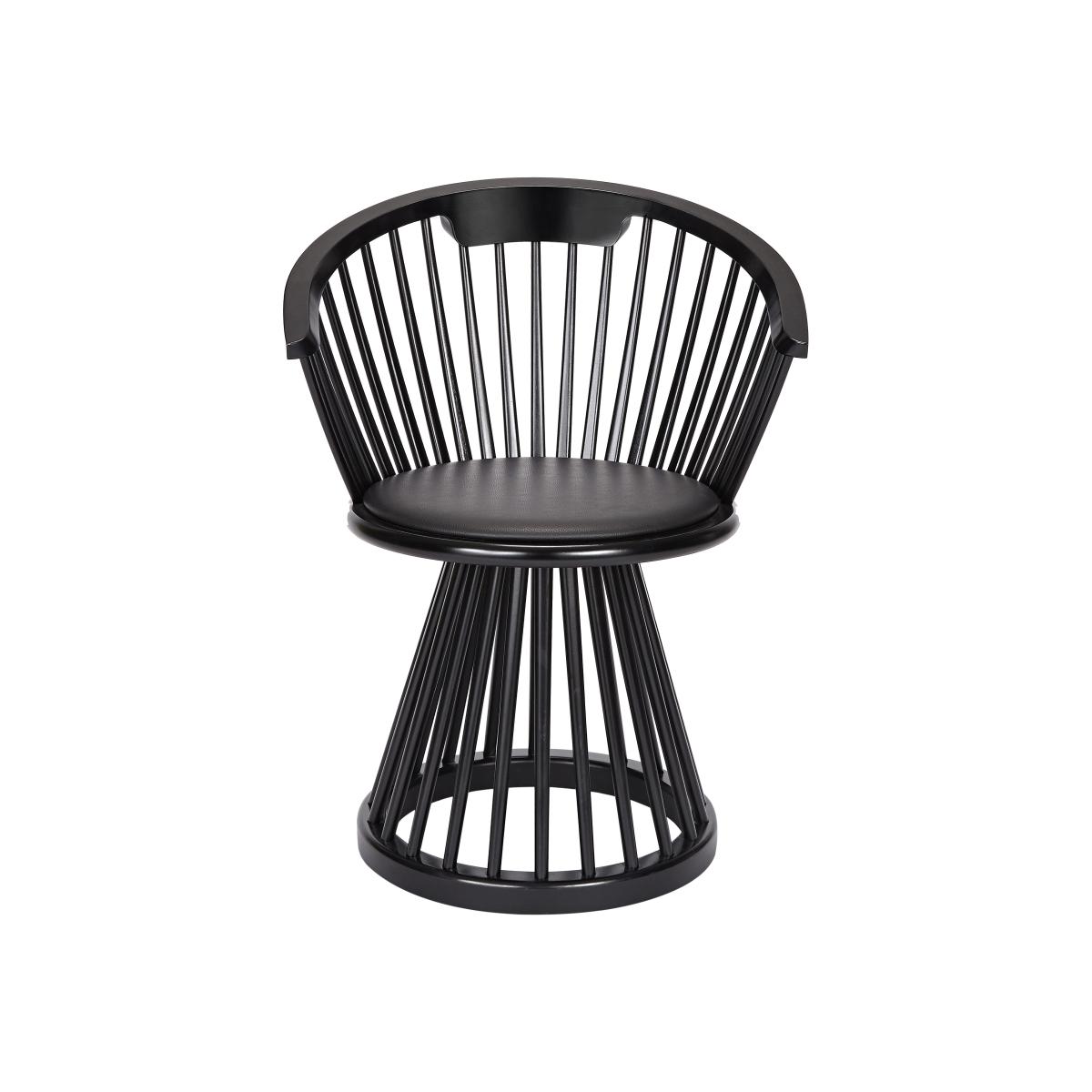 Tom Dixon is one of the most original British designers of his generation. He proves it once again with the Fan collection, which revisits the classic Windsor bar chair, which was extremely en vogue in the 18th Century. Tom Dixon enhances this British archetype by giving it new proportions and uses with stunning elegance. We love the spectacular and highly graphic effect of this sculptural piece, based on the repetition of wooden bars. The simple and graphic lines of the Fan stool demonstrate exceptional woodworking. The birch is carefully split into stems that are turned, tapered down and stem-bent. The assembly of poles produces a balanced and wonderfully graceful openwork structure. The seat of this armchair is upholstered in black leather.