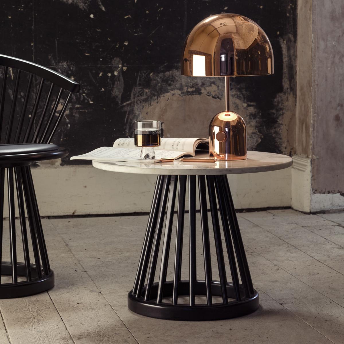 Tom Dixon is one of the most original British designers of his generation. He proves it once again with the Fan collection, which revisits the classic Windsor bar chair, which was extremely en vogue in the 18th Century. We love the spectacular and highly graphic effect of the base on this coffee table: a sculptural assembly based on the repetition of wooden bars. The birch is carefully split into stems that are turned, tapered down and stem-bent. The assembly of poles produces a balanced and wonderfully graceful openwork structure. The simple and graphic lines of the base highlight the stunning marble tabletop.