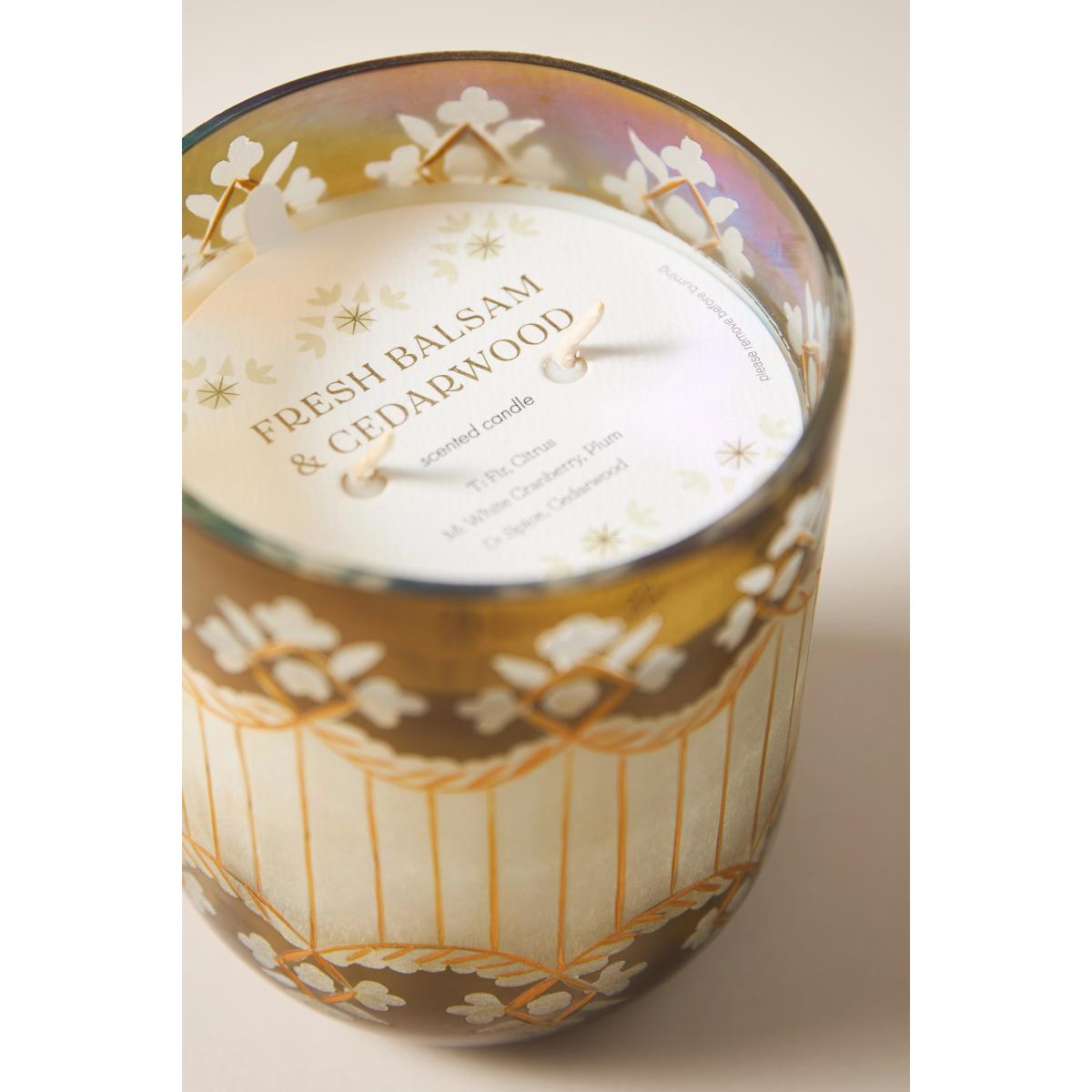 Fresh Balsam & Cedarwood (Woody): The enticing scent of freshly cut evergreen adorned with effervescent citrus, sparkling white cranberry and sugared plums over an appealing background of frosted cedarwood. For the best burn experience, keep the following in mind: The first time you light your candle, allow it to burn until the wax pool melts all the way to the edge; for a larger candle, this may take several hours. Wax has " memory," so if it is extinguished with a partial pool, that will prevent a full, even pool from forming in the future. Trim your wick each time you light the candle, removing any " bloom" from the previous burn. We recommend lighting a wick that is 1/4-1/2" in length. Ensure that your candle is placed on a heat-safe surface. Do not allow wick trimmings, dust, or other materials to accumulate in the wax pool. To ensure safety and longevity, be sure to check the bottom of your candle for additional instructions, including details on when to discontinue use. Fana Woody Fresh Balsam & Cedarwood Glass Candle by Anthropologie Size: Large
