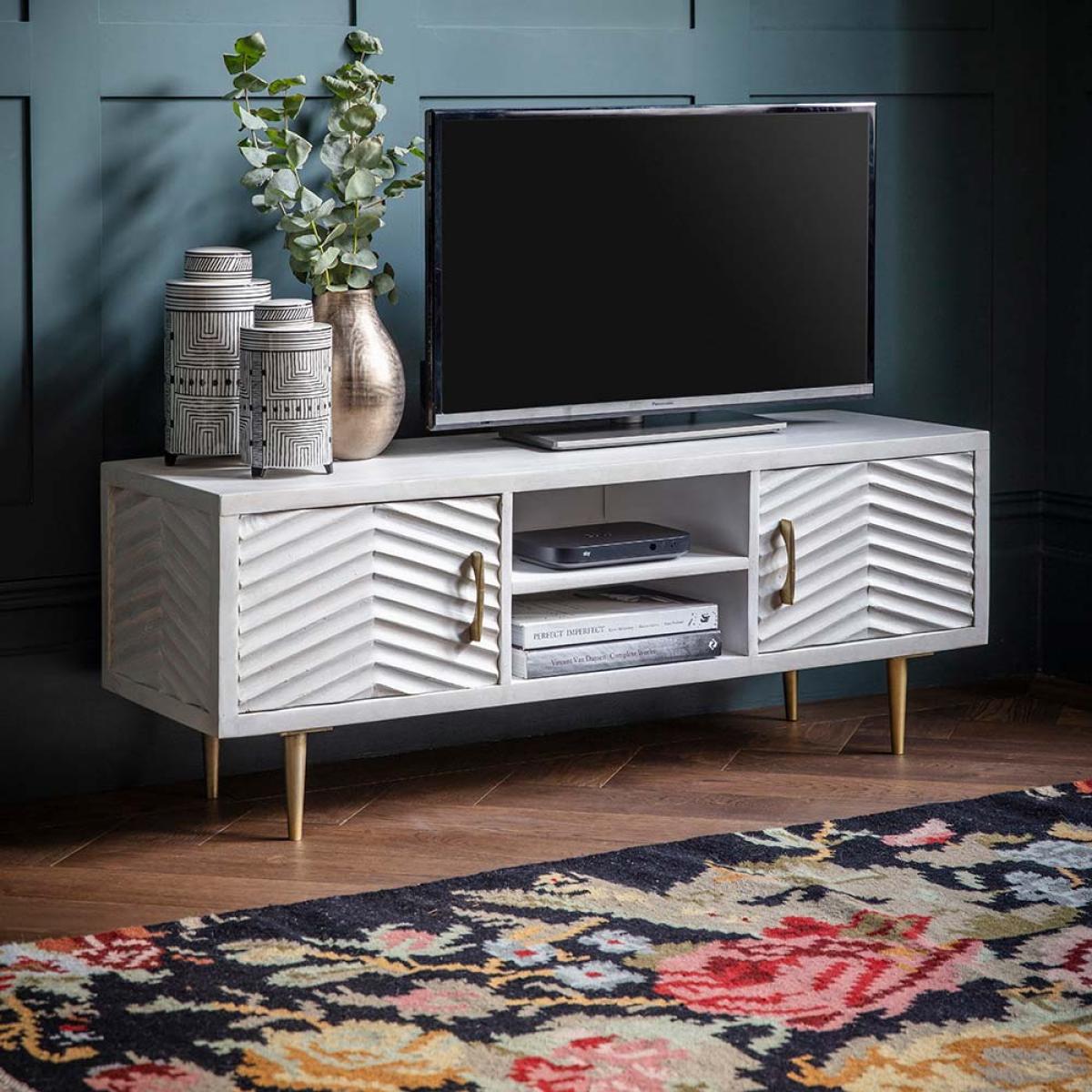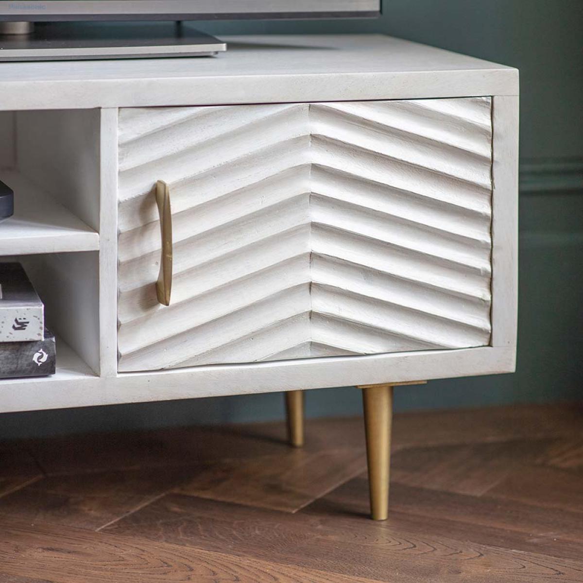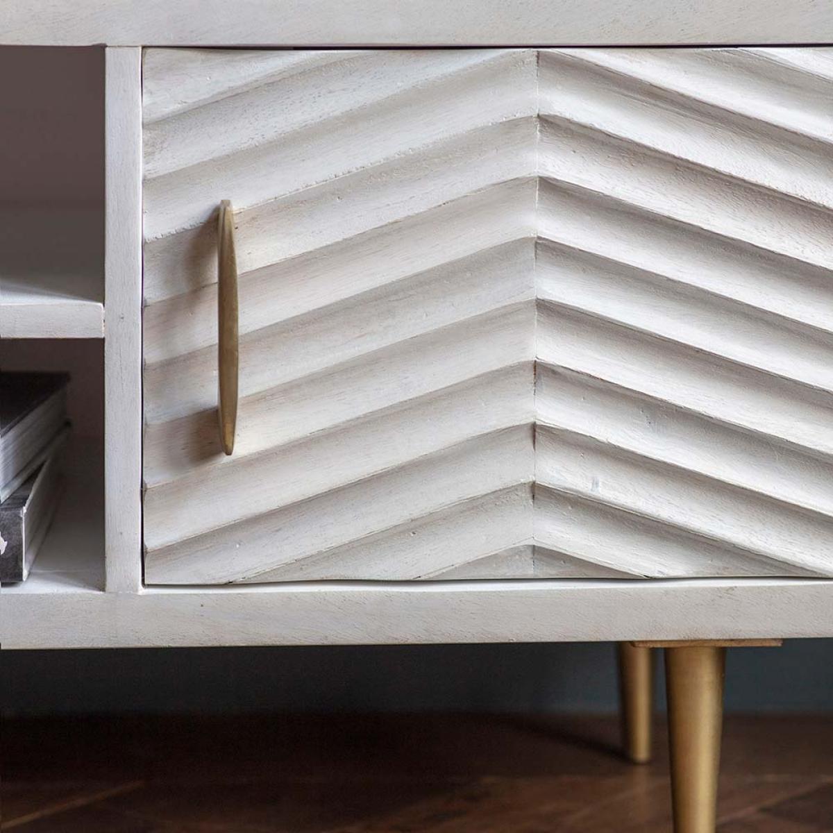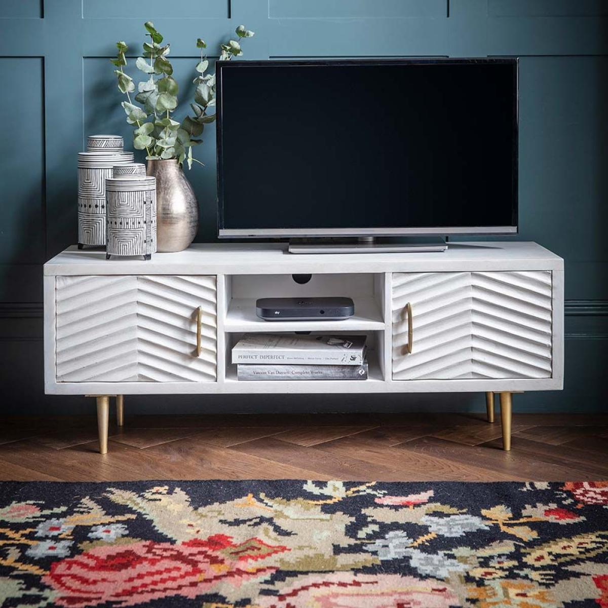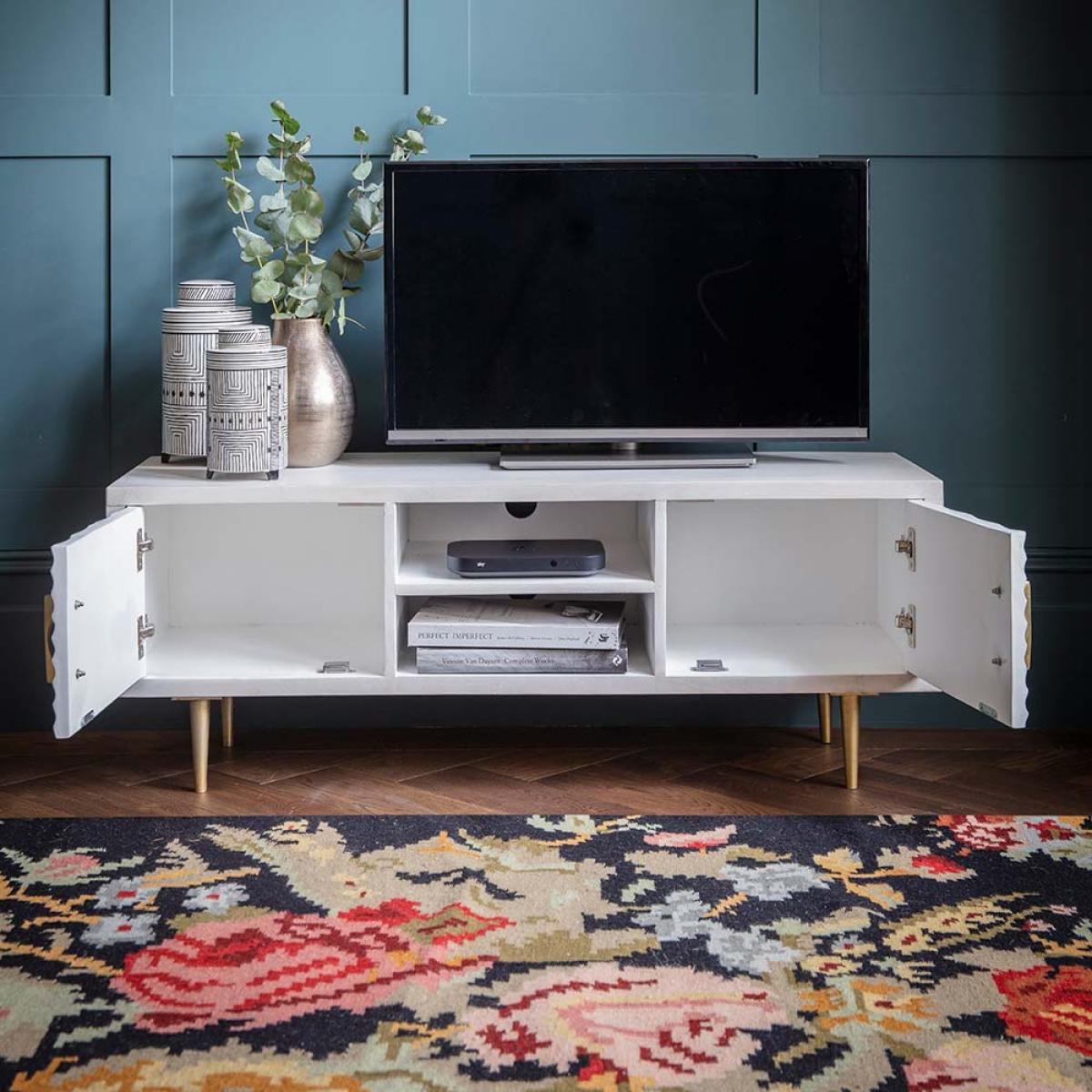 A smart media unit is a must for keeping all your TV, music and online games equipment in one place. With open and closed door storage for easy access, our Fandango Media Unit has a distinctive whitewashed mango wood finish with brass-plated legs and handles for a stunning luxury detail.