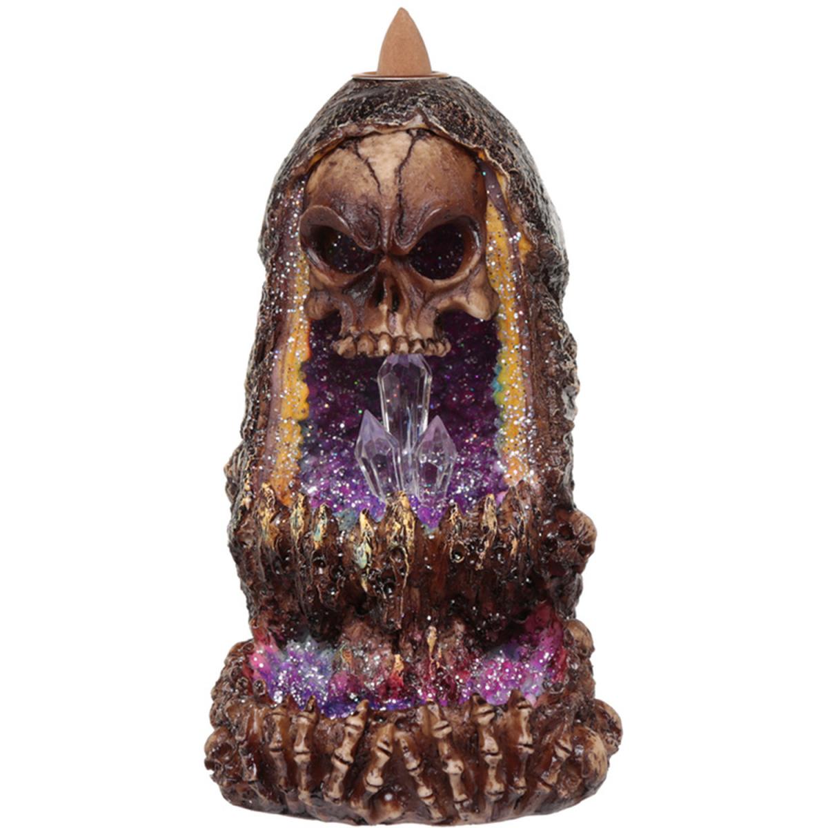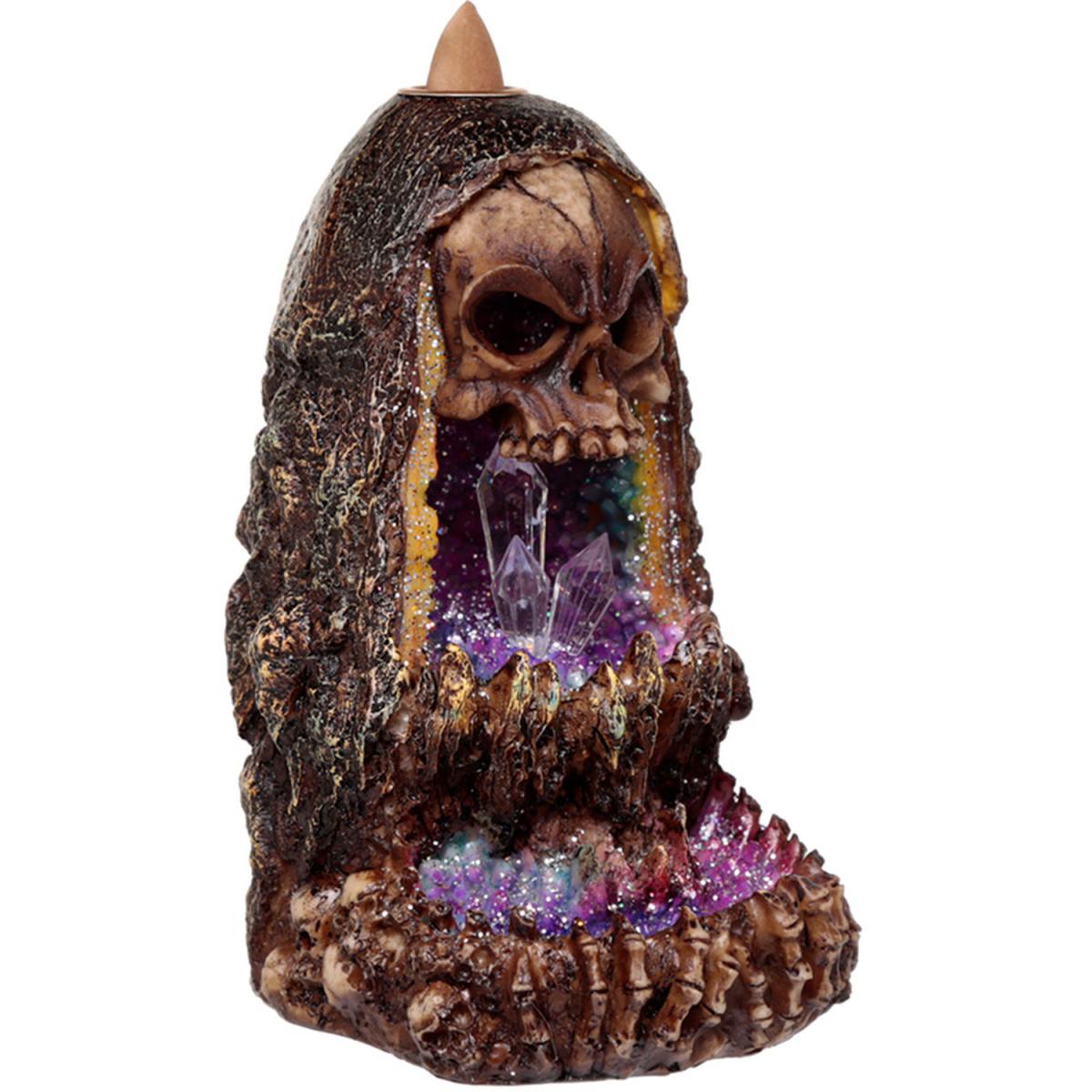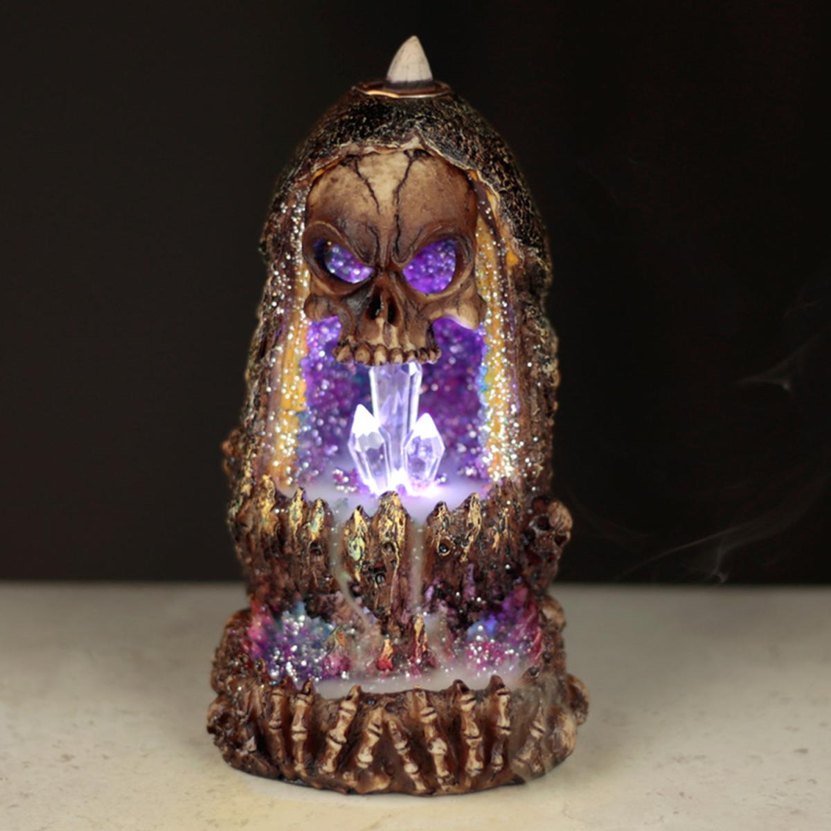 Incense burners are a fantastic item to have in your home whether you use them for burning incense or as a decorative centrepiece. Made from resin and plastic with a metal incense holder, backflow incense burners are easy to use but can only be used with backflow incense. Backflow incense creates a smoke that flows down, over, and through the incense burner, creating a misty waterfall effect. The burner has been designed to channel this smoke in a decorative way that enhances the design of the product. This burner also has an LED effect, which requires 2 AA batteries which are not included. The natural resins in backflow incense can leave a light residue on the surface of the burner, this can be wiped away with a damp cloth. All backflow burners come with instructions and safety information. Never leave unattended when lit and always place on a heatproof surface away from drafts and soft furnishings. Backflow incense is not included with this product and must be purchased separately.