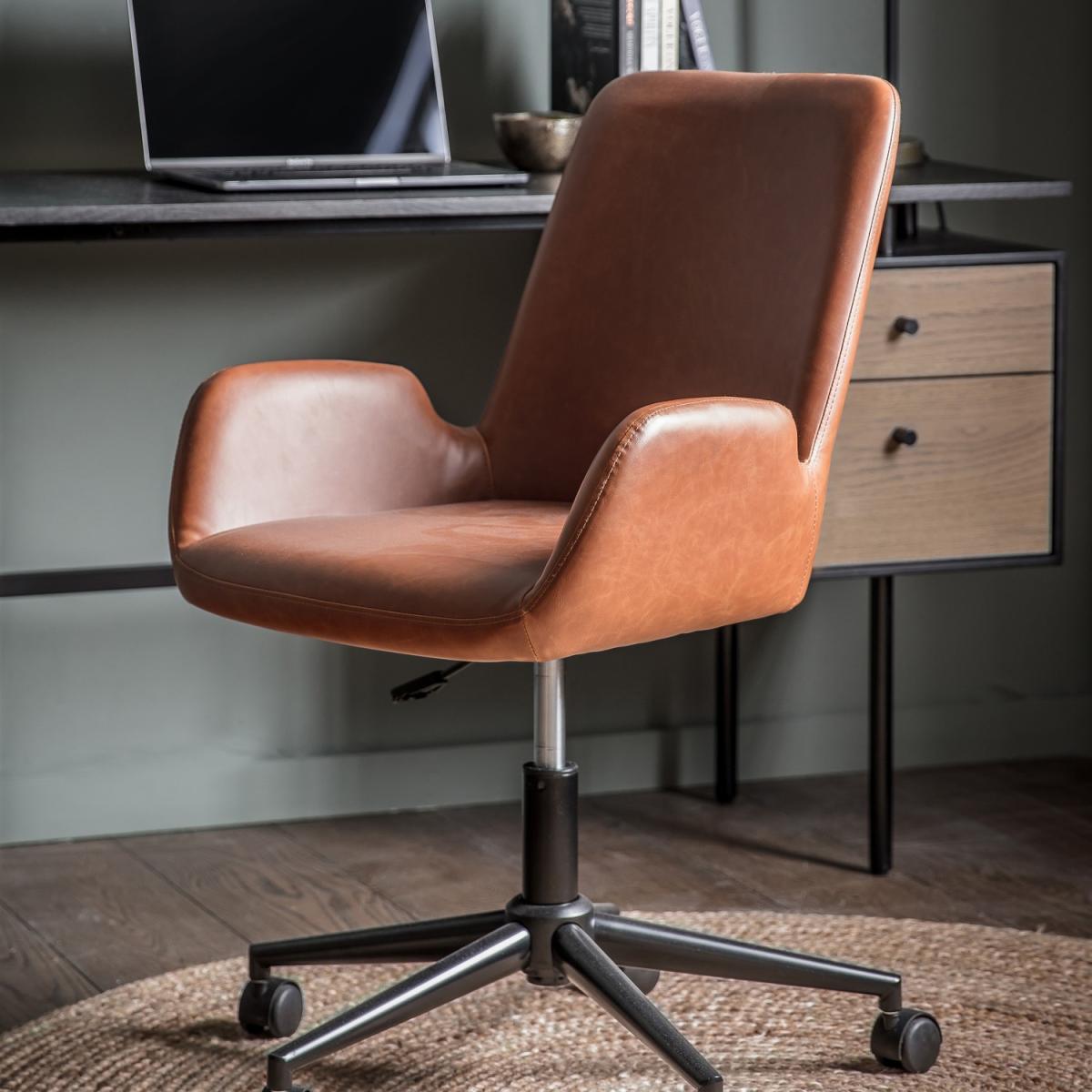Dimensions H82-92 x W57 x D58 cm. This luxurious Faraday swivel chair is sure to enhance the look of any home office or study. Upholstered in brown faux leather and contrasting black legs it’s versatile enough to coordinate with your existing furniture. This chair is also very practical with its 360-degree swivel and gas lift mechanism to adjust the seat height. Features. Brown faux leather Sturdy black legs. Gas lift mechanism360-degree swivel. On trend design Assembly required..