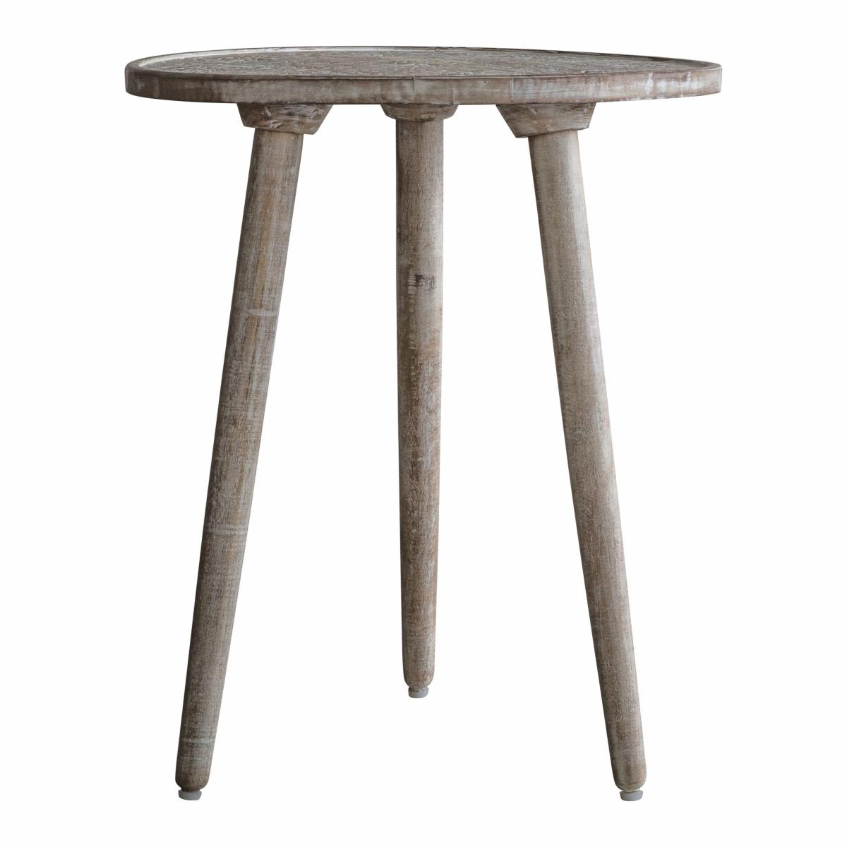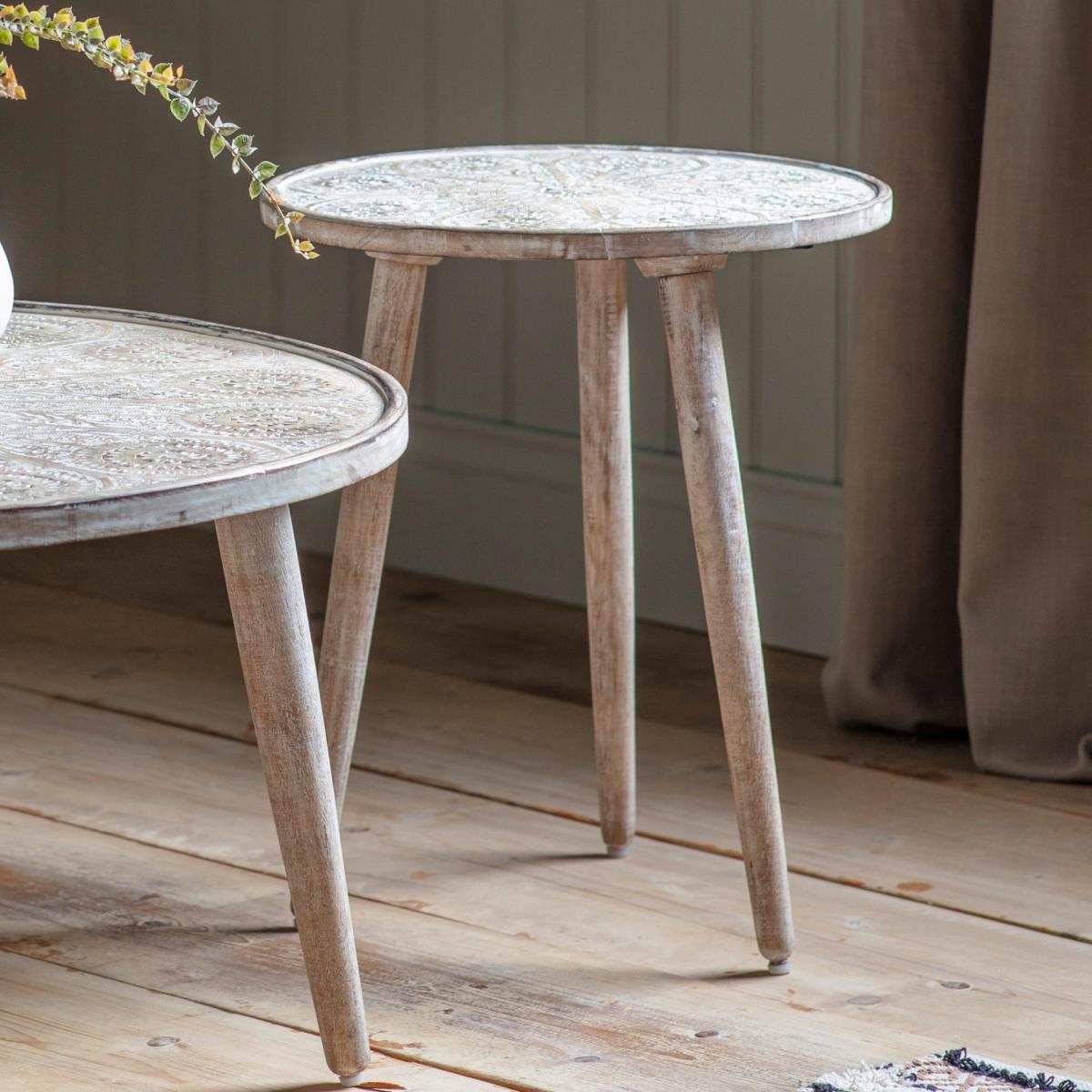 The hand-carving on the top of the Agra Side Table adds intricate detail to the design and is finished in a soft natural tone with a white wash to highlight the detail. The carving is incredibly delicate and shallow, so glasses and ornaments can still stand safely on it. The top is paired with hand-turned tapered legs, to give a stylish piece for the ultimate in Bohemian style. A matching coffee table is available, and both are also offered in a grey copper finish.