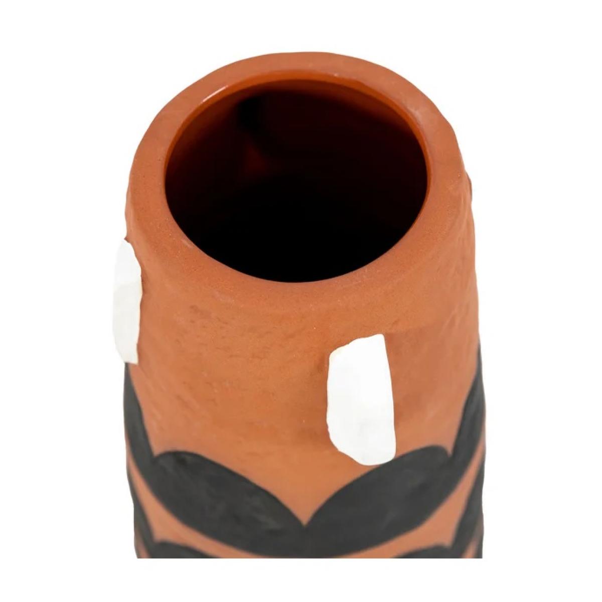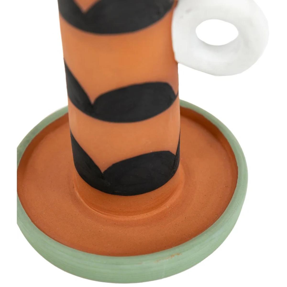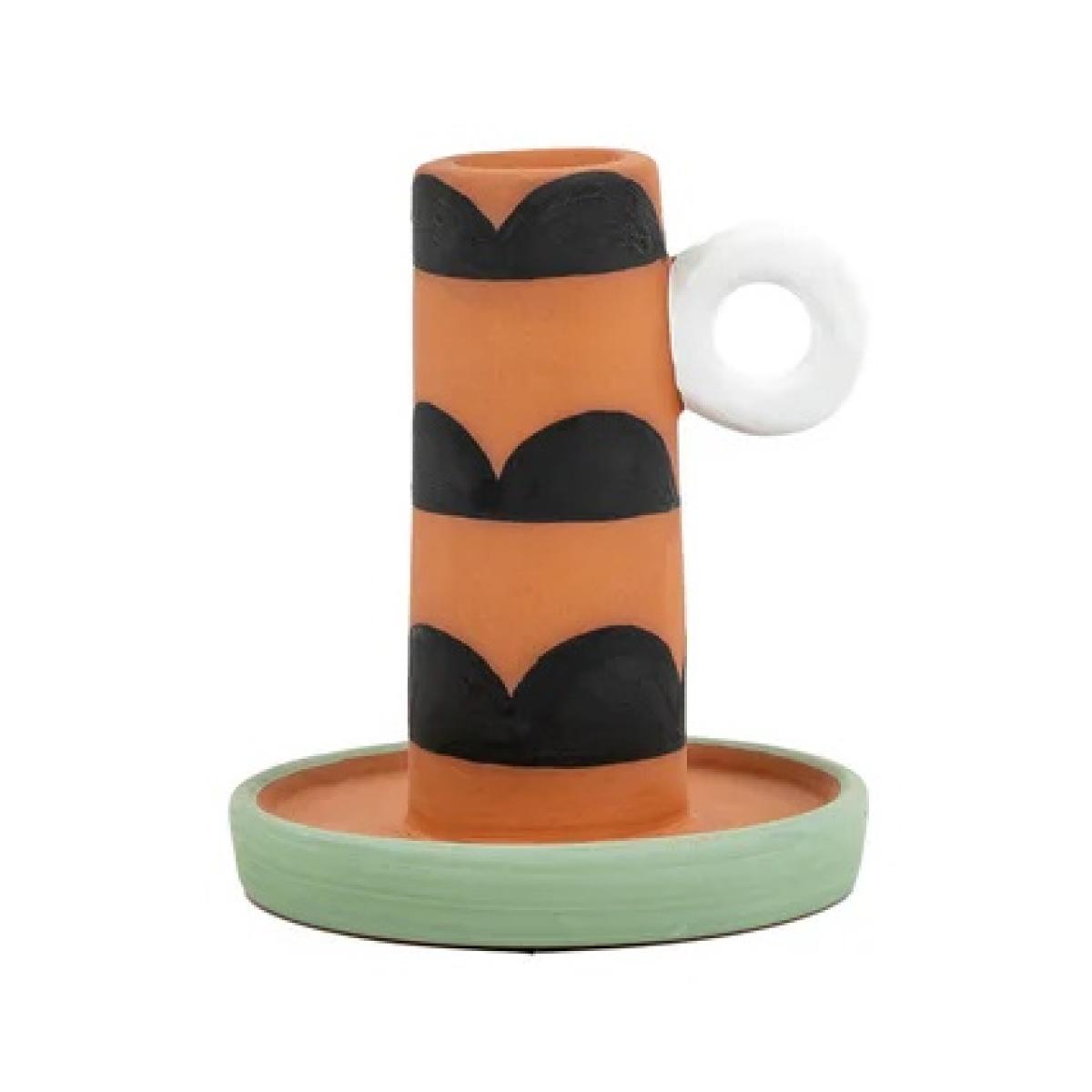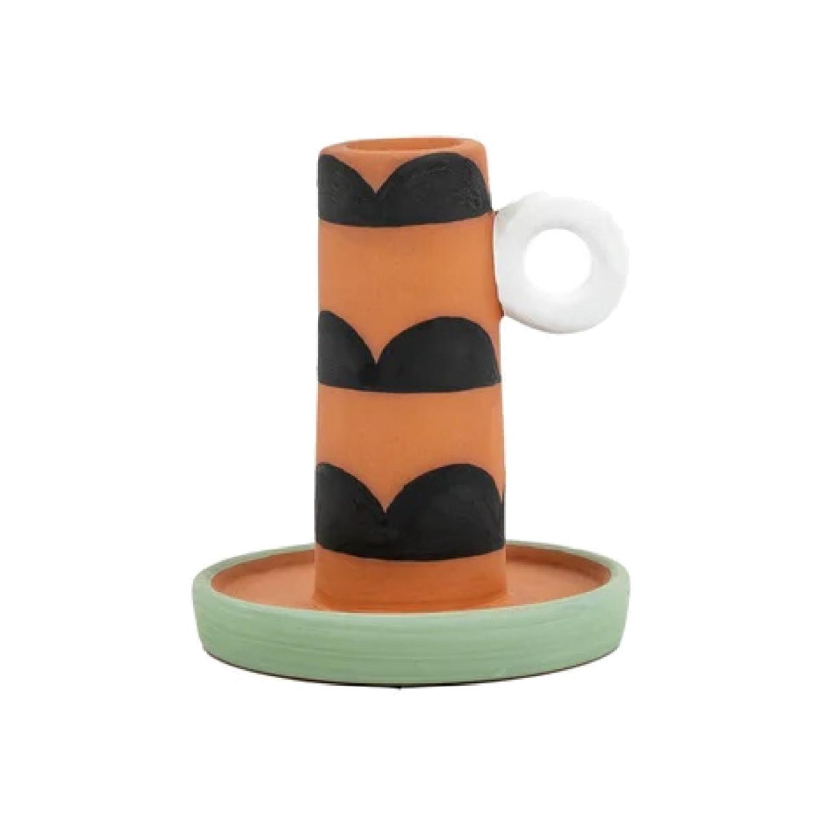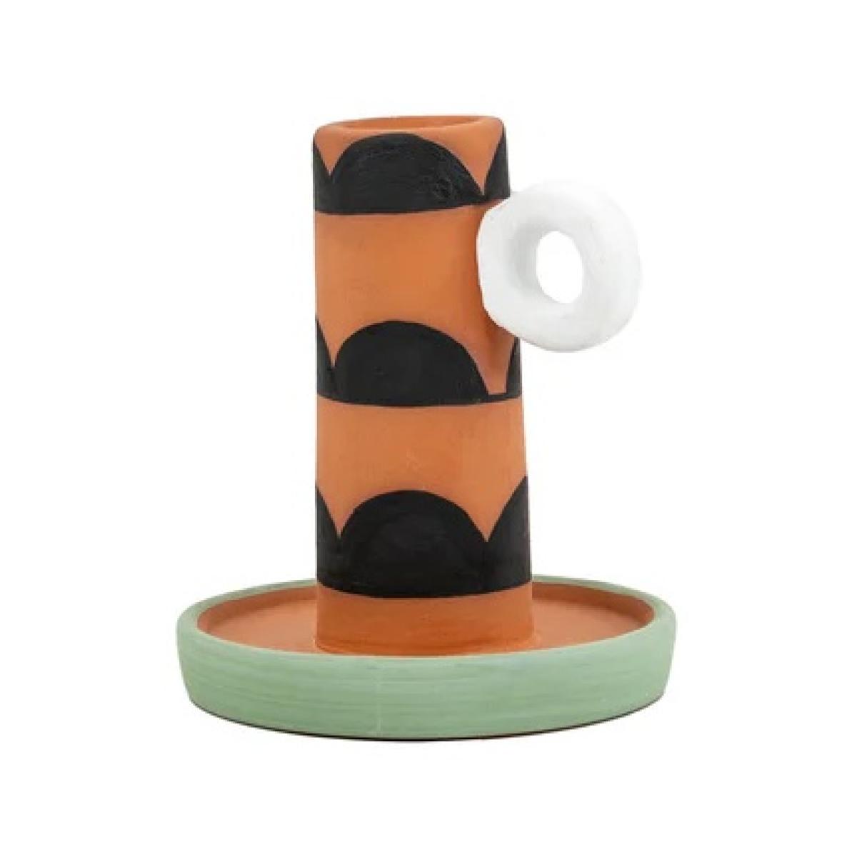 A modern update on a classic, this candlestick's quirky bold pattern and simple shape will add a contemporary touch to any room. Used individually or with the coordinating pieces, this is a stand out piece. Width 85mm Depth 85mm Height 95mm Material - Terracotta