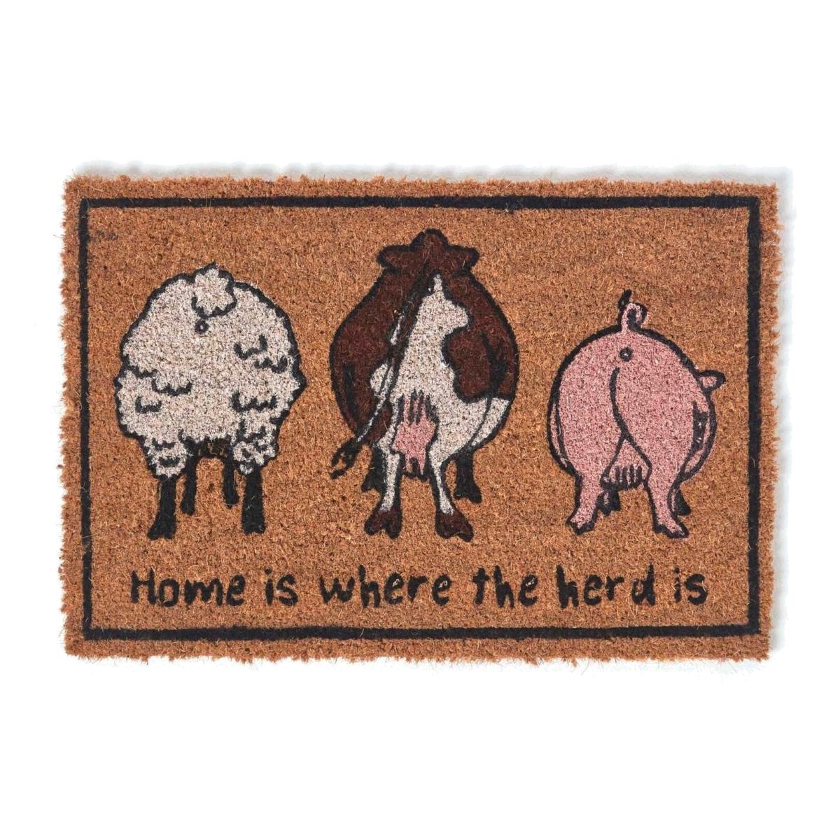 Classic shaped door mat featuring three farm animals a sheep, a cow and a pig with the slogan Home is where the herd is. Measuring L 40.4 x W 61cm, this flat rectangle shaped, patterned door mat is perfect for adding character to entrance halls, hall ways or back patio areas. Made from coir and PVC, the mat will greet guests whenever they visit. Ideal for keeping shoes clean when entering the home, to ensure you carpets remain tidy. Backed with a strong PVC plastic non-slip backing, this sturdy doormat can be used on carpets, lino, laminate or wooden floors and is perfect for animal and farm lovers. Part of Homescapes range of home and garden accessories.