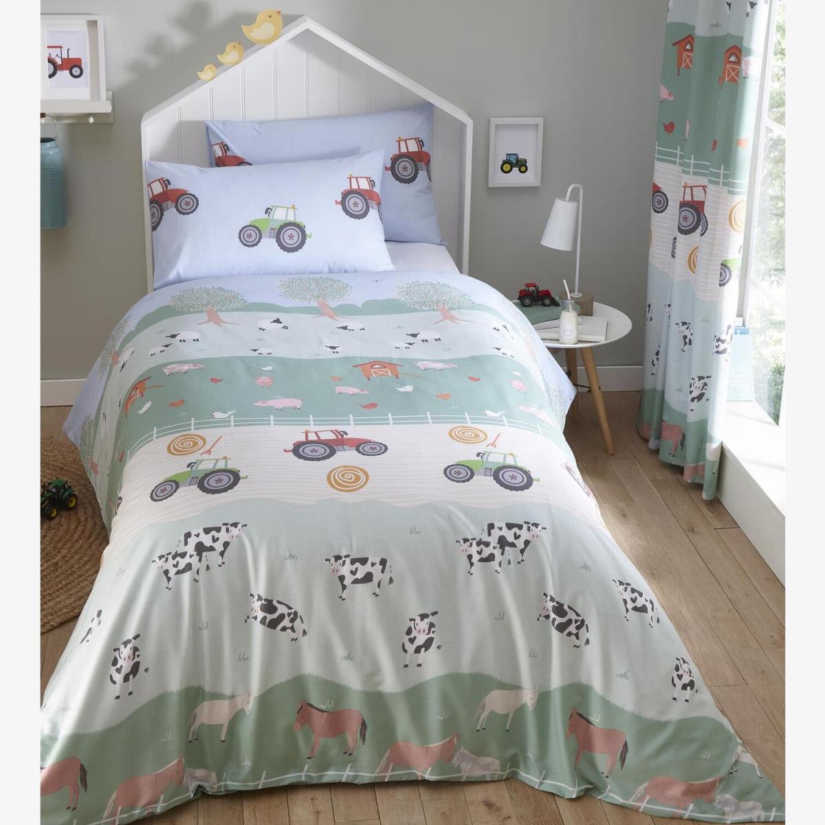 Bring the fun of the farm to your childs bedroom with the farm friends duvet cover set. This duvet cover set features illustrations of animals and tractors that make up this colourful design. Materials 52 Polyester 48 Cotton. Care instructions Machine washable.