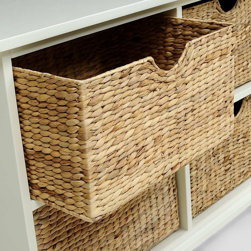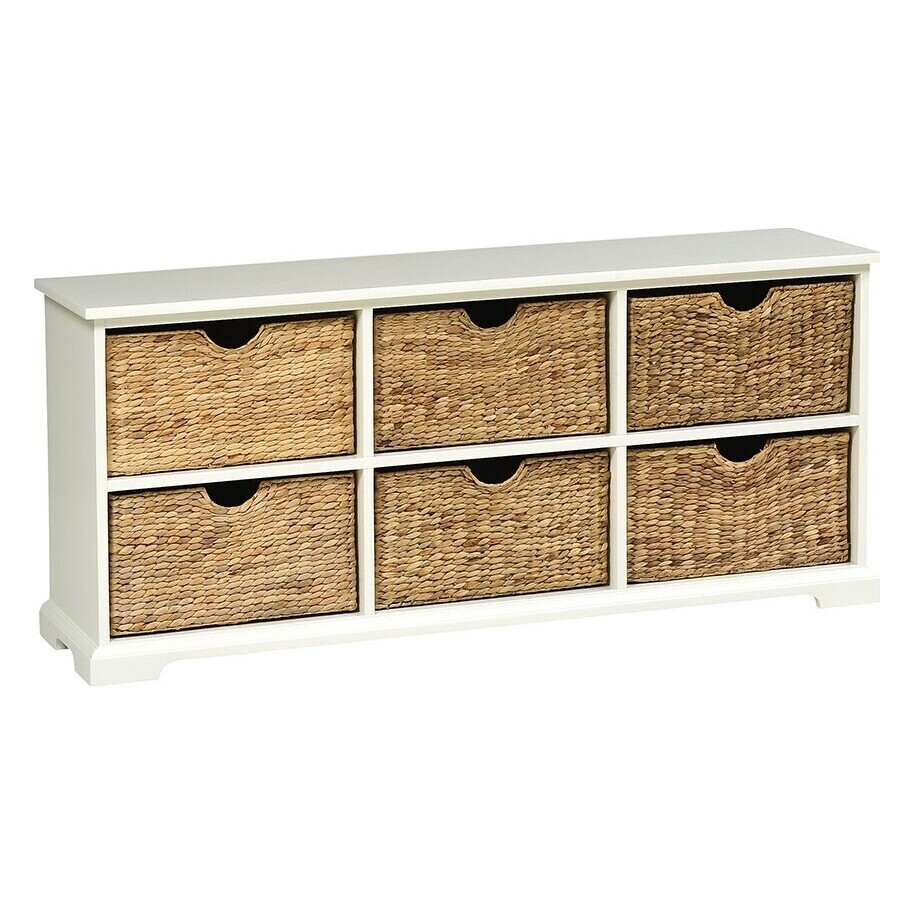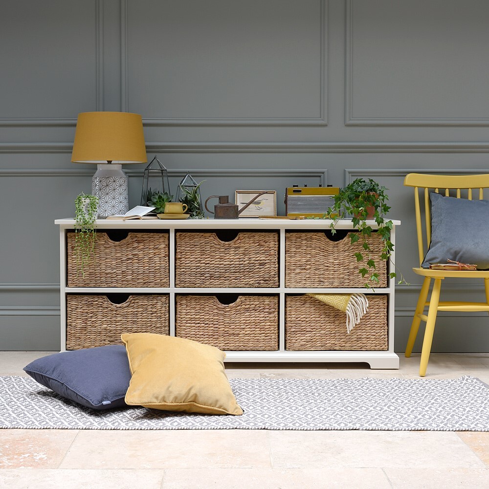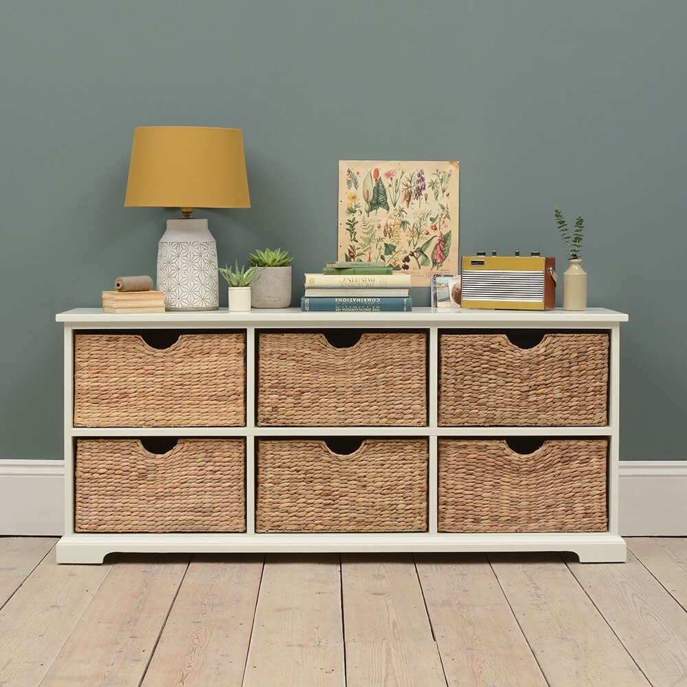 This wonderful piece sets six roomy hand-woven wicker basket drawers in a long, lean pine frame with particleboard tops in a warm ivory finish. At home in every setting from country kitchens and bedrooms to loft-style living spaces. To complement the design, each wicker basket is individually hand crafted, therefore some may differ in construction.