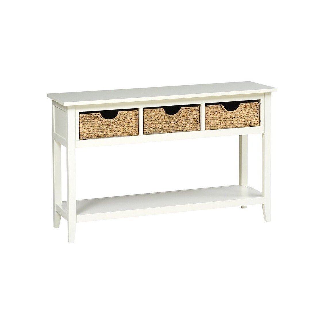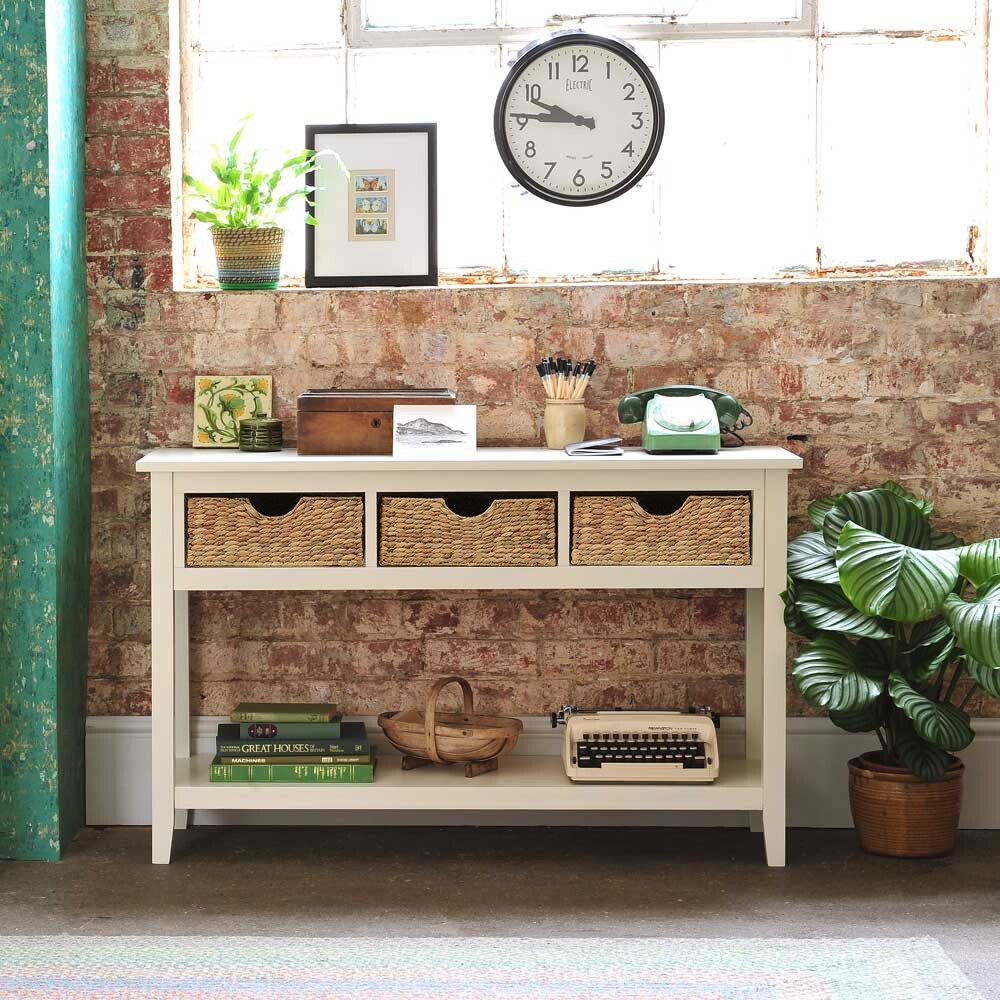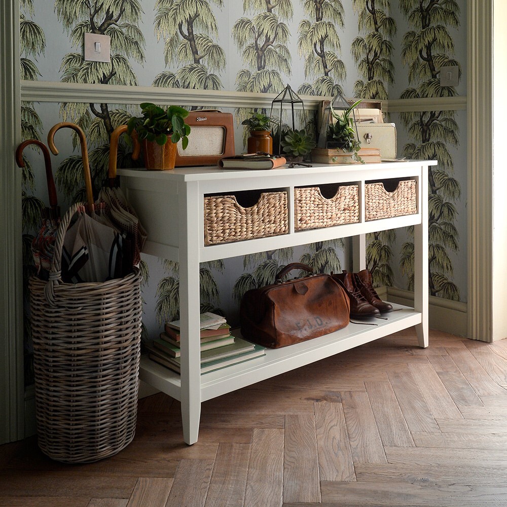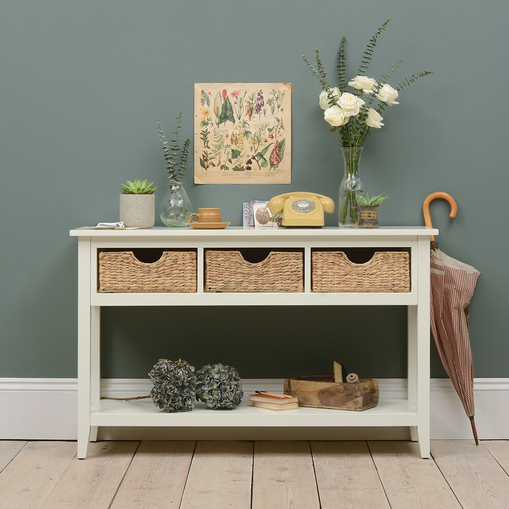 Perfect for a vase of your favourite blooms or the family photographs, this crisp ivory console table will be right at home in your hallway or conservatory. The hand woven wicker baskets add extra storage to ensure all those annoying bits and pieces that otherwise clutter up your worksurfaces can be stowed neatly away.