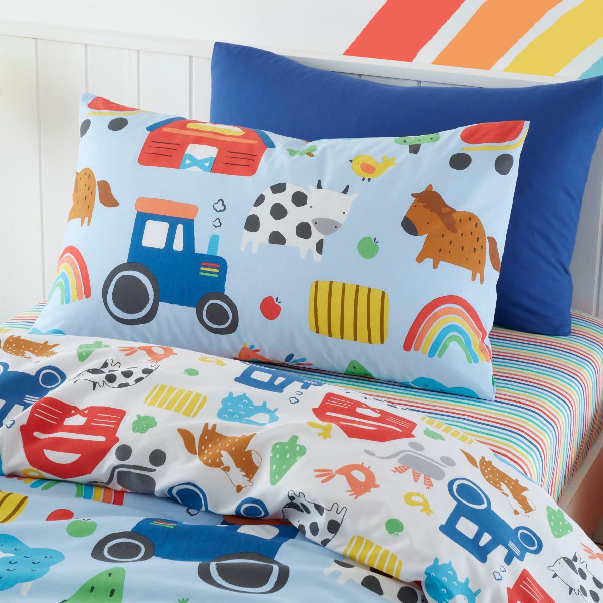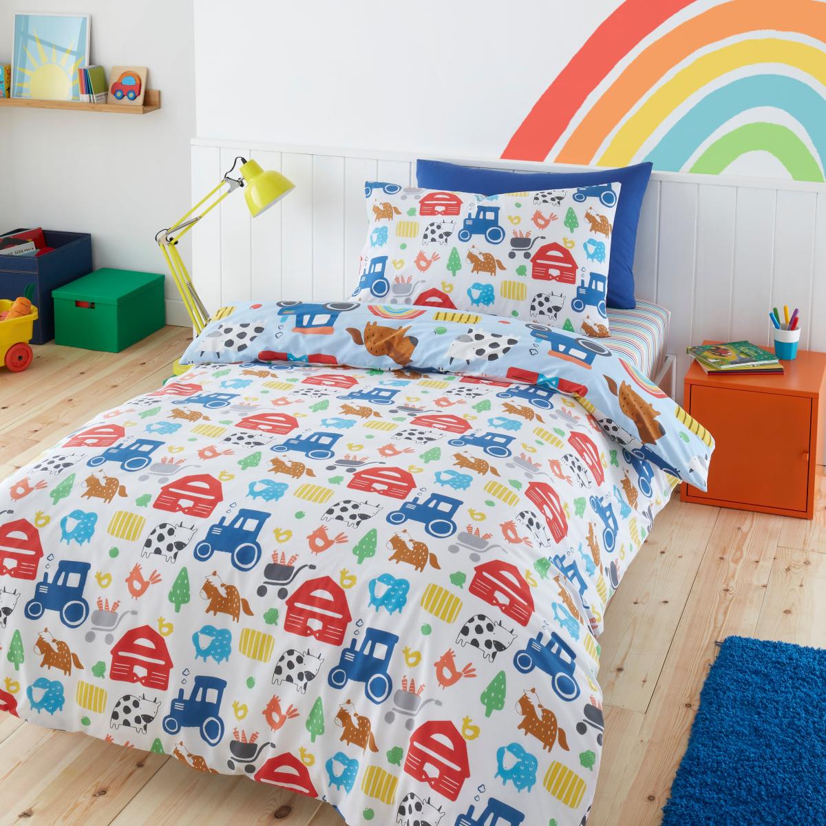 I love this farmyard design for its playful yet vibrant aesthetic-it’s perfect for adding a cheerful focal point to a child's bedroom. The blue tones work well in a variety of interior schemes, especially when paired with neutral or pastel walls, or complemented by other colourful accessories. Practical styling tips include mixing with plain, light-coloured bedding to make the farmyard print stand out, and adding texture with knitted throws or cushions in coordinating colours. It’s also a great choice if you want a lively atmosphere without overwhelming the space, making it ideal for both modern or traditional interiors.