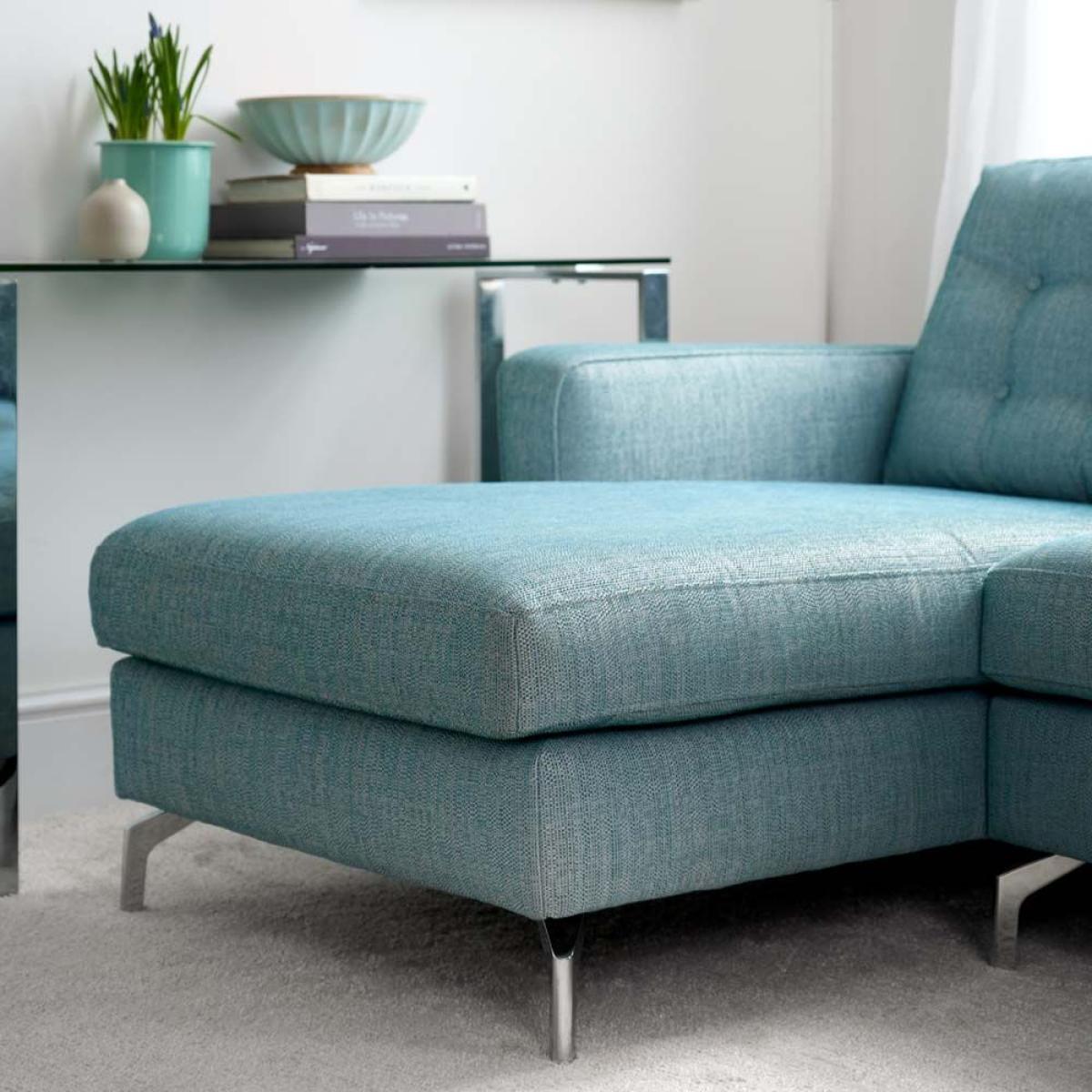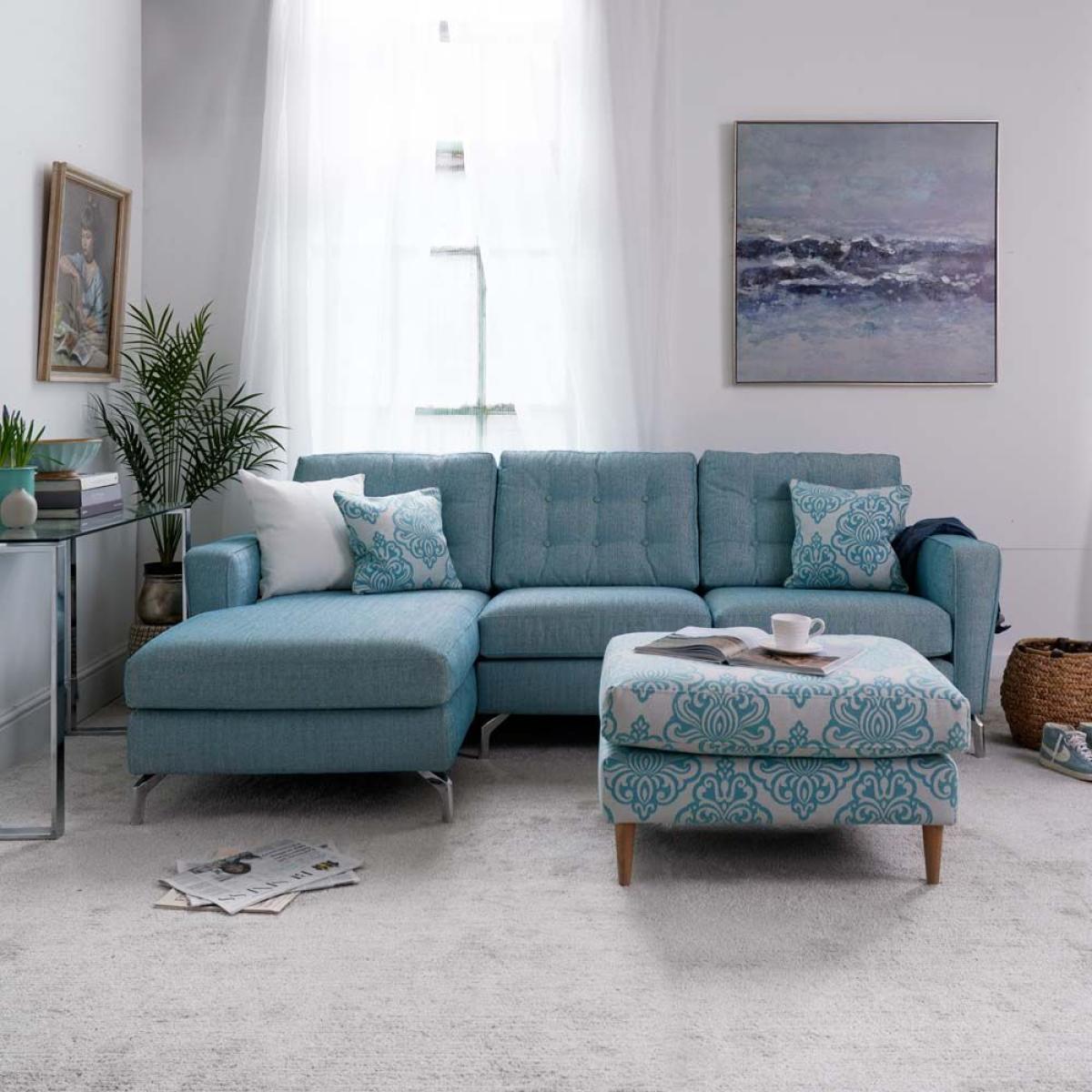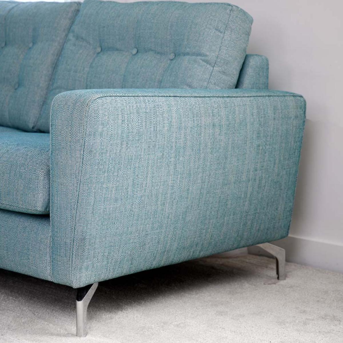 The Faro Corner Sofa is a great addition to the home. It's generous chaise section is perfect for relaxing with your feet up. The modern lines of the Faro Corner Sofa make this sofa right at home in a more contemporary setting, however the buttoned back cushions offer a nod to the traditional to allow this sofa to suit many home styles. Available here with chrome feet and in this stunning blue textured fabric. More fabric options coming soon.