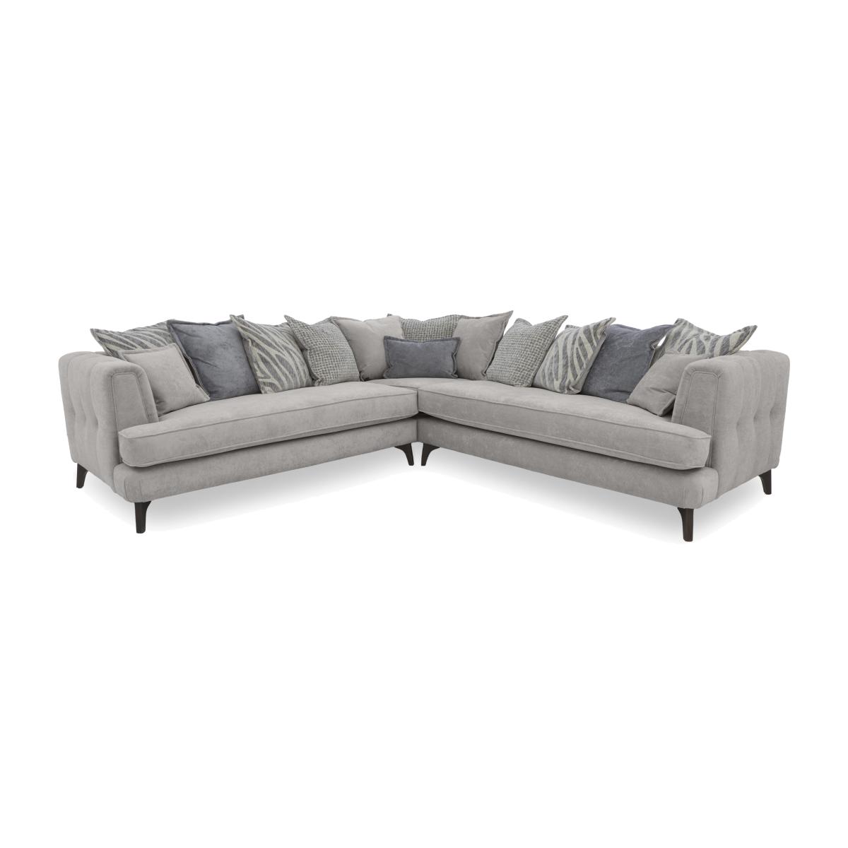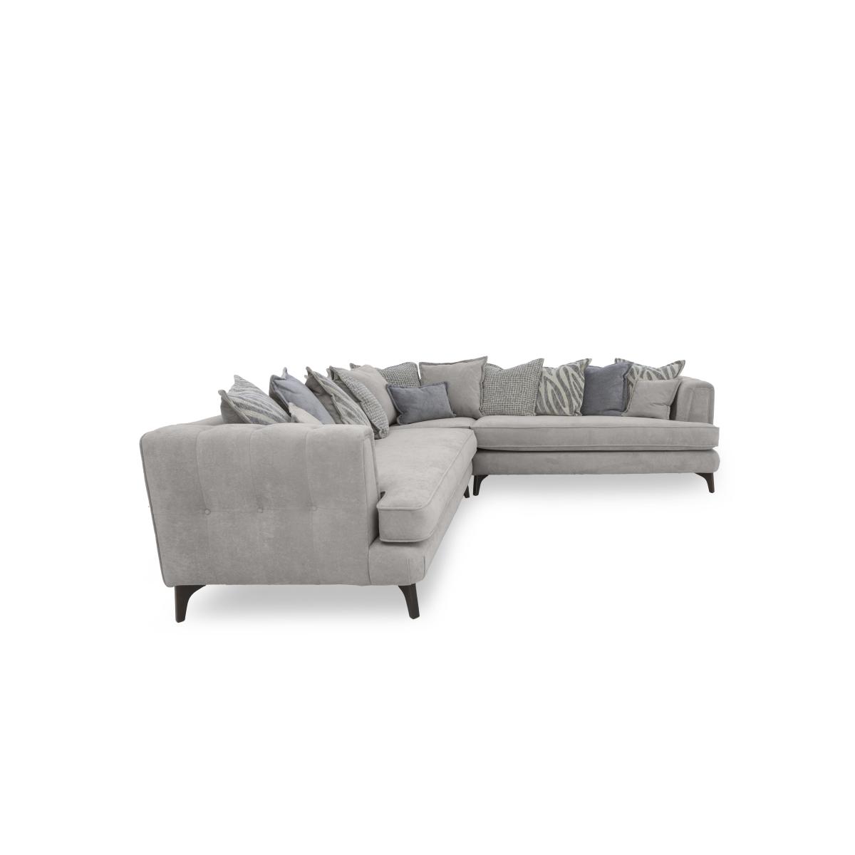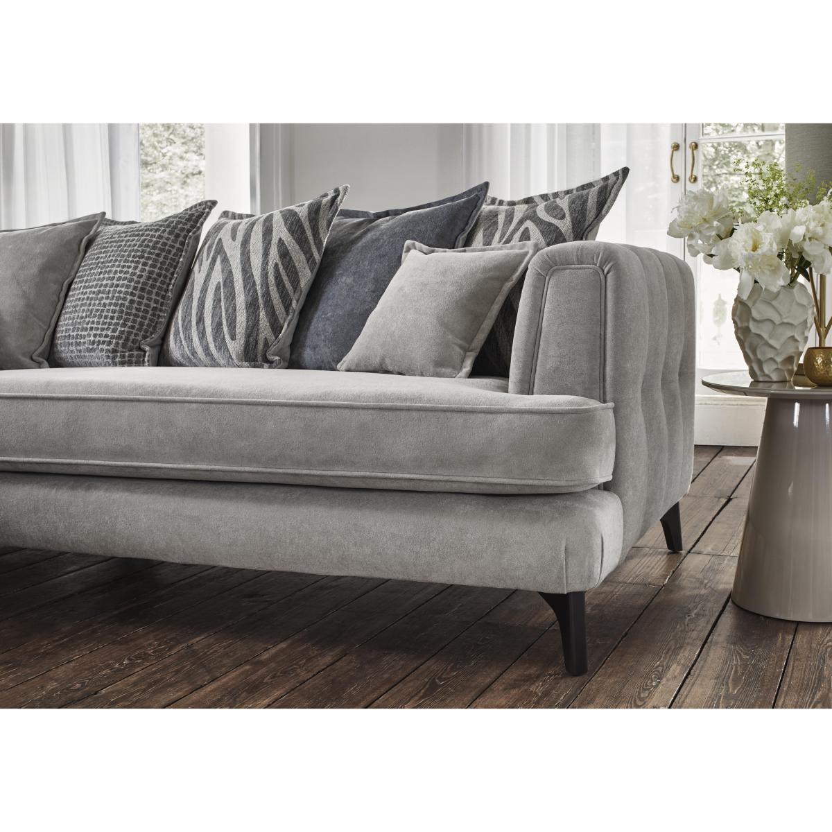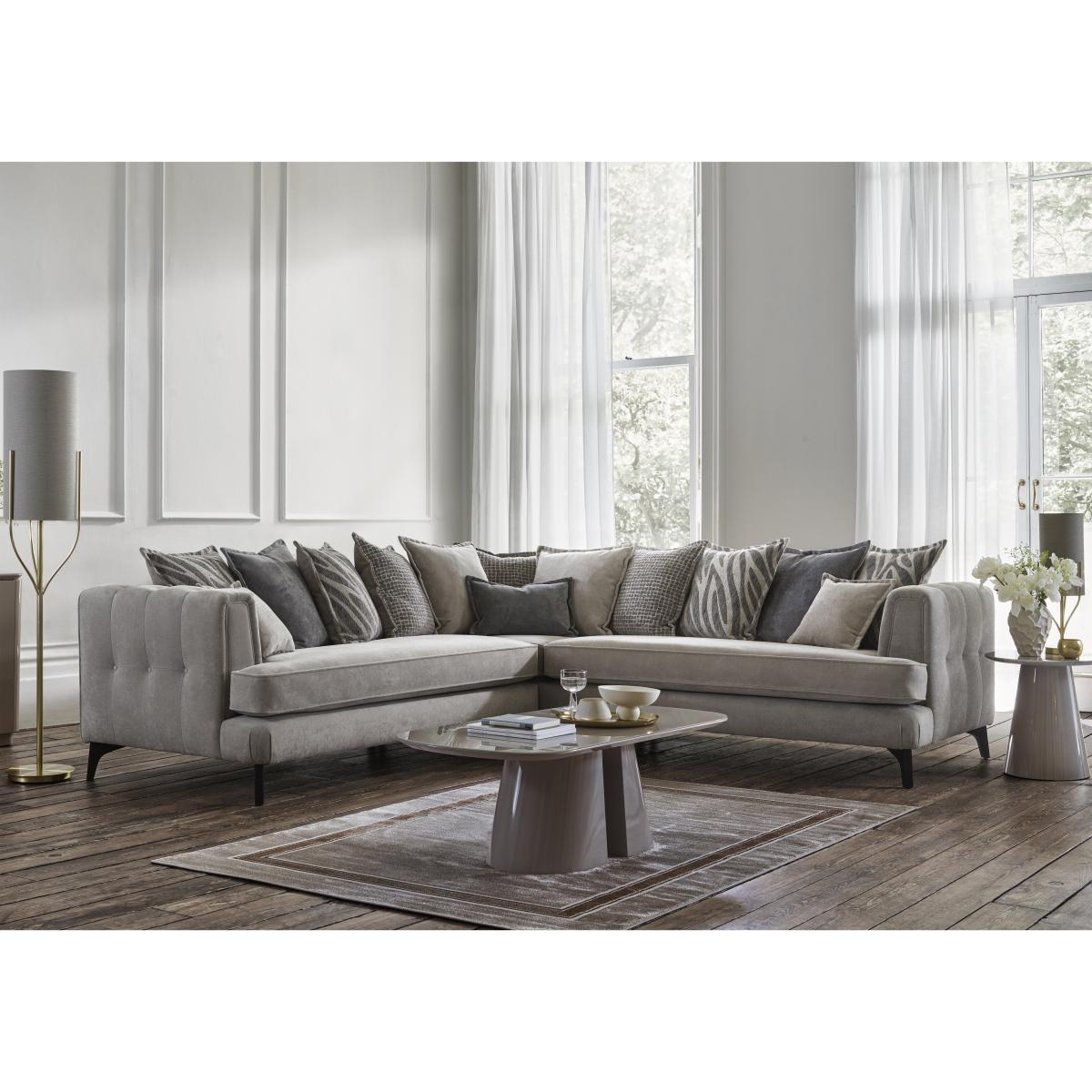 If you’re looking for comfort, may we introduce you to our Farrah collection? Generous in both size and sumptuousness, this range is no slouch on the style front either. Available in both classic back and scatter back styles, Farrah has Ultimate Flex plumpness-guaranteed seat cushions that ensure your sofa will feel every bit as luxurious as it looks. There’s a glam edge to Farrah in the curve of the arm and the understated buttoning motif that’s echoed on the back cushions of every classic back sofa. From a large corner sofa to accent cushions, this collection brings home well-crafted style and comfort. Made by hand in the UK exclusively for Furniture Village. Dial up the relaxation with this large and sumptuous scatter back corner sofa. A fabulous combination of bench seating and feather-filled scatters, it also showcases elegant style details. Why you'll love it Fabulous Farrah features superb modern comfort and glam details. High-performance Ultimate Flex seat cushioning with our 5-year plumpness guarantee. This scatter back corner sofa has bench-style seating for more relaxed lounging. 14 feather-filled back cushions – 11 large scatters, 2 small scatters and a bolster. With reversible seat and scatter back cushions, this sofa lasts twice as long. Modern button detail on back cushions and outer arms. Choice of light or dark wood feet. Wide choice of fabric upholstery options. Also available as a classic back sofa. Additional feather-filled bolster and scatter cushions are available separately. Handmade in the UK exclusively for Furniture Village. This large scatter back corner sofa is part of our Farrah range. What you need to know Medium comfort level. Seat suspension: sprung. Seat cushioning: Ultimate. Flex. Cushioning is reversible. Back support: elasticated webbing. Scatter back cushions: feather. Back and feet are removable for easier access. To maintain cushion shape and fullness, be sure to plump daily. Unzip back cushions halfway prior to plumping to allow air to circulate. Rotate seat cushions for more even wear. Some fabrics can show wear on areas of more use or in direct sunlight. Clean regularly using a soft brush or vacuum with the curtain attachment. Deal with any spills promptly. Professional cleaning advised for oil- and grease-based stains. Please read our upholstery care guide for more advice. Item code: FARRCLSB--002