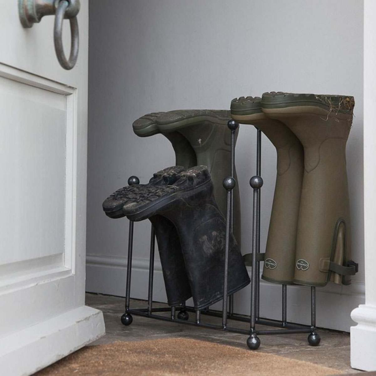 Made from sturdy steel with a clear laminate lacquer, the Farringdon welly rack is the ideal place to store your wellies after those wet, winter family walks. Holds up to six pairs of boots. H55 x W54 x D20cm. Back rods: H52cm. Front rods: H37cm. Gap between rods: W9cm. Made from steel. Matte black clear laminate lacquer finish. Holds up to six boots. For indoor use only.